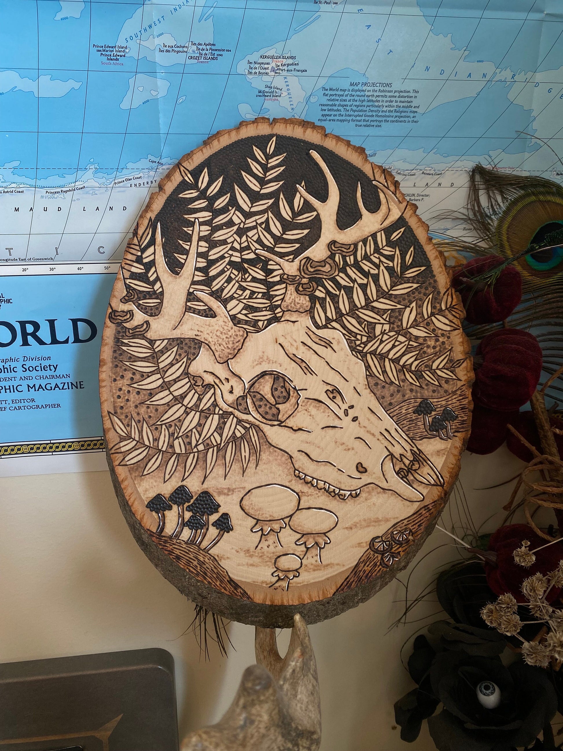 This piece features a buck skull on the forest floor among the ferns and mushrooms. This is an original work thought out, drawn up, and burned by me!