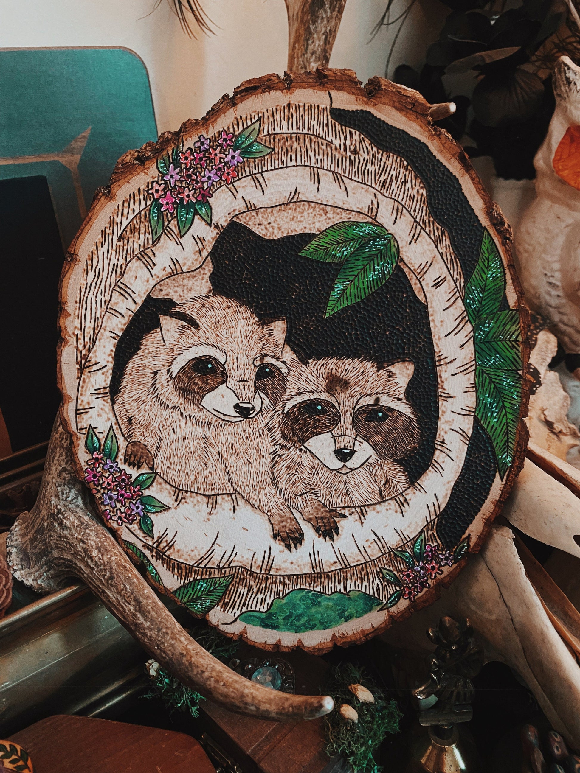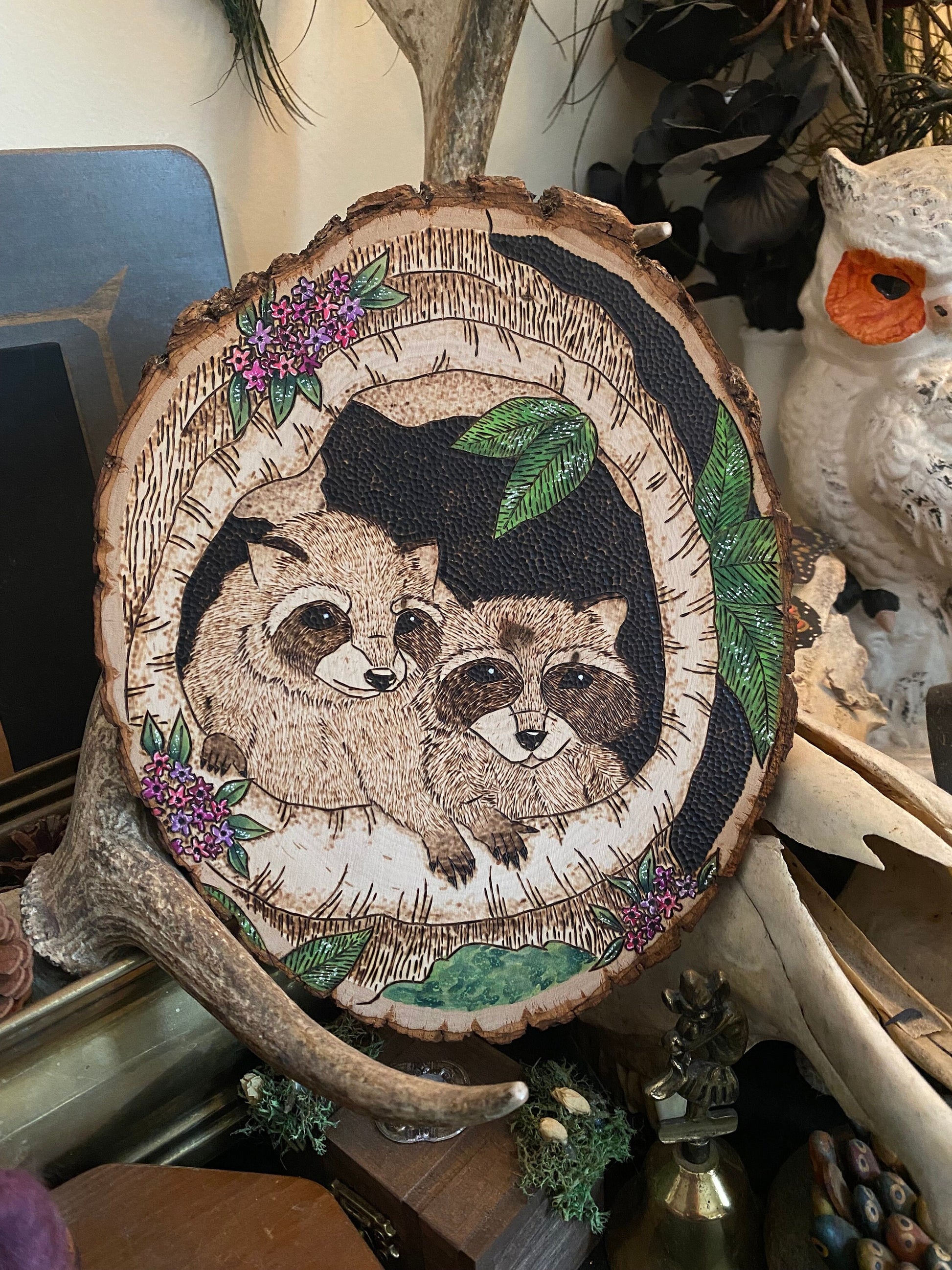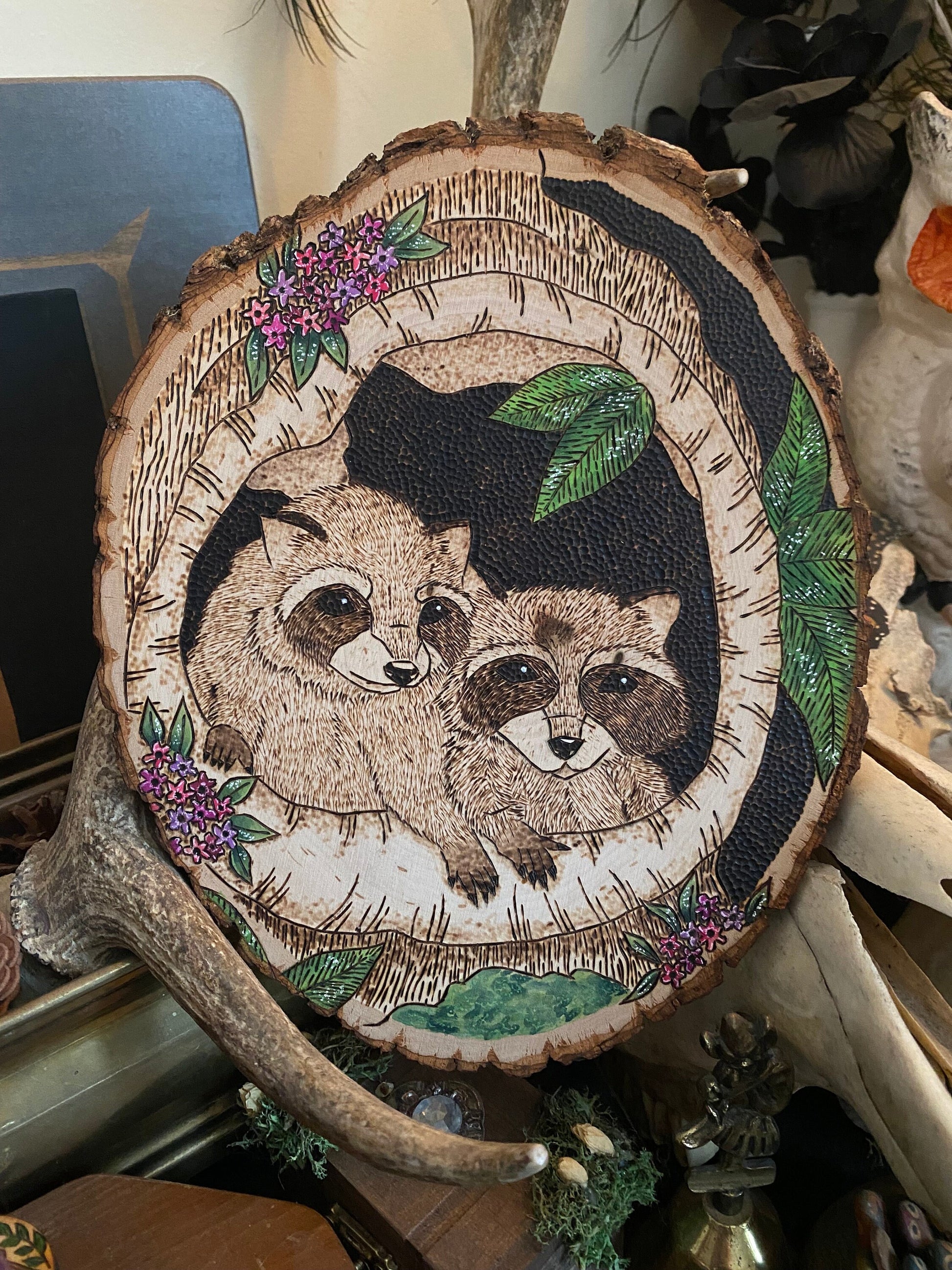 This piece features two raccoon kits peaking out of a hole in a tree surrounded by spring blooms. This is an original work drawn up, and burned by me!