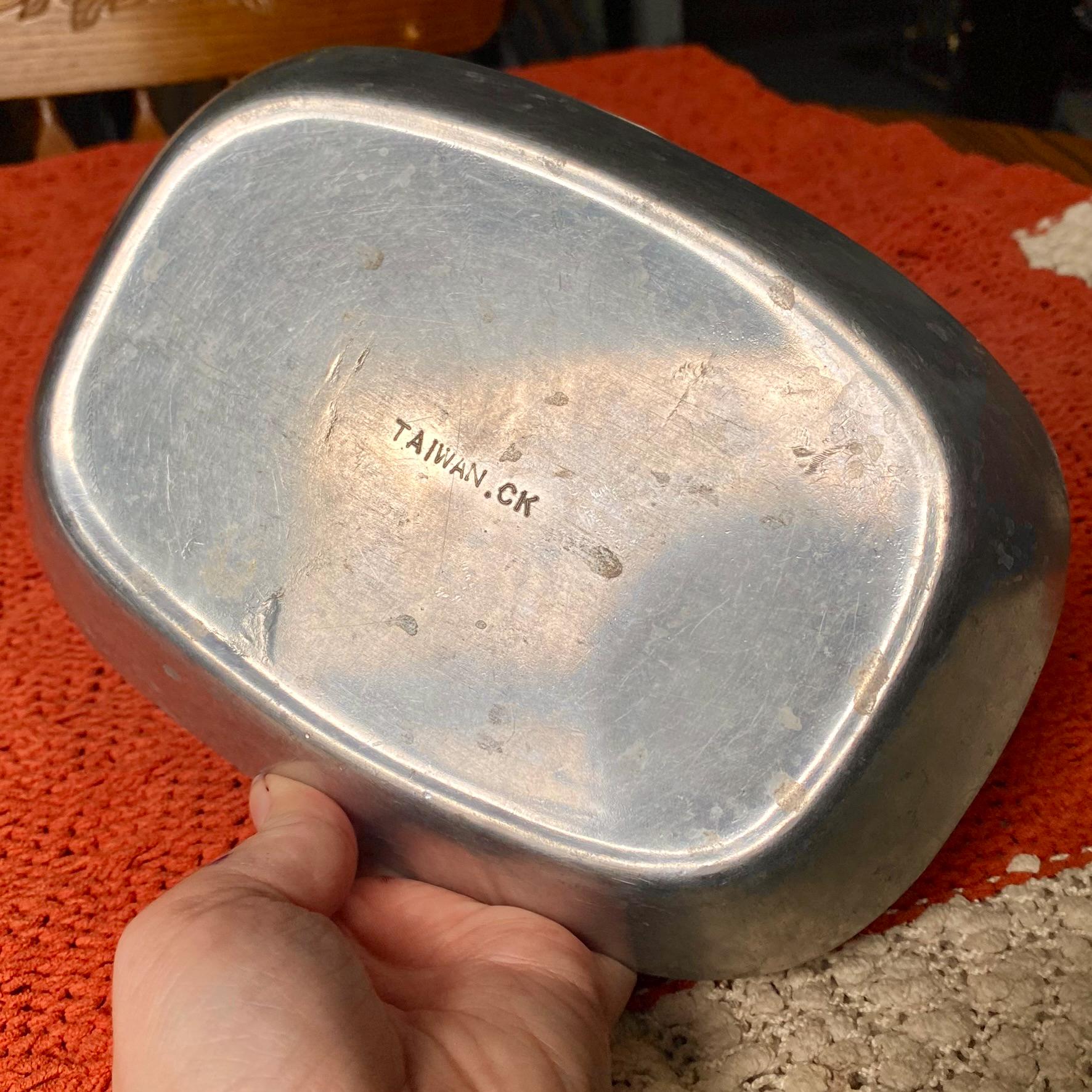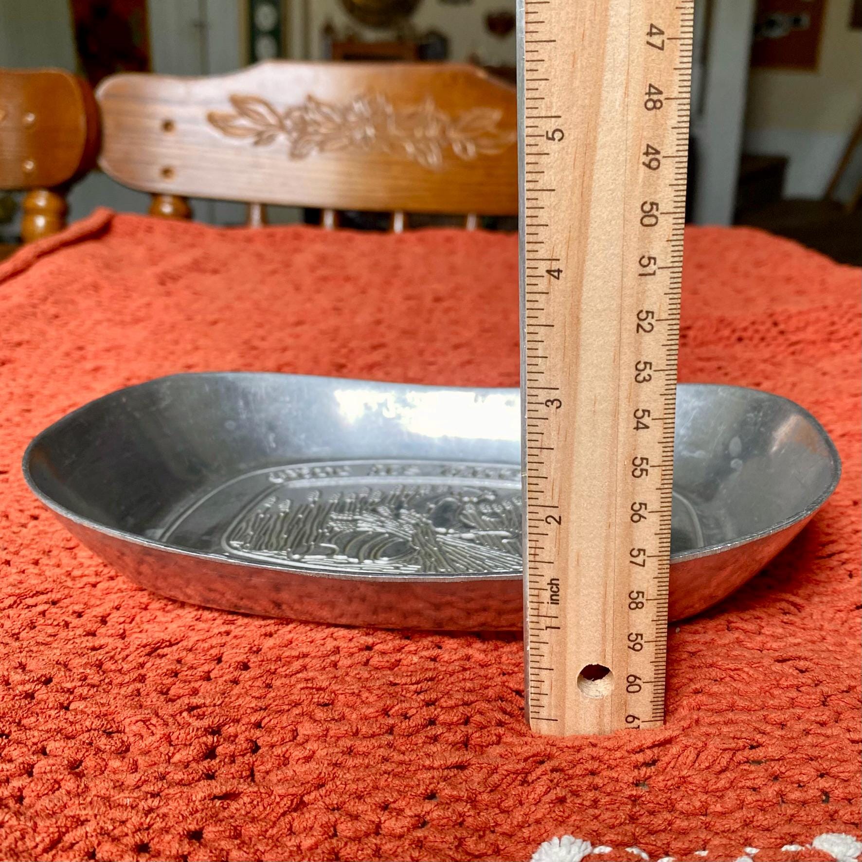This product is an antique pewter platter tray from the 1960s with the inscription "Give Us This Day Our Daily Bread." The tray is made of pewter, a durable and classic metal that is perfect for serving or displaying food items. The historical and collectible nature of the tray adds a unique and nostalgic touch to any home decor or dining setting.