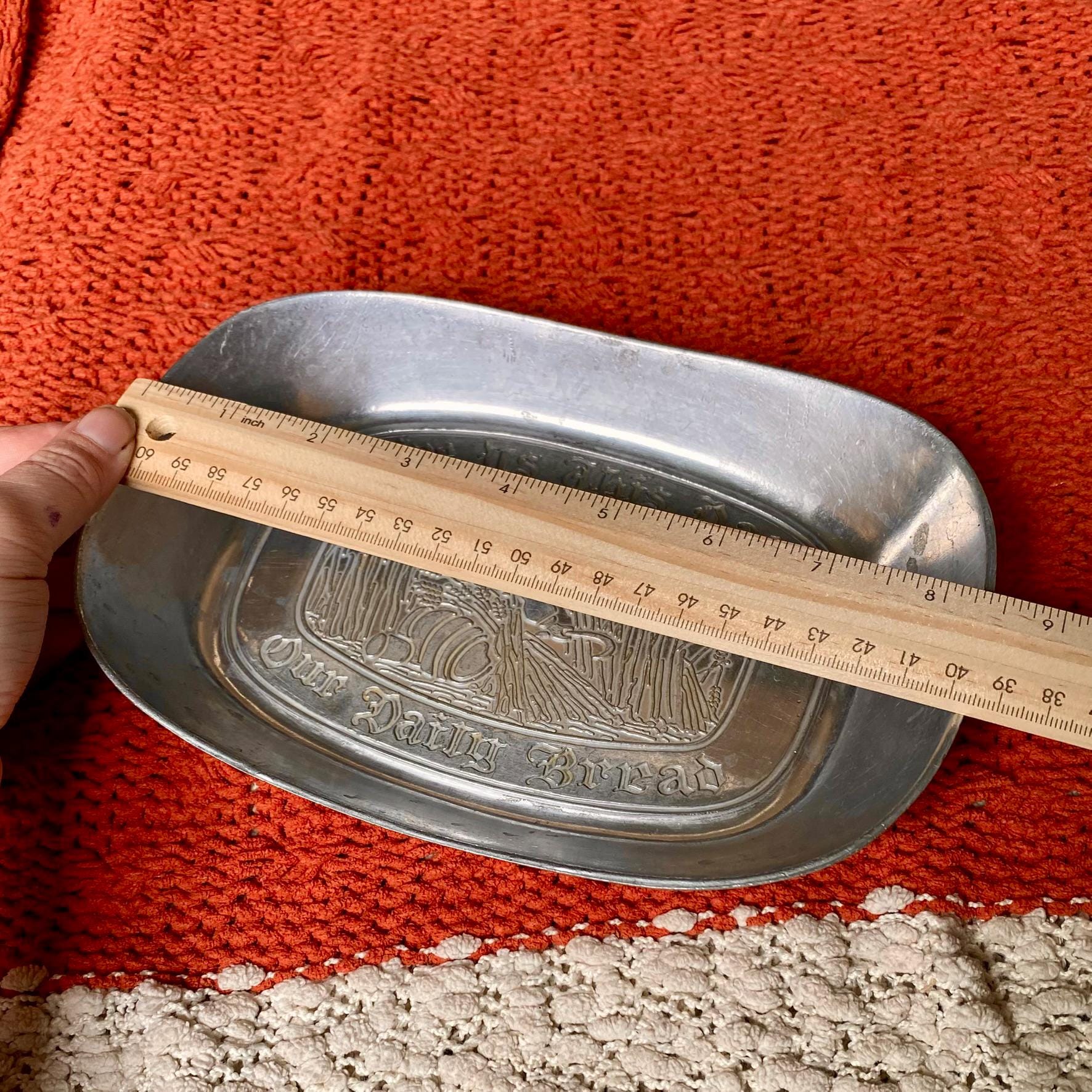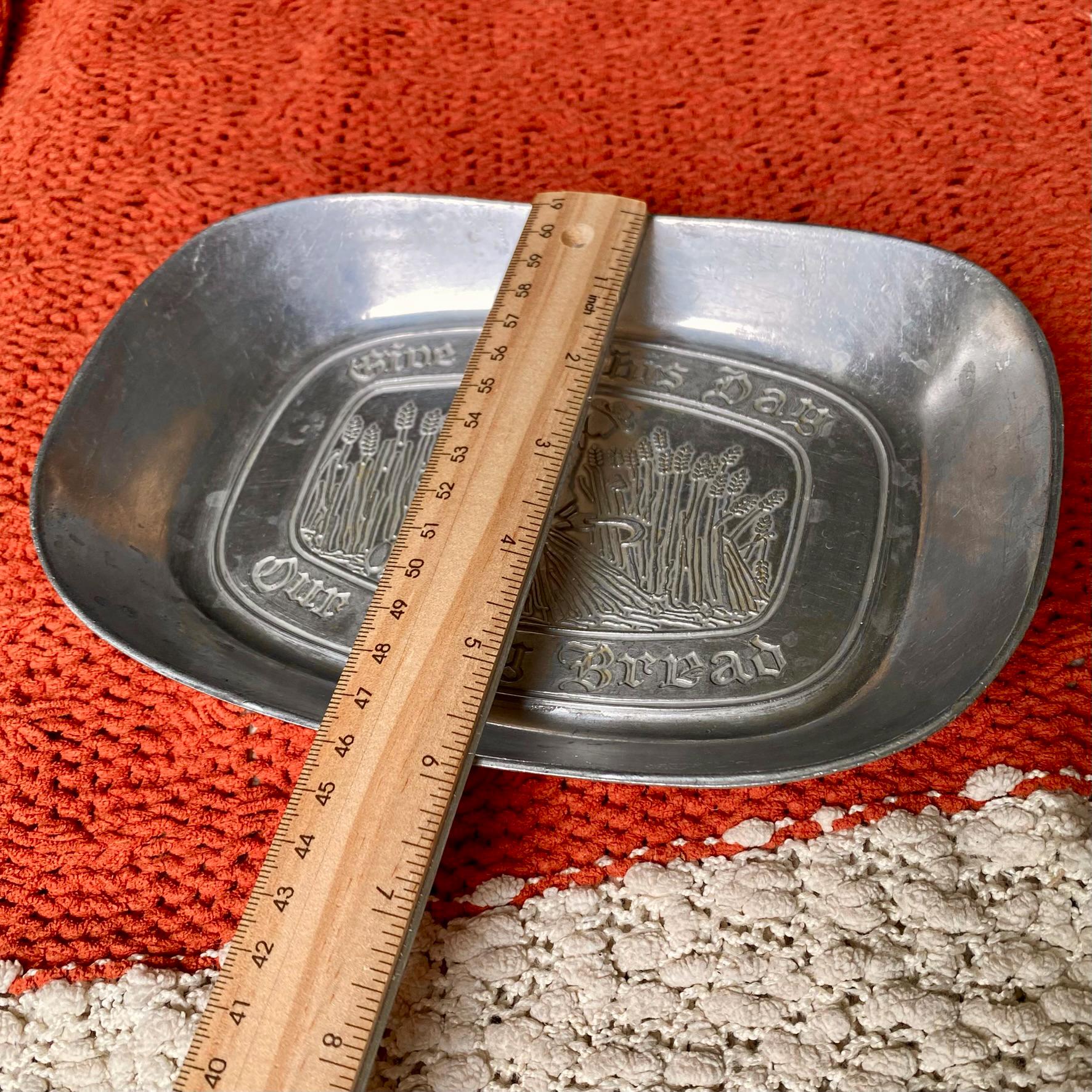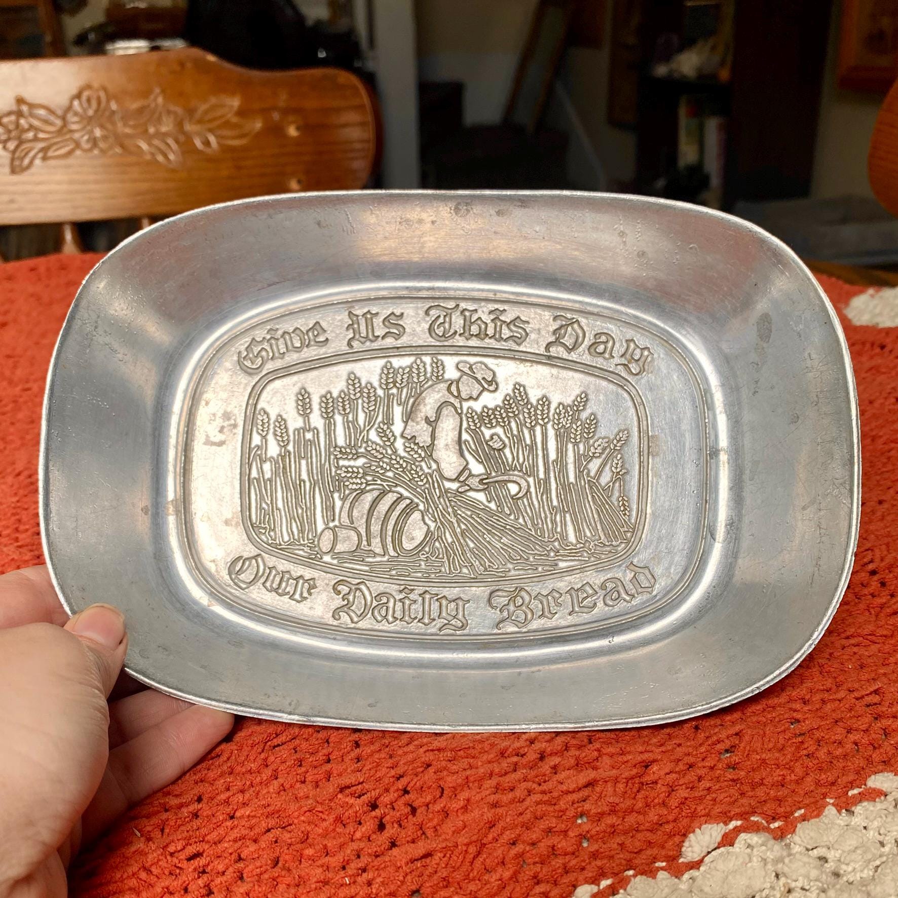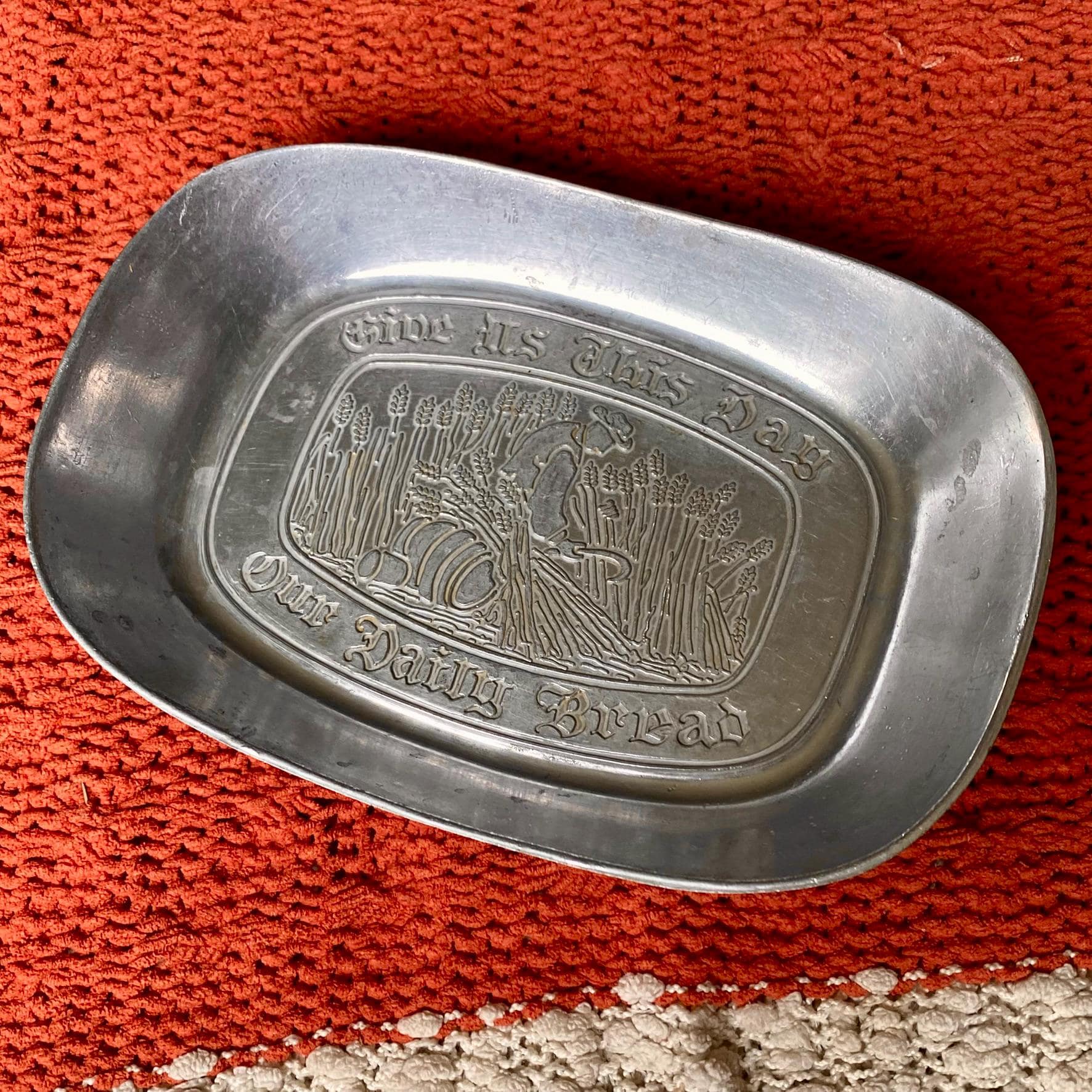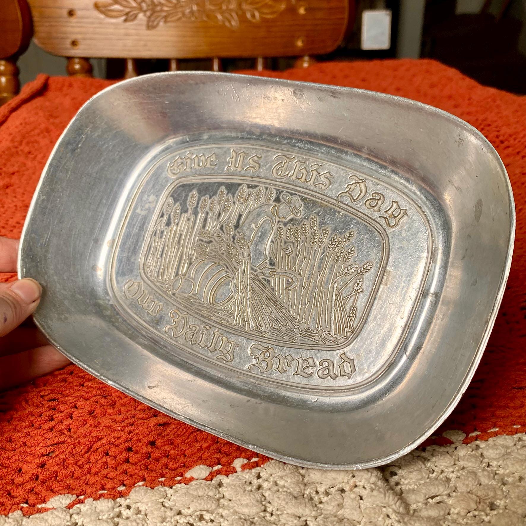 Antique 1960’s Pewter Platter Tray “Give Us This Day Our Daily Bread”