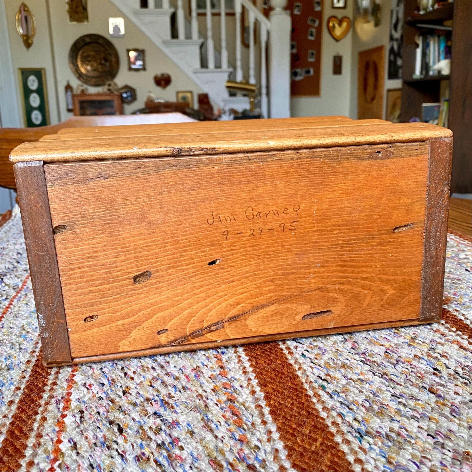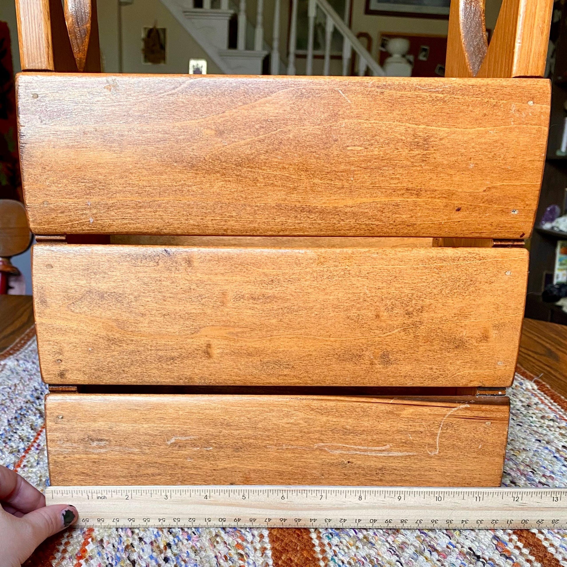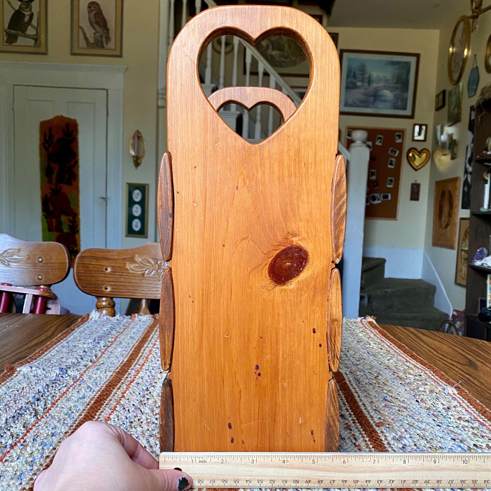 This handmade vintage solid wood magazine holder features heart cut outs, adding a unique and charming touch to your space. With a free-standing design, this original piece is easy to use and requires no tools for assembly. Crafted in the United States from wood, this magazine rack is both functional and stylish, making it a perfect addition to any living or reading space. Clean with a dry cloth to maintain its quality and enjoy the rustic beauty of this handmade construction.