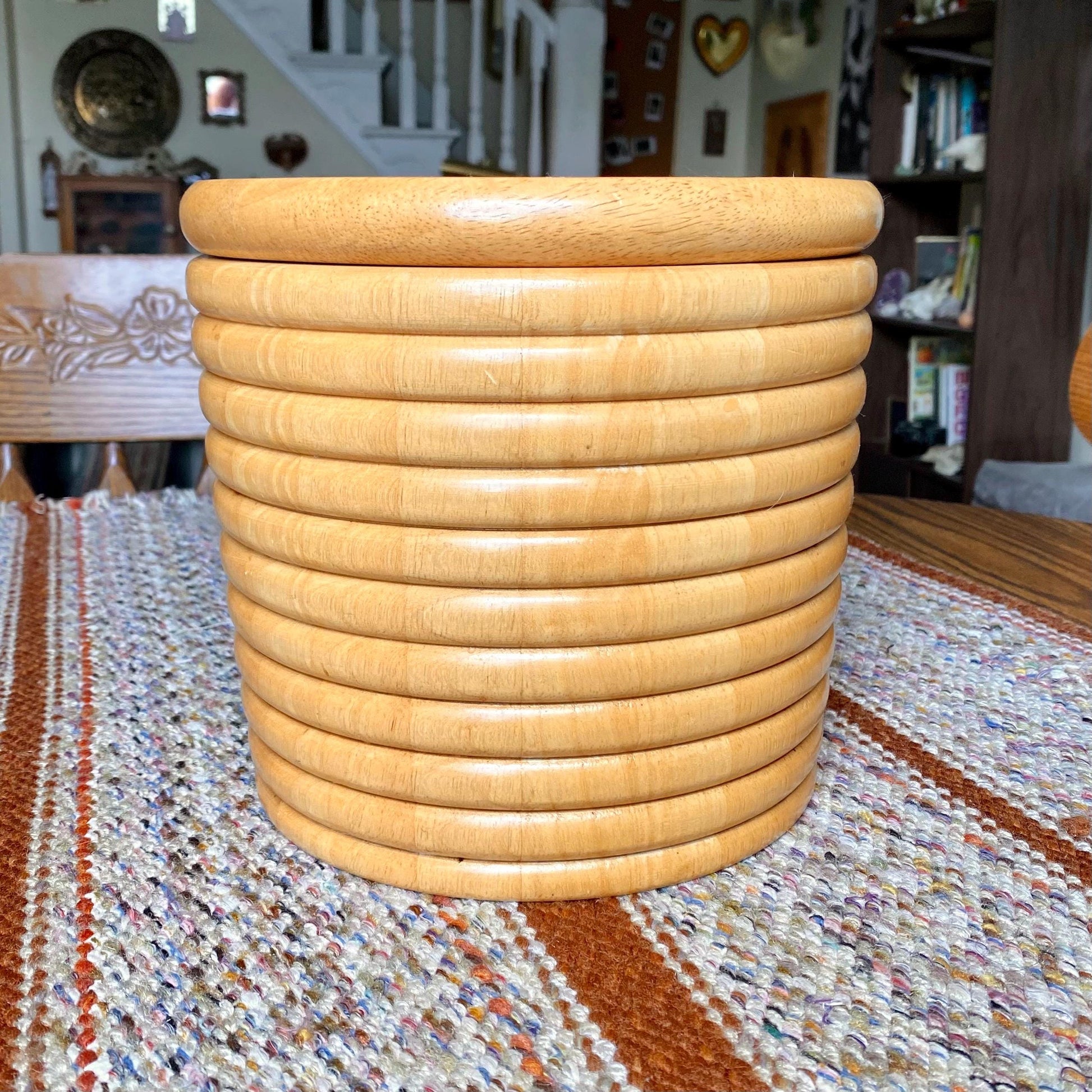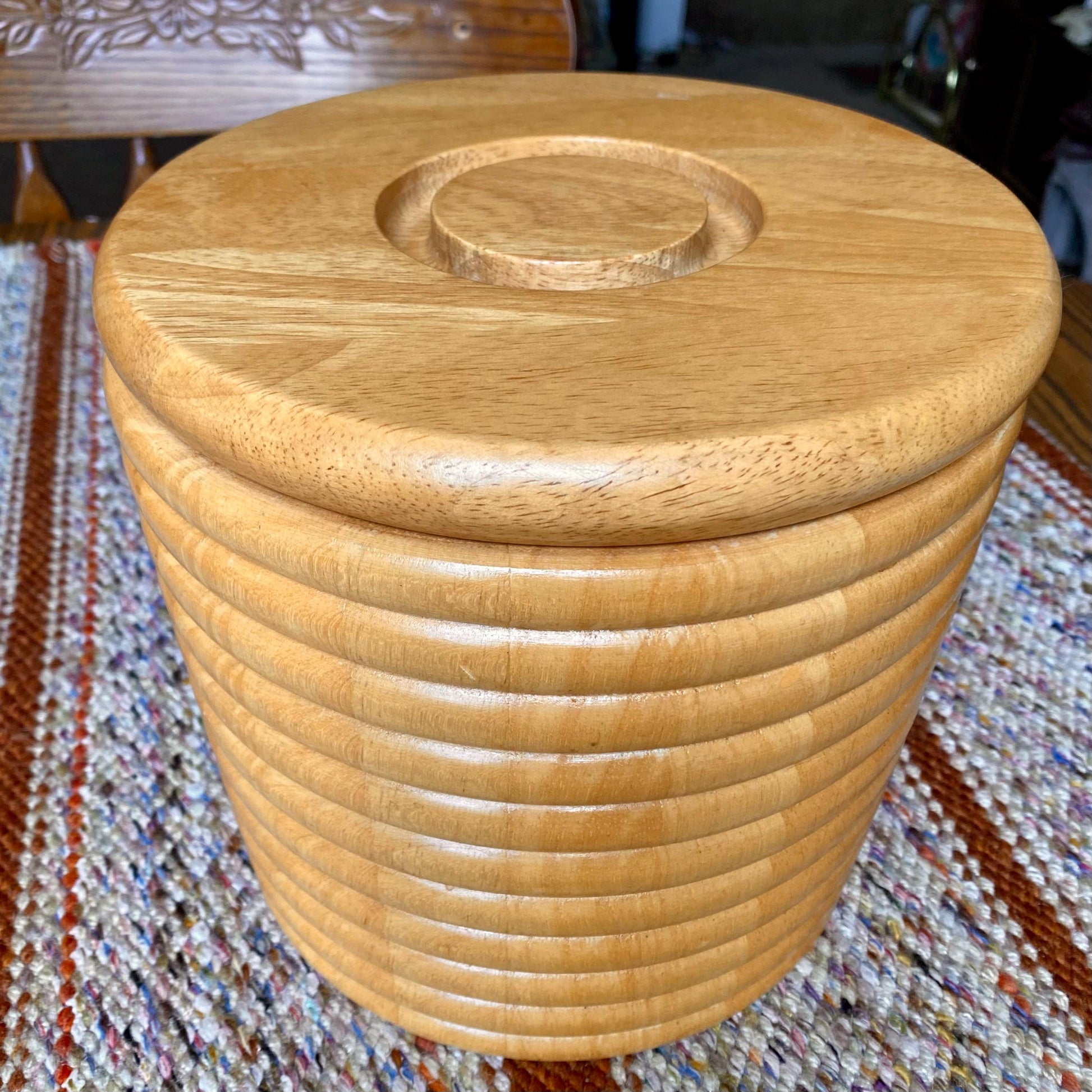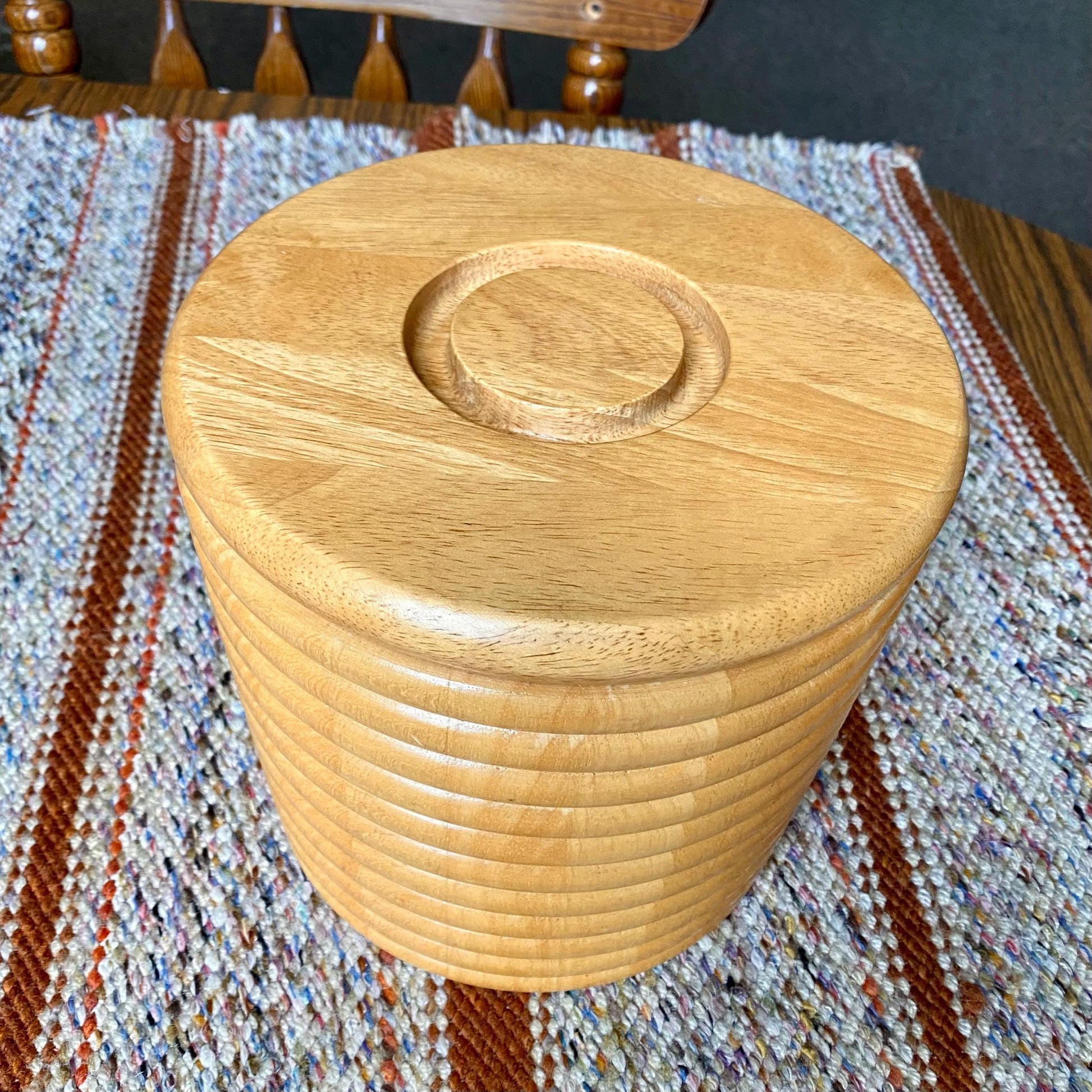 This Heavy Wood Mid-Century Modern Ribbed Barware Ice Bucket is a stylish addition to any home bar collection. The round, wooden ice bucket features a ribbed pattern and comes with a matching lid/topper. Made of wood and with a modern style, this original piece from the 1970s is perfect for all occasions. The handle makes it easy to transport ice cubes while the one hole design is both practical and visually appealing.