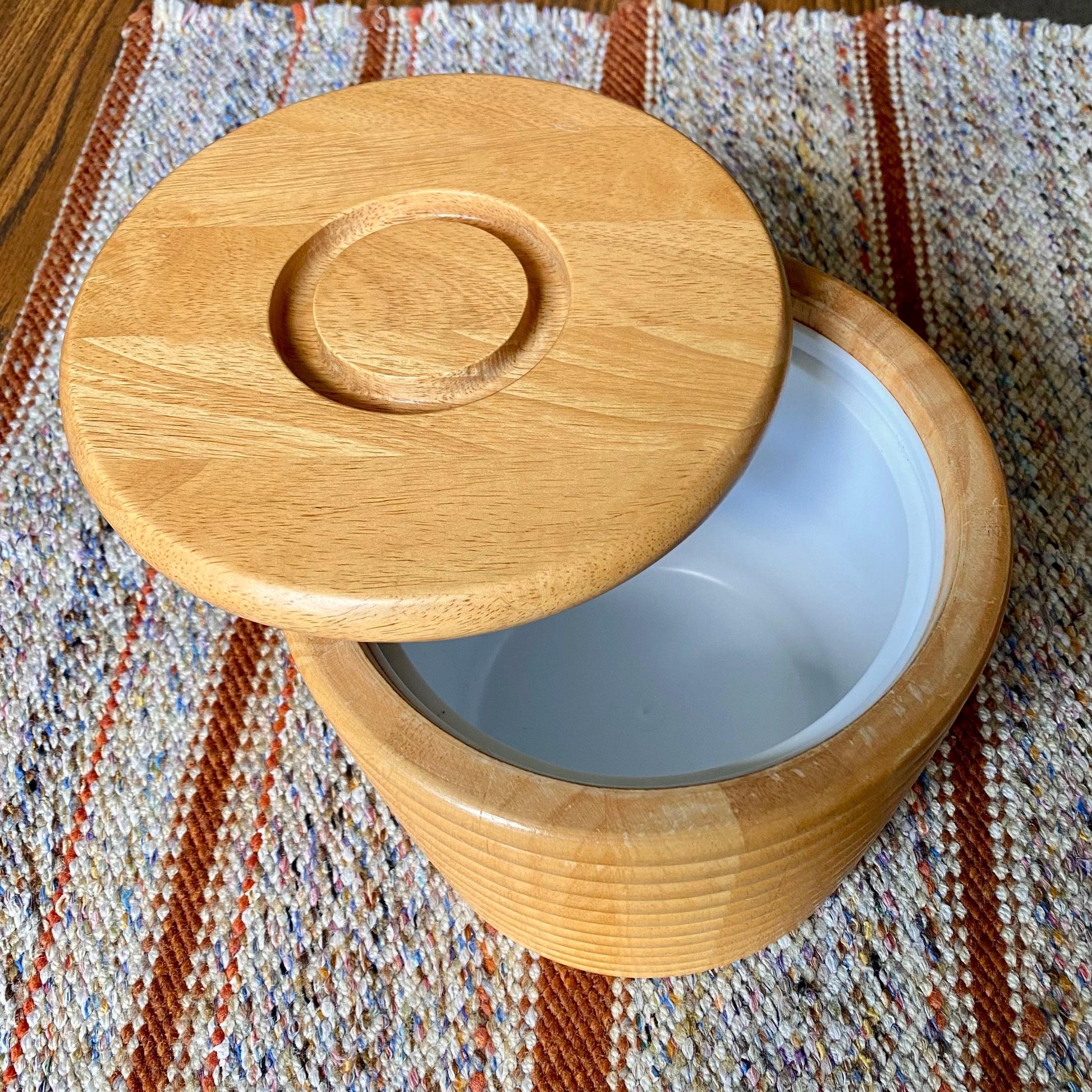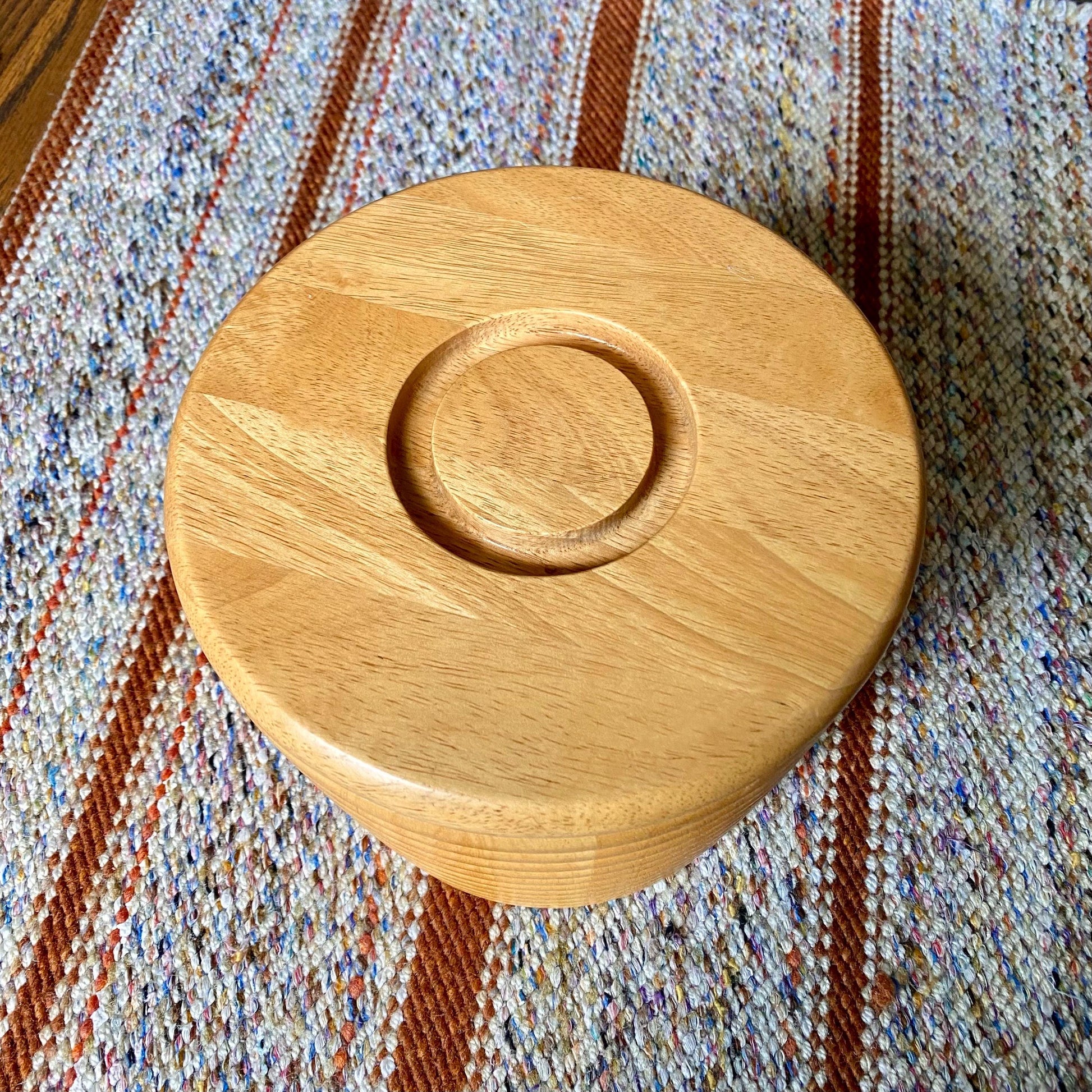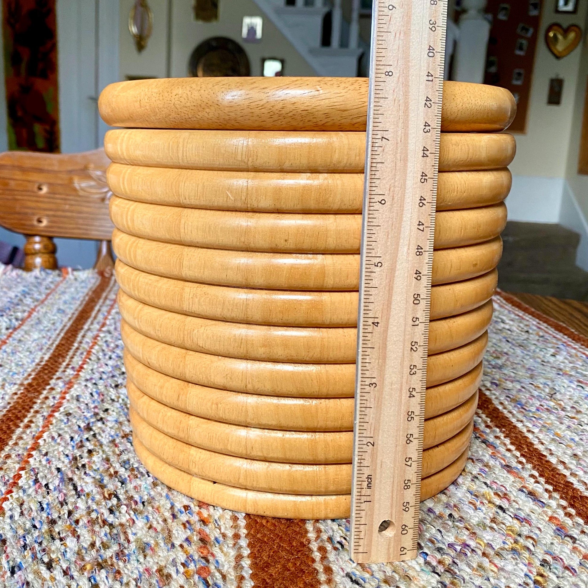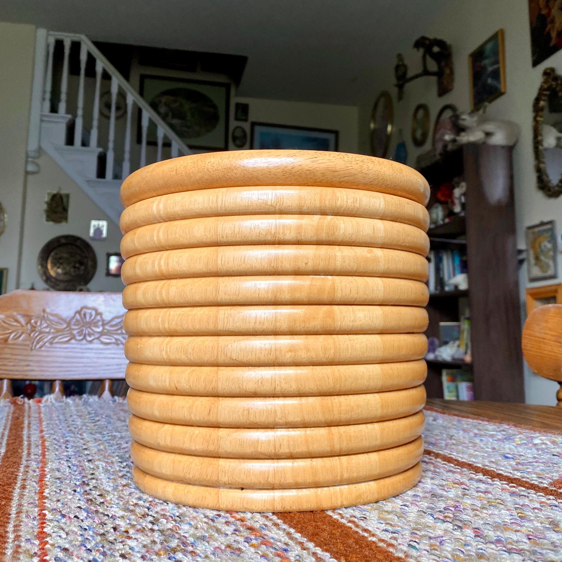 This Heavy Wood Mid-Century Modern Ribbed Barware Ice Bucket is a stylish addition to any home bar collection. The round, wooden ice bucket features a ribbed pattern and comes with a matching lid/topper. Made of wood and with a modern style, this original piece from the 1970s is perfect for all occasions. The handle makes it easy to transport ice cubes while the one hole design is both practical and visually appealing.
