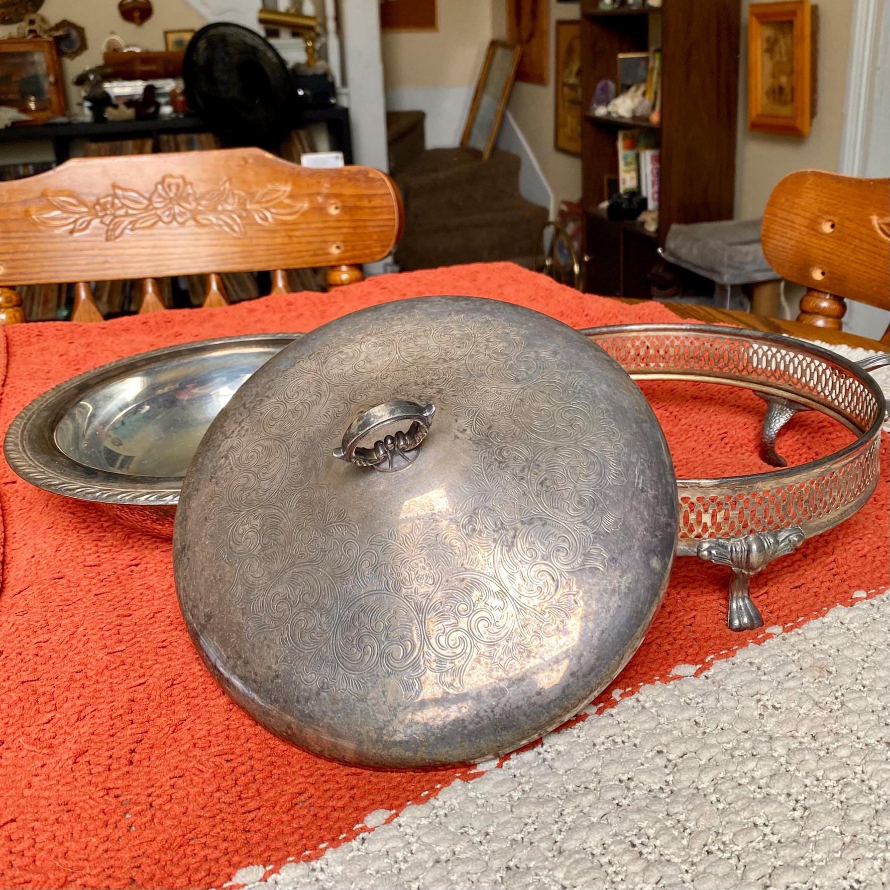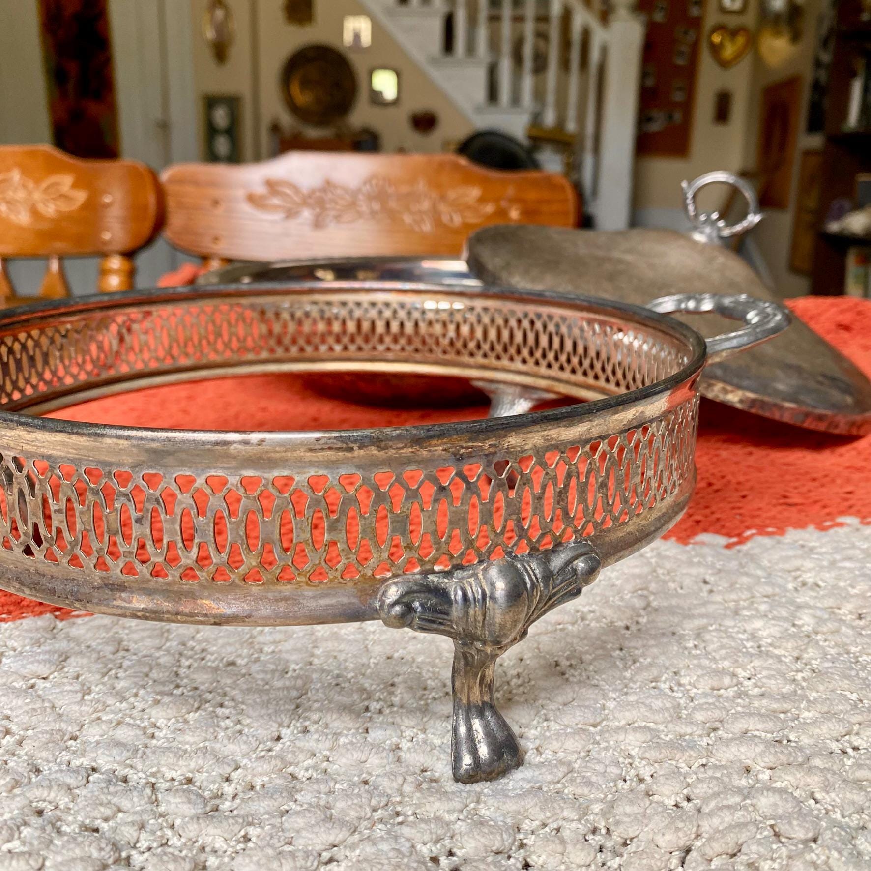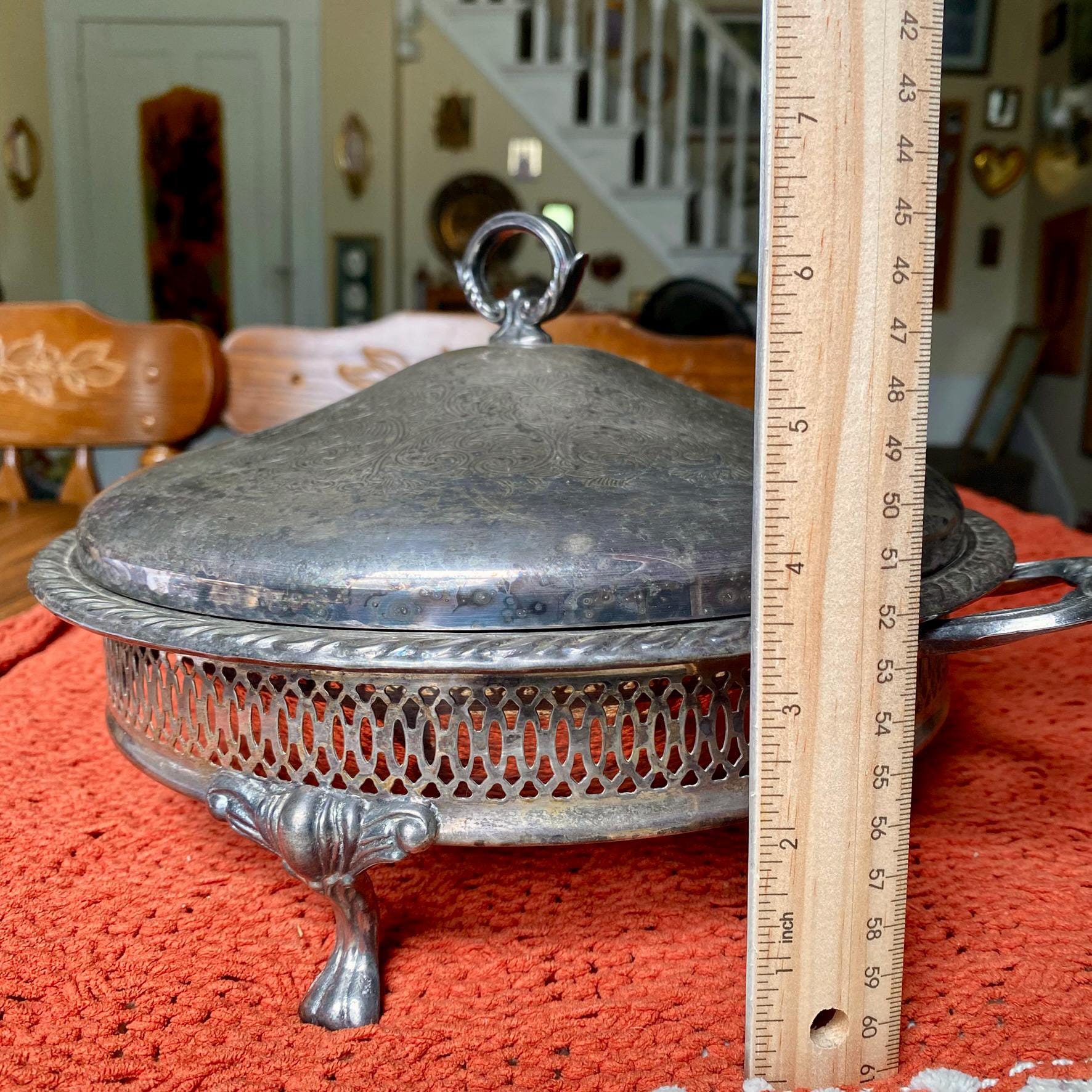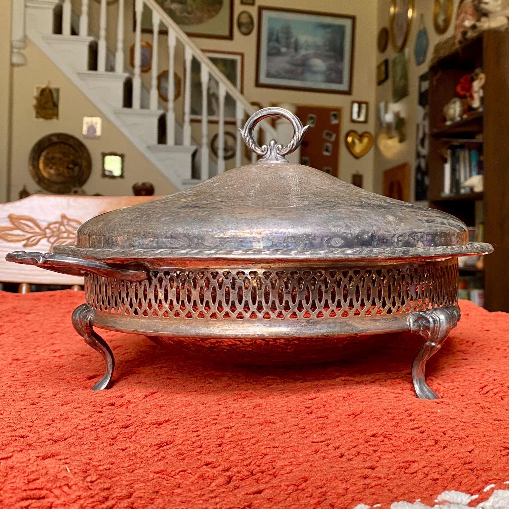 Mid-Century Footed Silver Plated Covered Chafing Dish Casserole Warmer