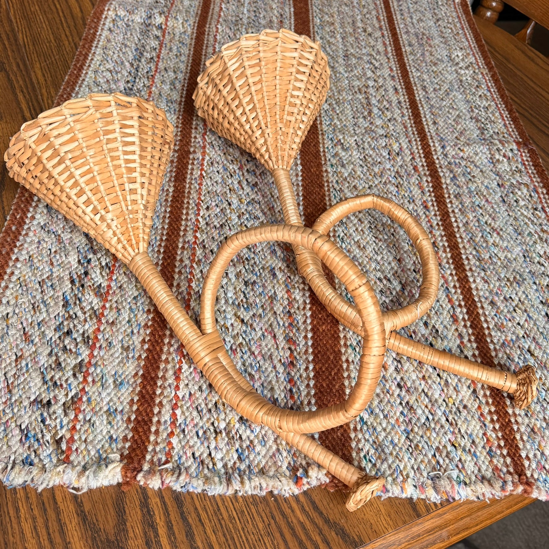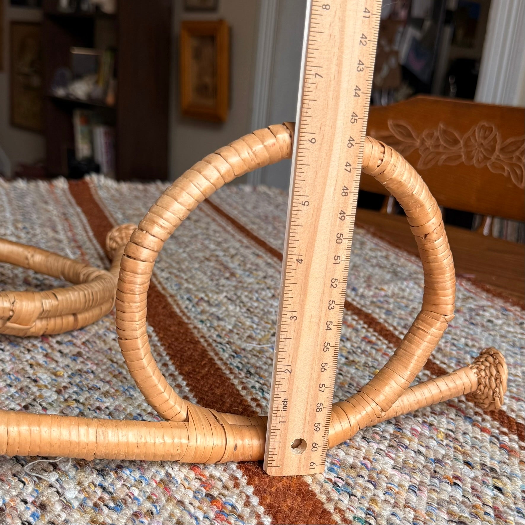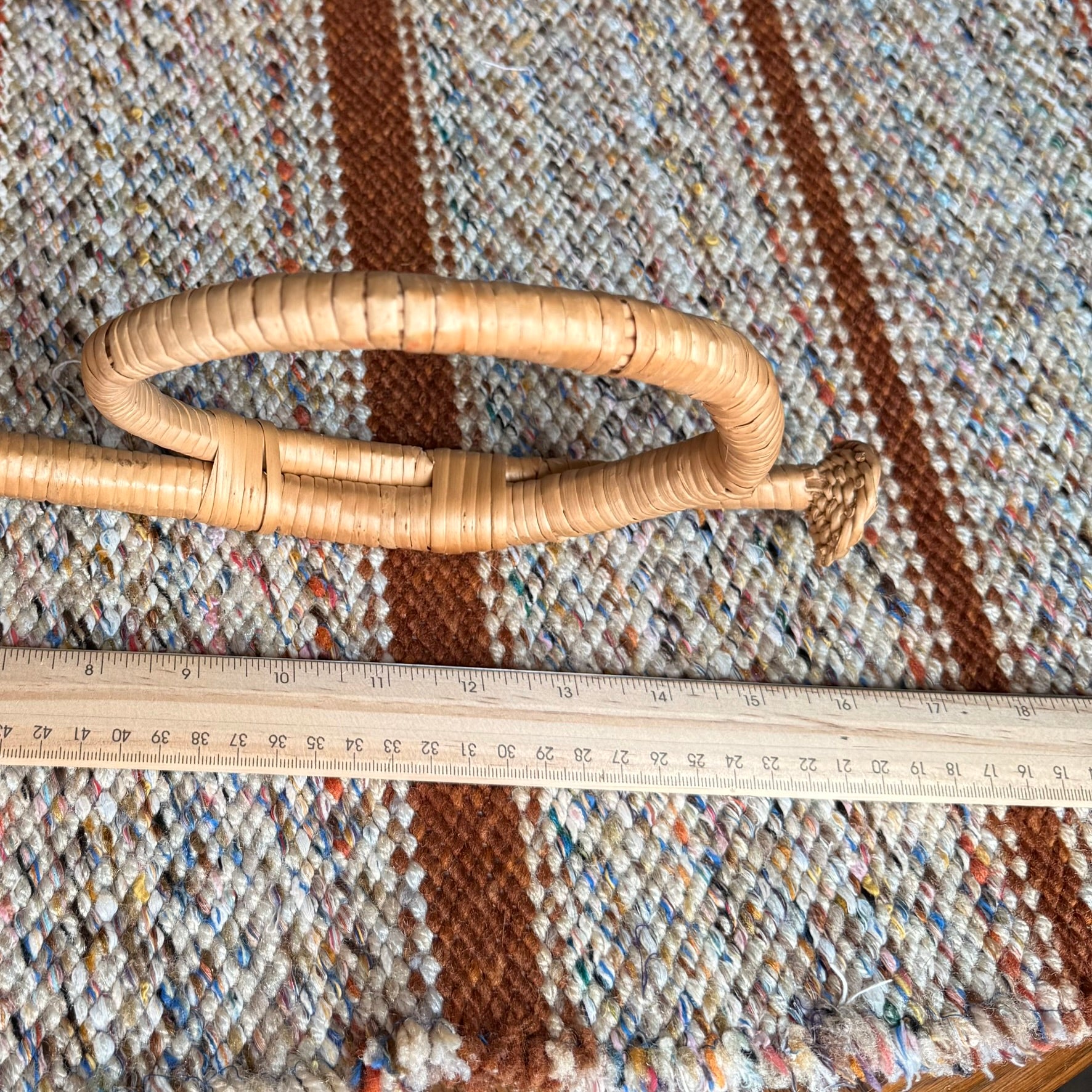 This vintage 1980s wicker/rattan French horn shaped basket is a unique and charming decorative collectible piece. Its beige color and music theme make it a stylish addition to any classical music lover's space, with a touch of nostalgia from the 1980s era. The hanging basket design adds a practical element to its aesthetic appeal, perfect for displaying small plants or decorative items in a whimsical way. Made from natural wicker and rattan materials, this basket combines a retro style with a timeless vintage feel.