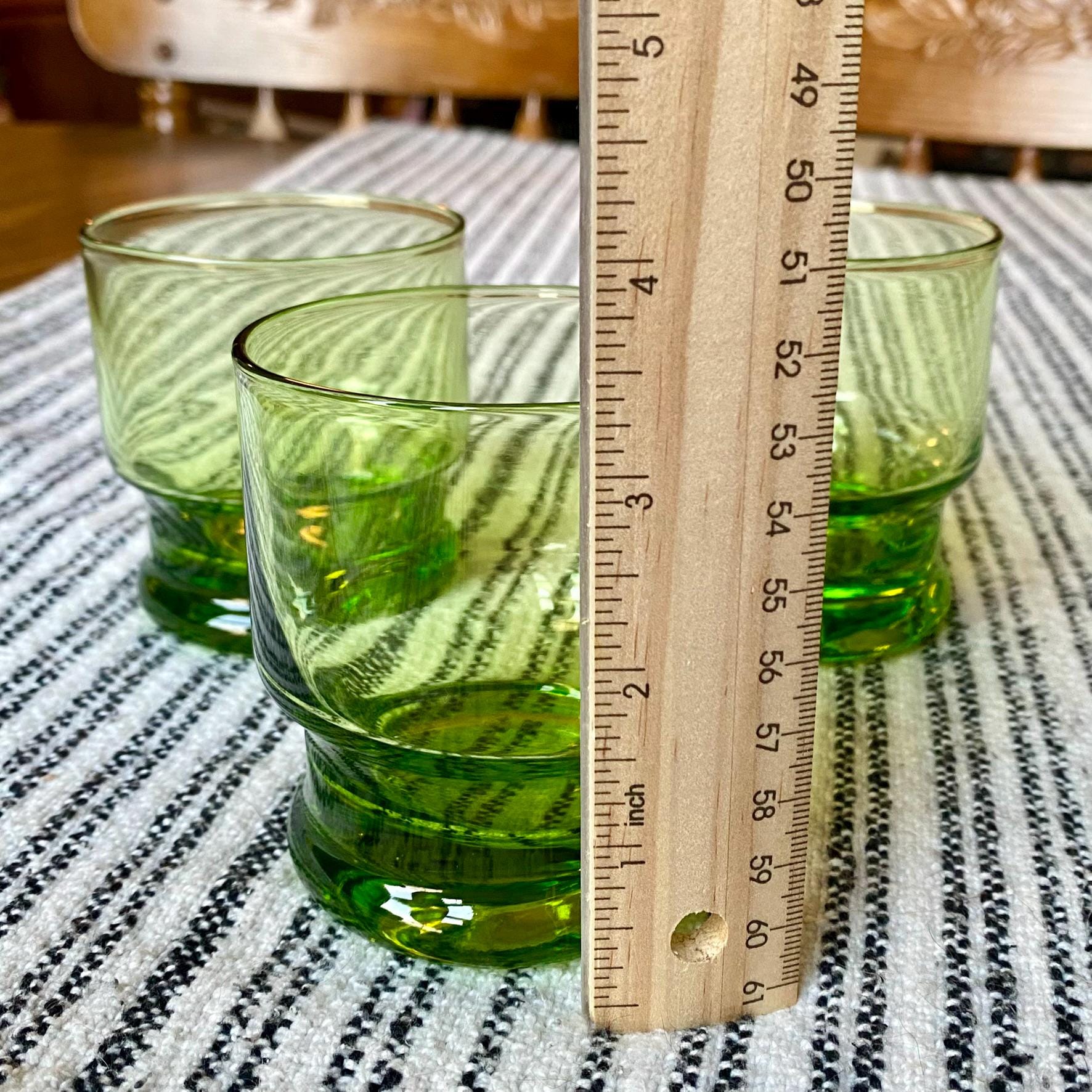 This product is a set of 3 vintage 1980s green apple cocktail tumblers, featuring a unique double base design that adds a touch of sophistication to your drinkware collection. The tumblers showcase a charming vibrant green apple color, perfect for adding a retro touch to your cocktail parties or special occasions. Made in the 1980s, these tumblers offer a nostalgic and collectible element to your home bar or kitchen decor.