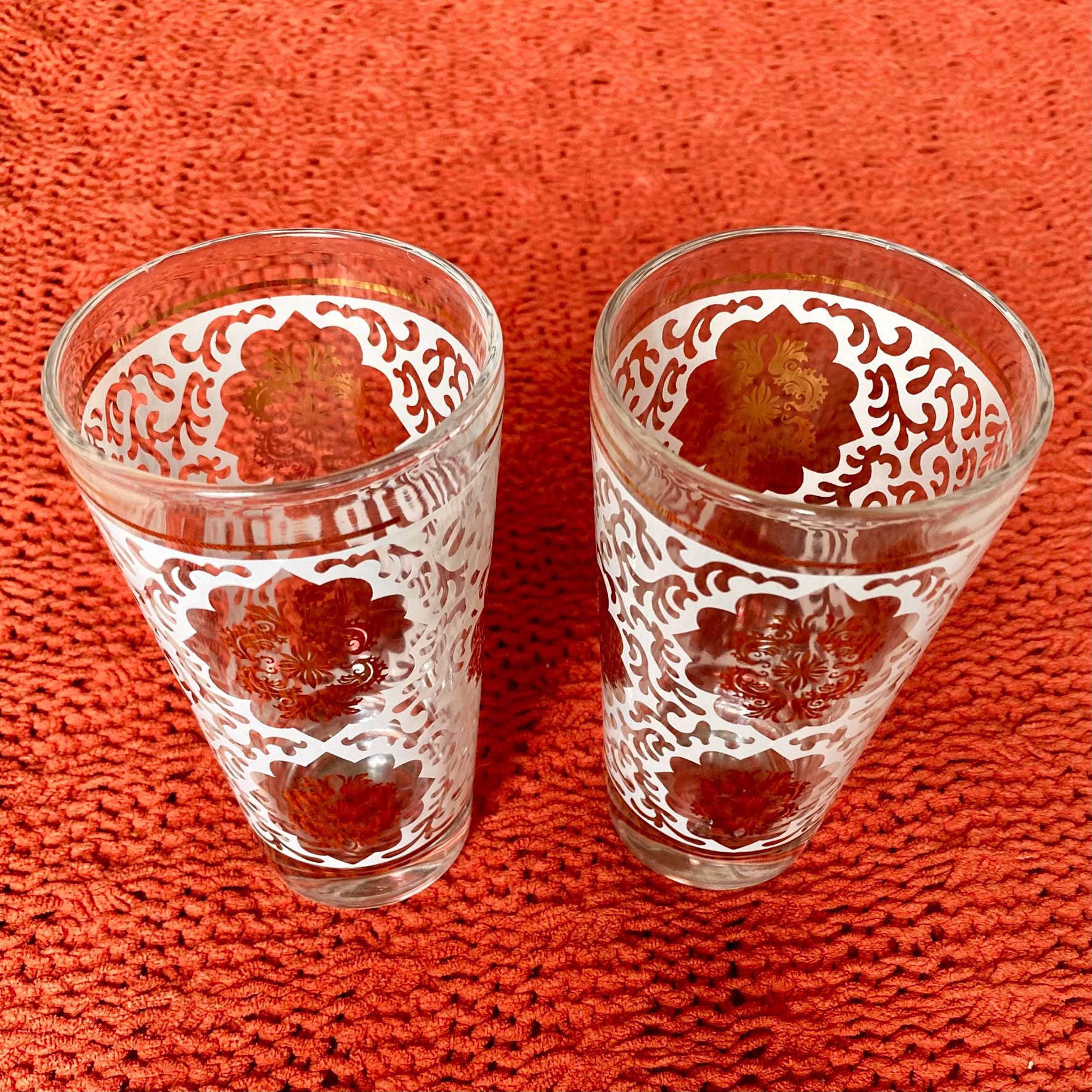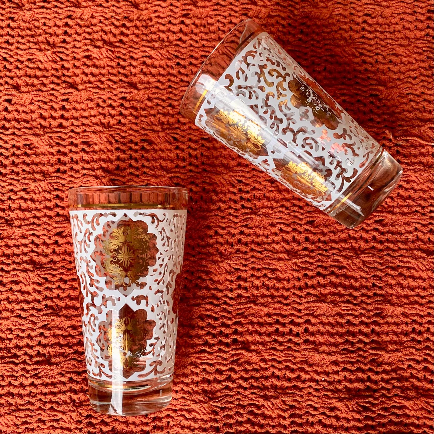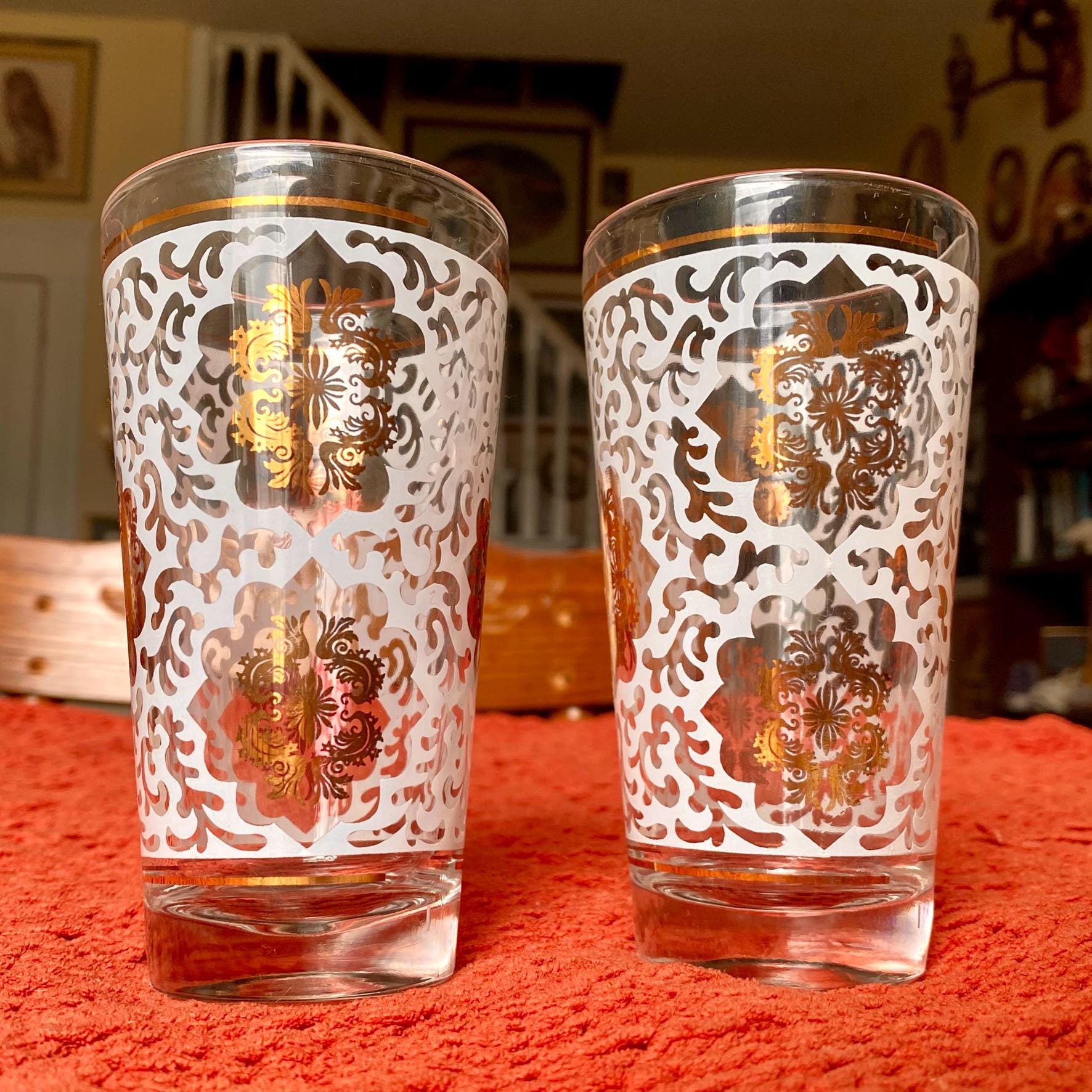 This product is a set of two vintage white and gold lace Moroccan Moorish tumbler cocktail glasses. The glasses feature a stunning design with a white color and intricate gold lace accents, adding a touch of elegance to any drinkware collection. Perfect for serving cocktails in style, these tumbler glasses are sure to add a touch of sophistication to any home bar or dining table setting.