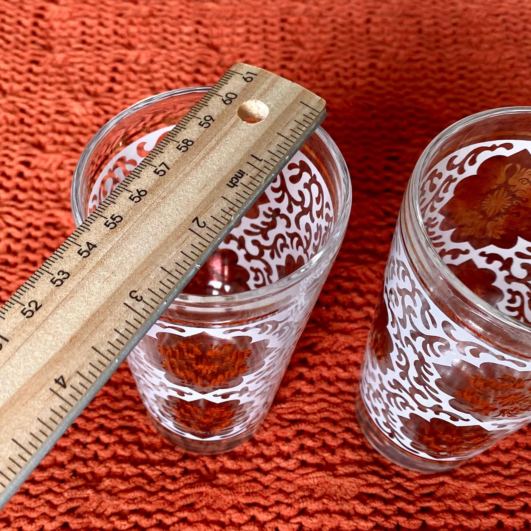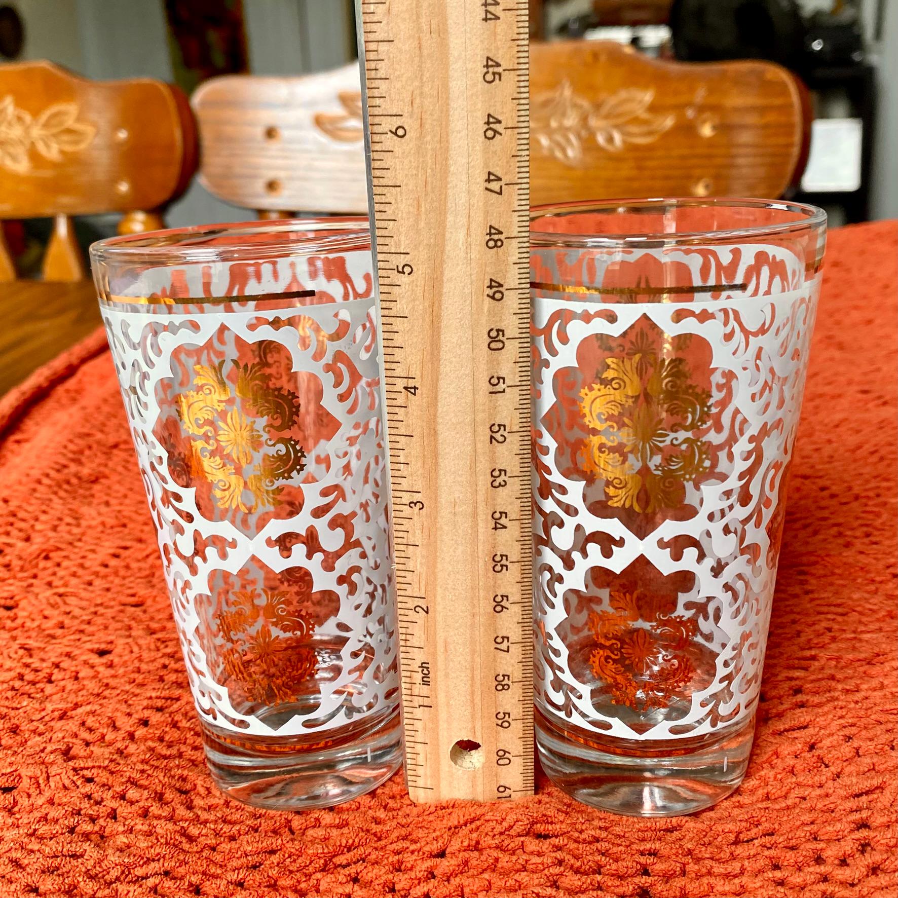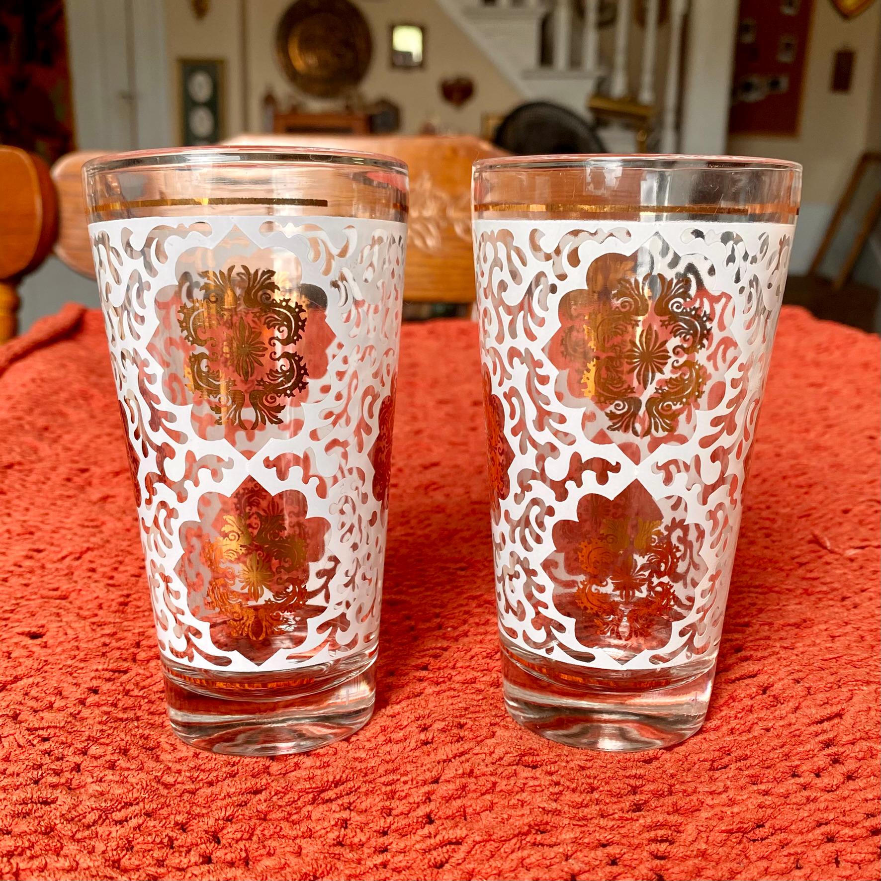 This product is a set of two vintage white and gold lace Moroccan Moorish tumbler cocktail glasses. The glasses feature a stunning design with a white color and intricate gold lace accents, adding a touch of elegance to any drinkware collection. Perfect for serving cocktails in style, these tumbler glasses are sure to add a touch of sophistication to any home bar or dining table setting.