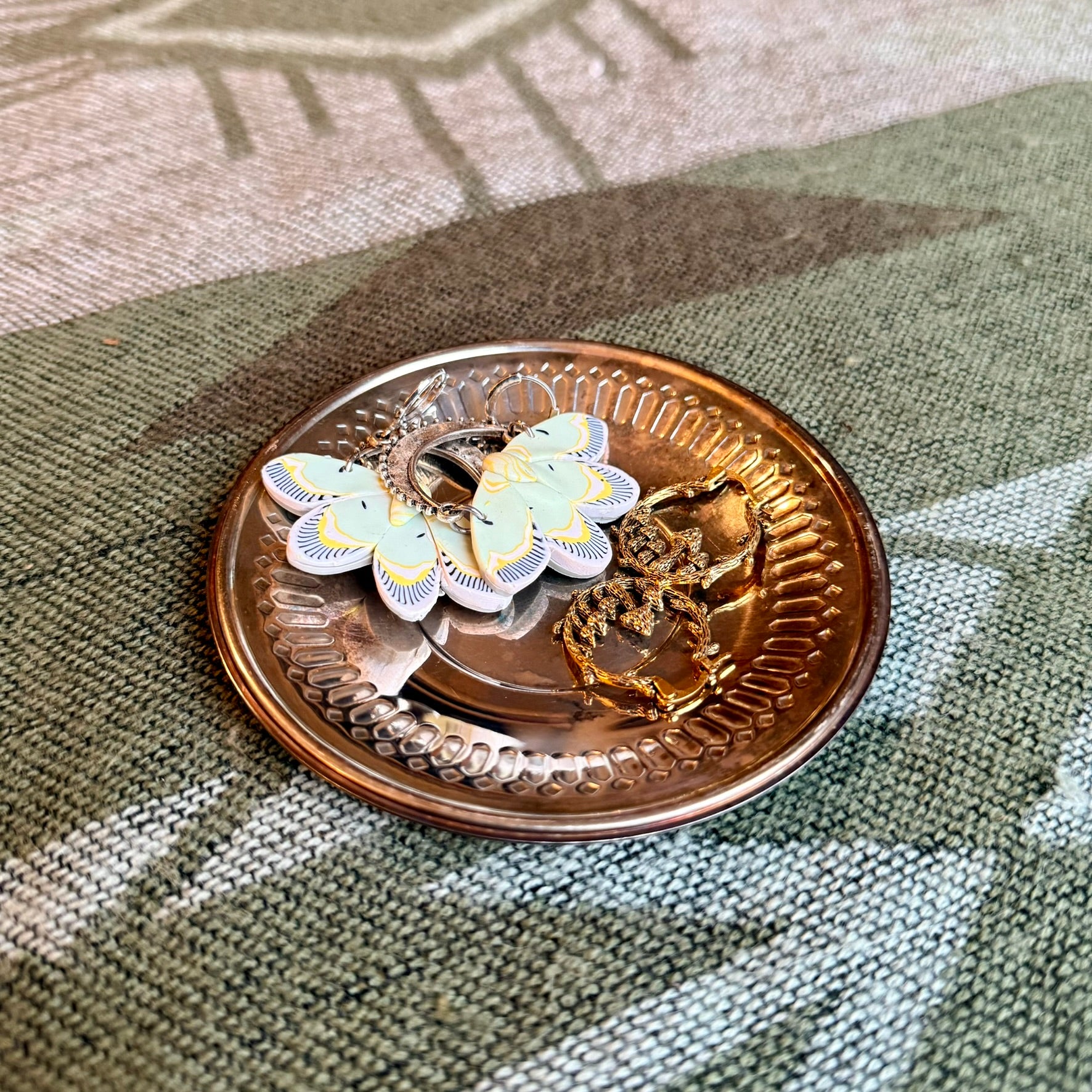 Gorgeous silver colored ring dish, ornate detailing. Would look great on a vanity, bedside, or by the sink!