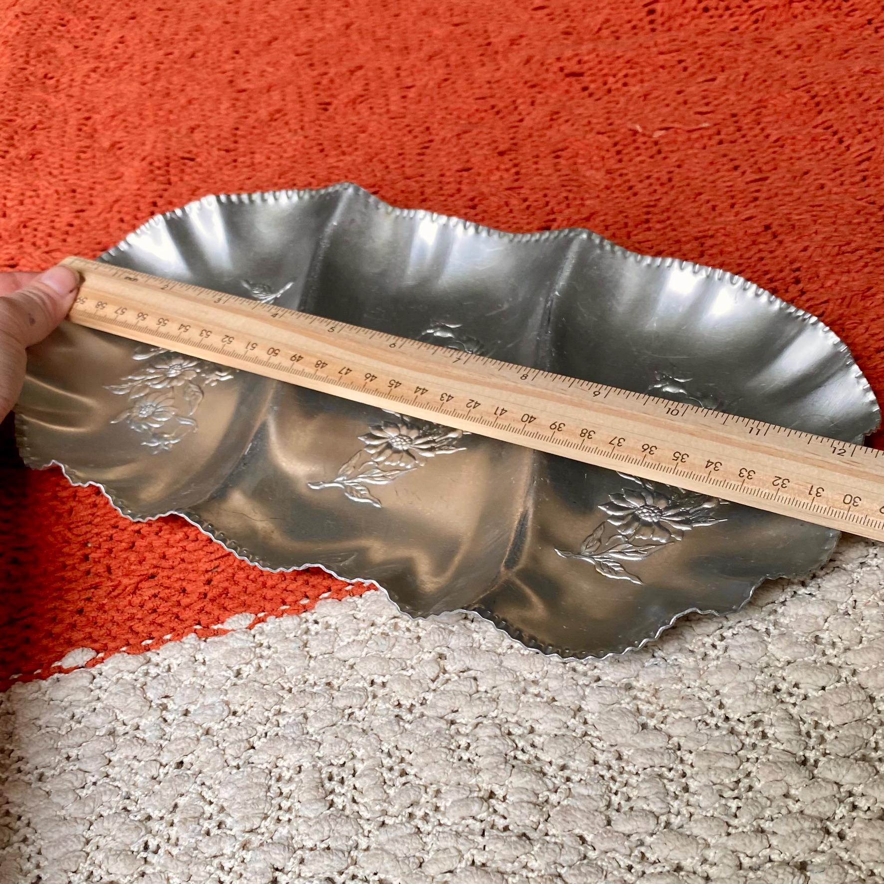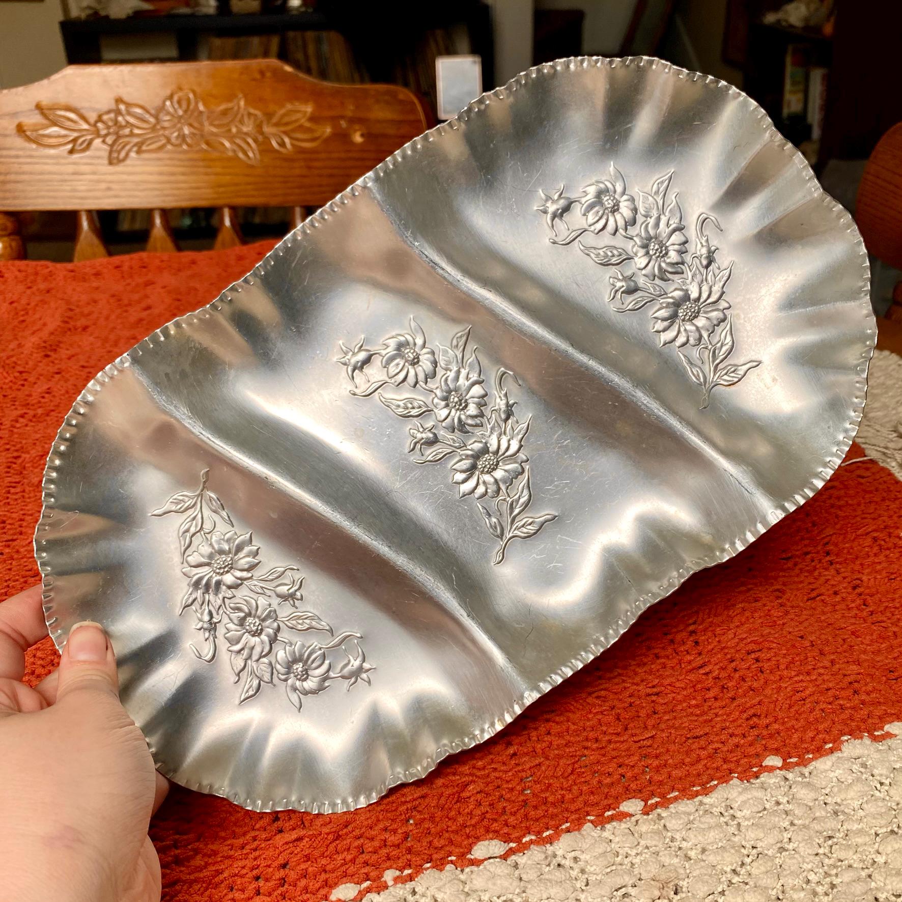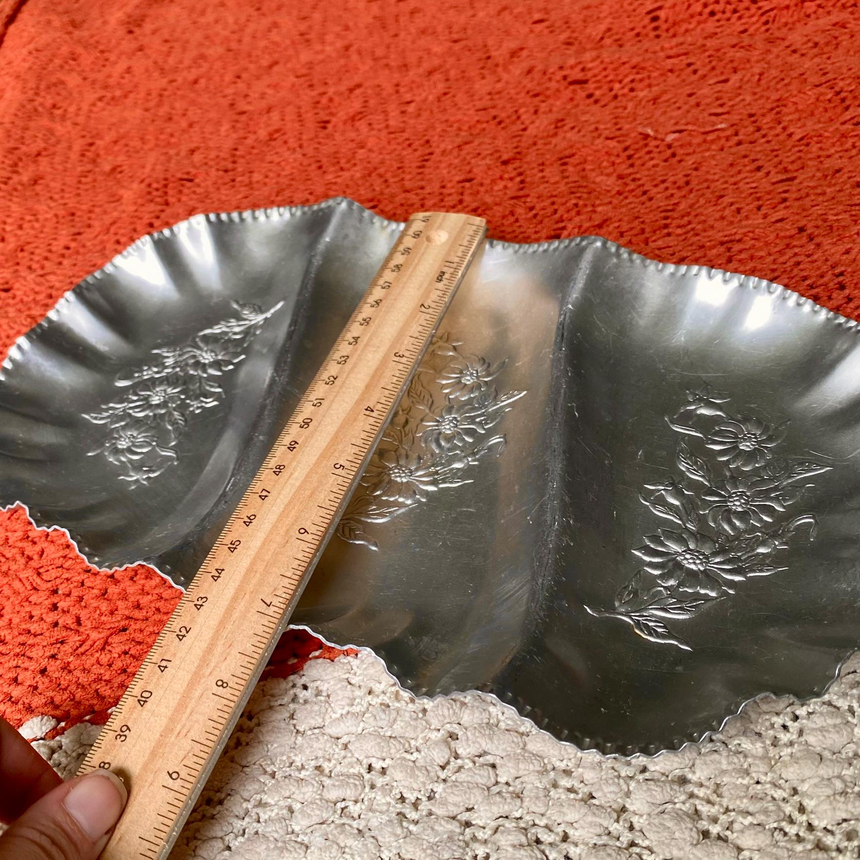 Three Sectioned Hand Wrought Aluminum Serving/Trinket Tray with Embossed Floral Design