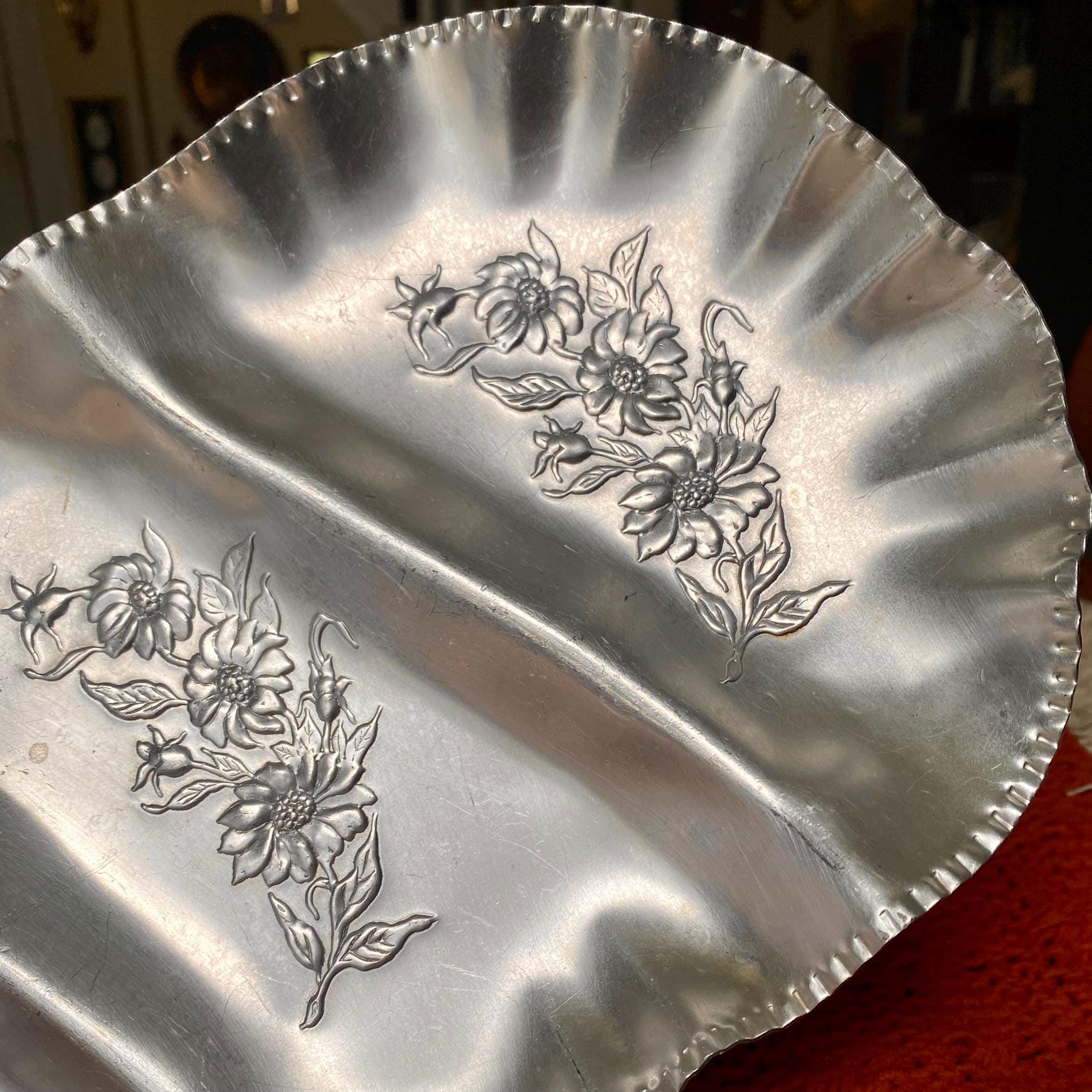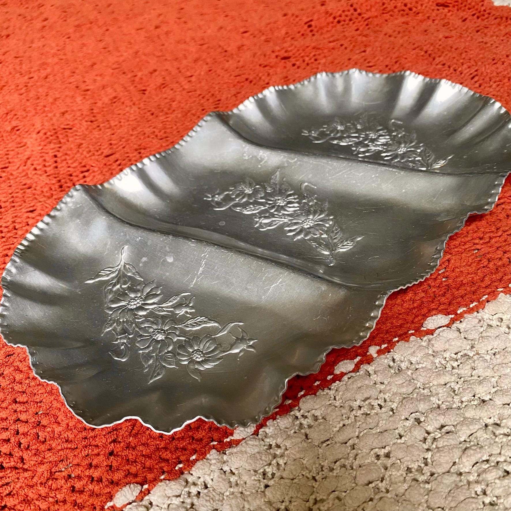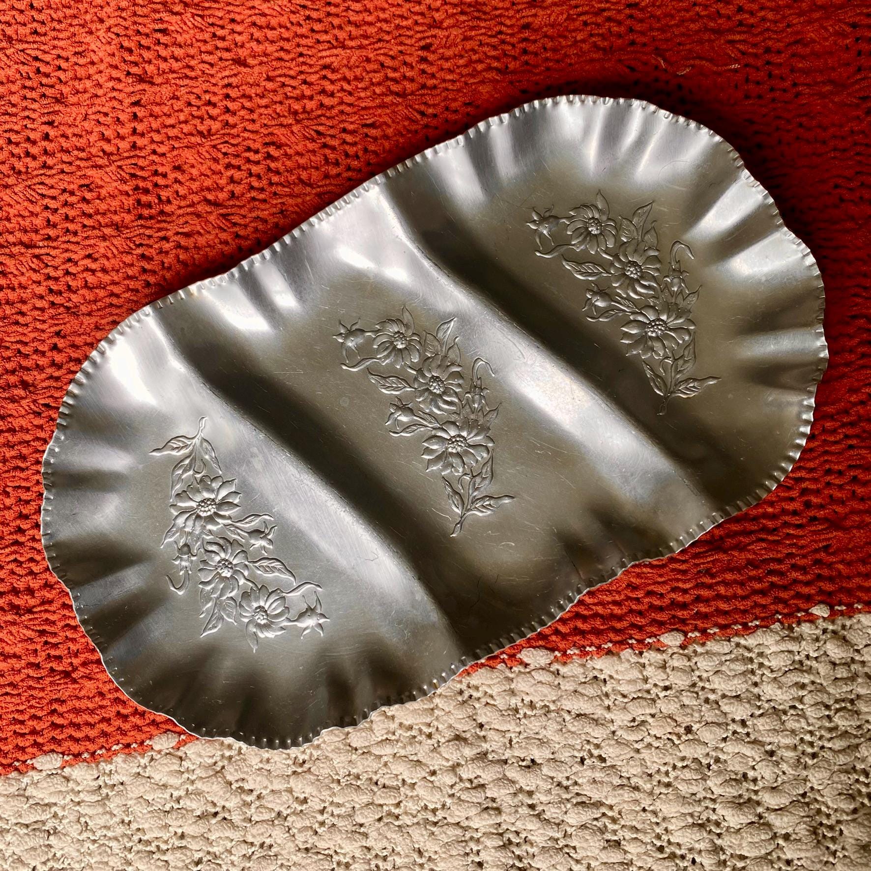 Three Sectioned Hand Wrought Aluminum Serving/Trinket Tray with Embossed Floral Design