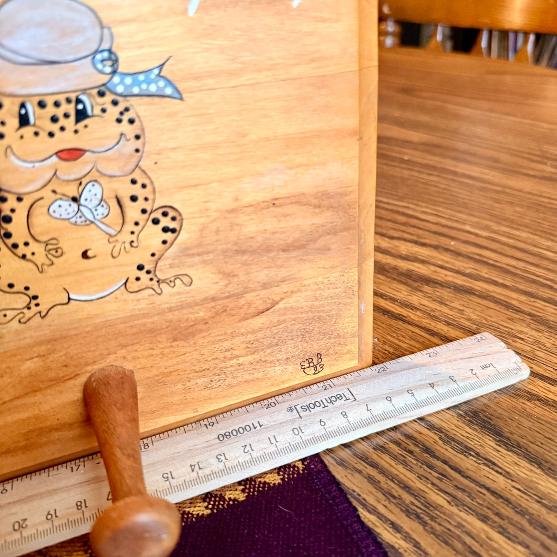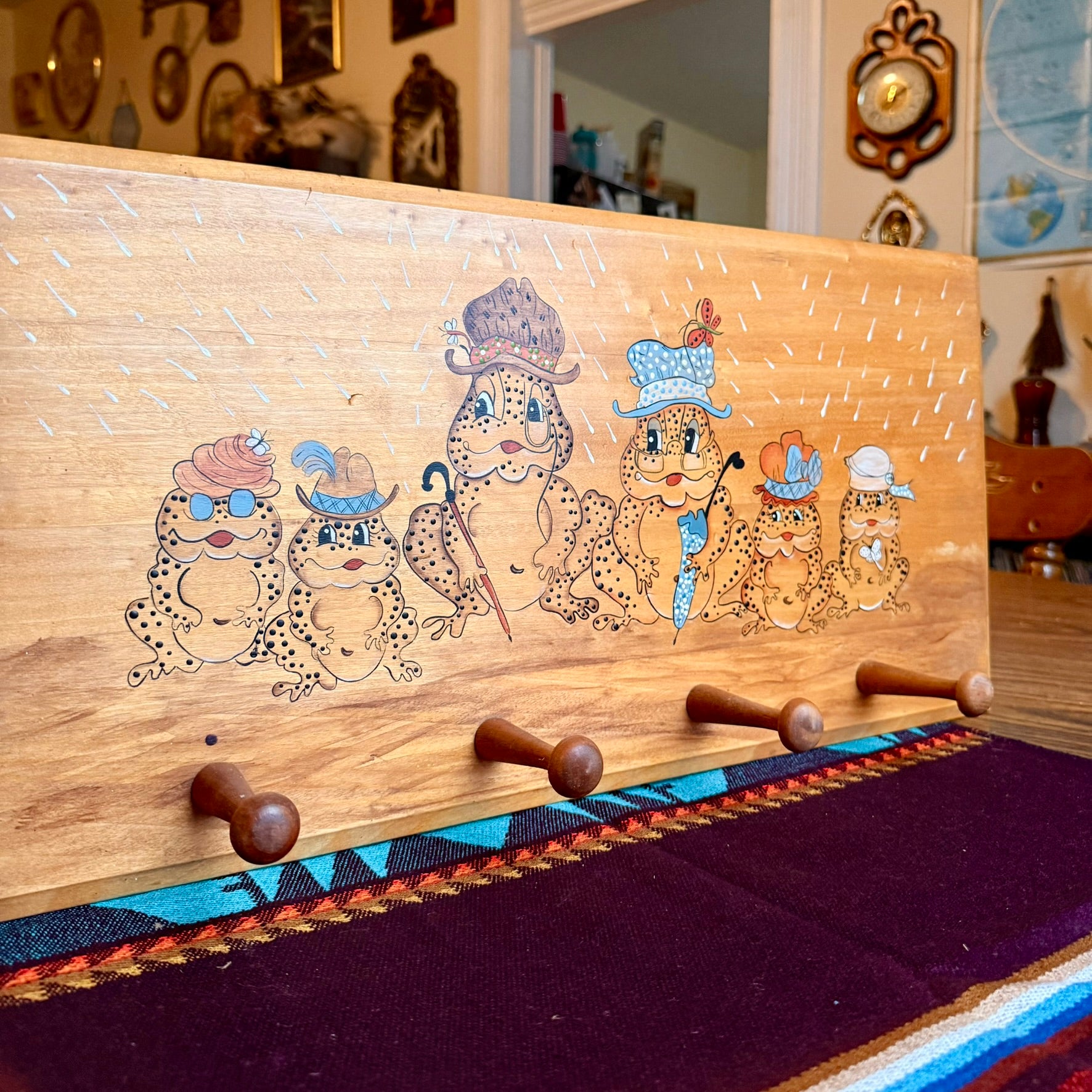 Vintage 1980s Hand Painted Wooden Appalachian Folk Art Frog / Toad Themed Coat Rack