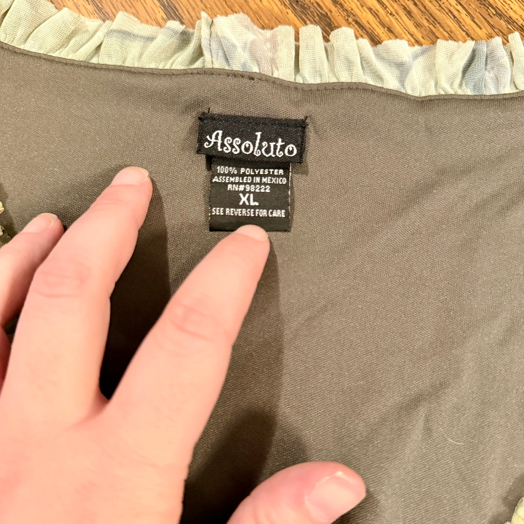 This vintage 90s / 2000s y2k Assoluto ruffled jungle floral fairy baby doll top is a charming piece perfect for any woman looking to add a whimsical touch to their wardrobe. The long sleeves, V-neckline, and ruffle accents give it a feminine and playful look, while the green floral pattern adds a touch of nature-inspired magic. Made from polyester, this blouse in size XL is designed for regular fit and exudes a fairy character that is sure to delight any fashion-forward individual.