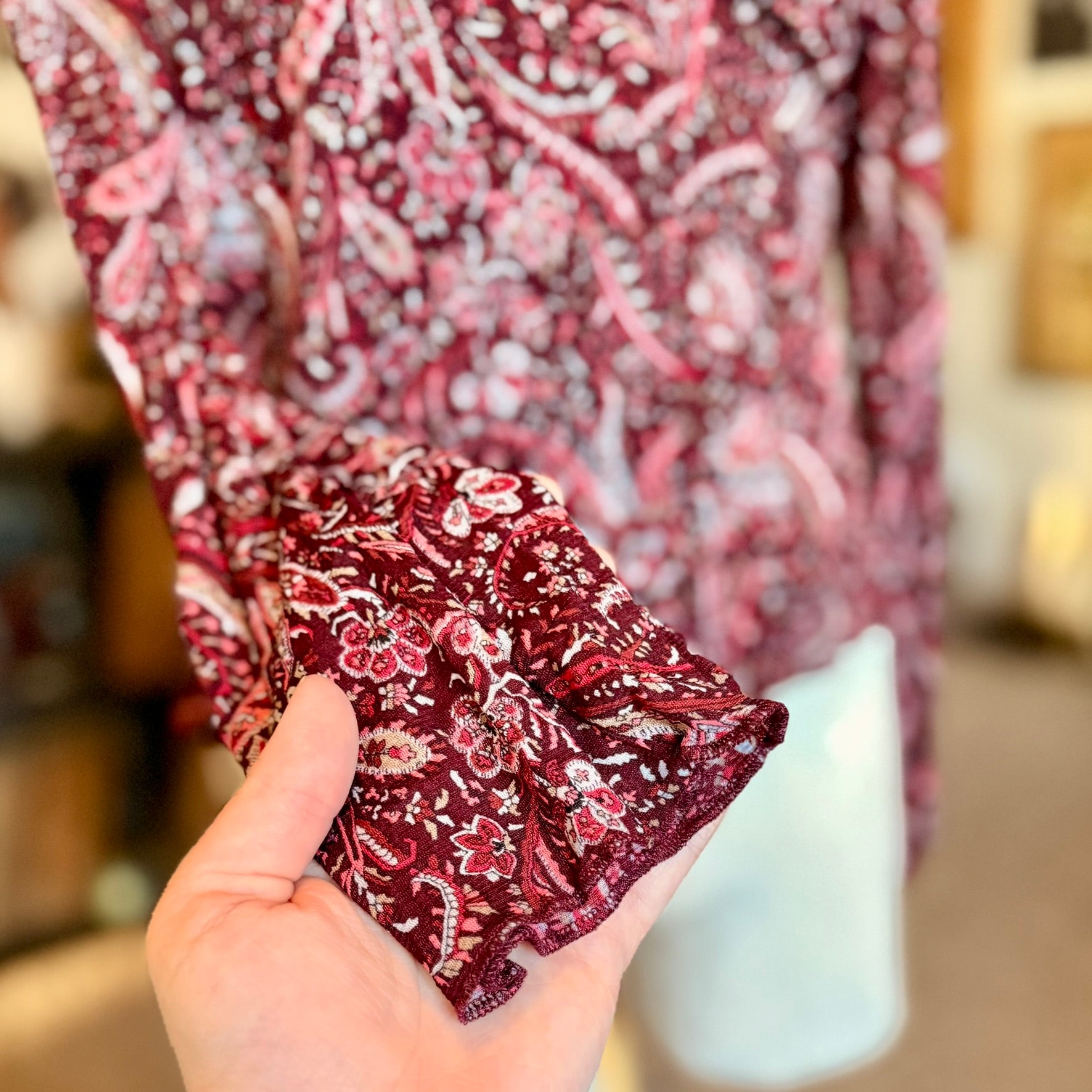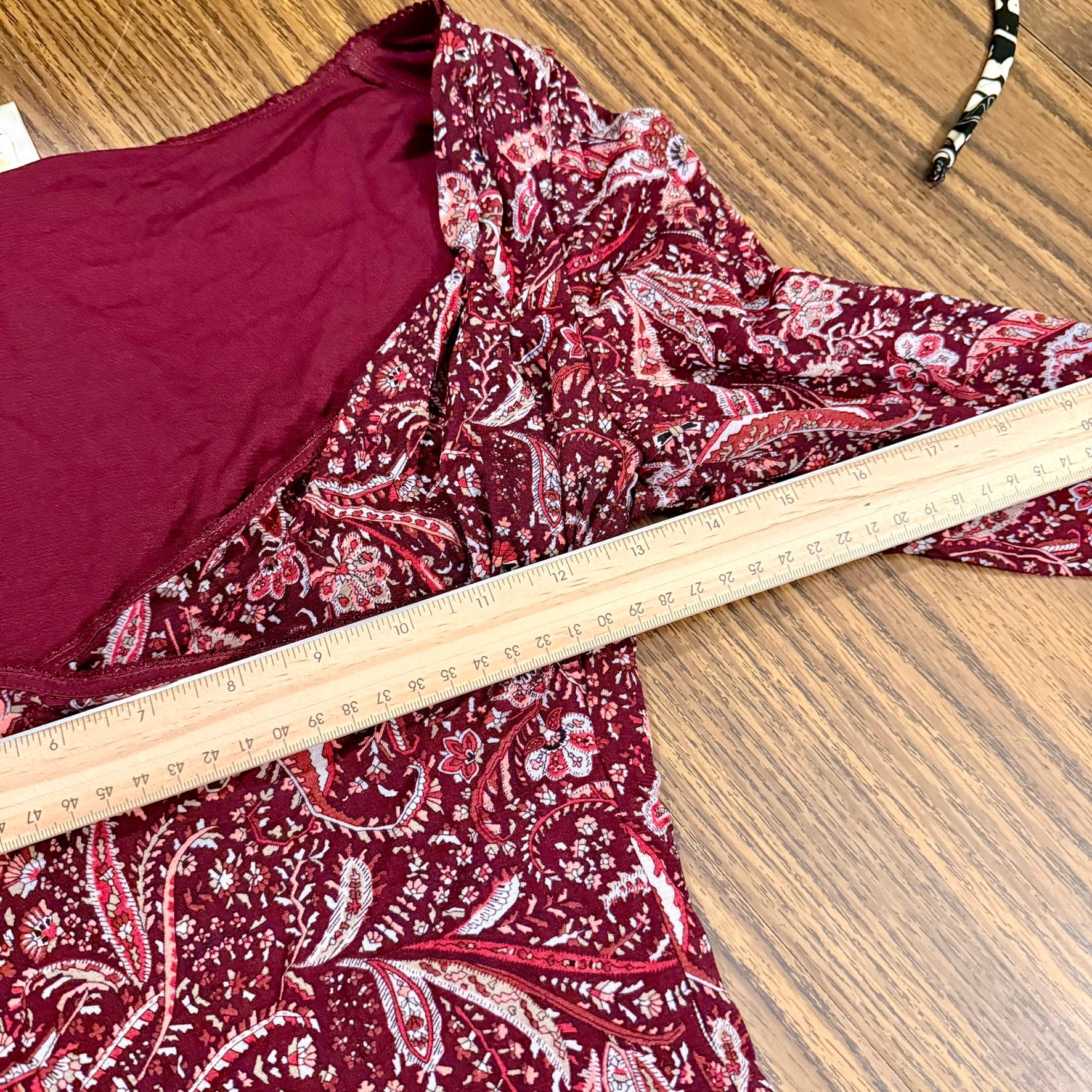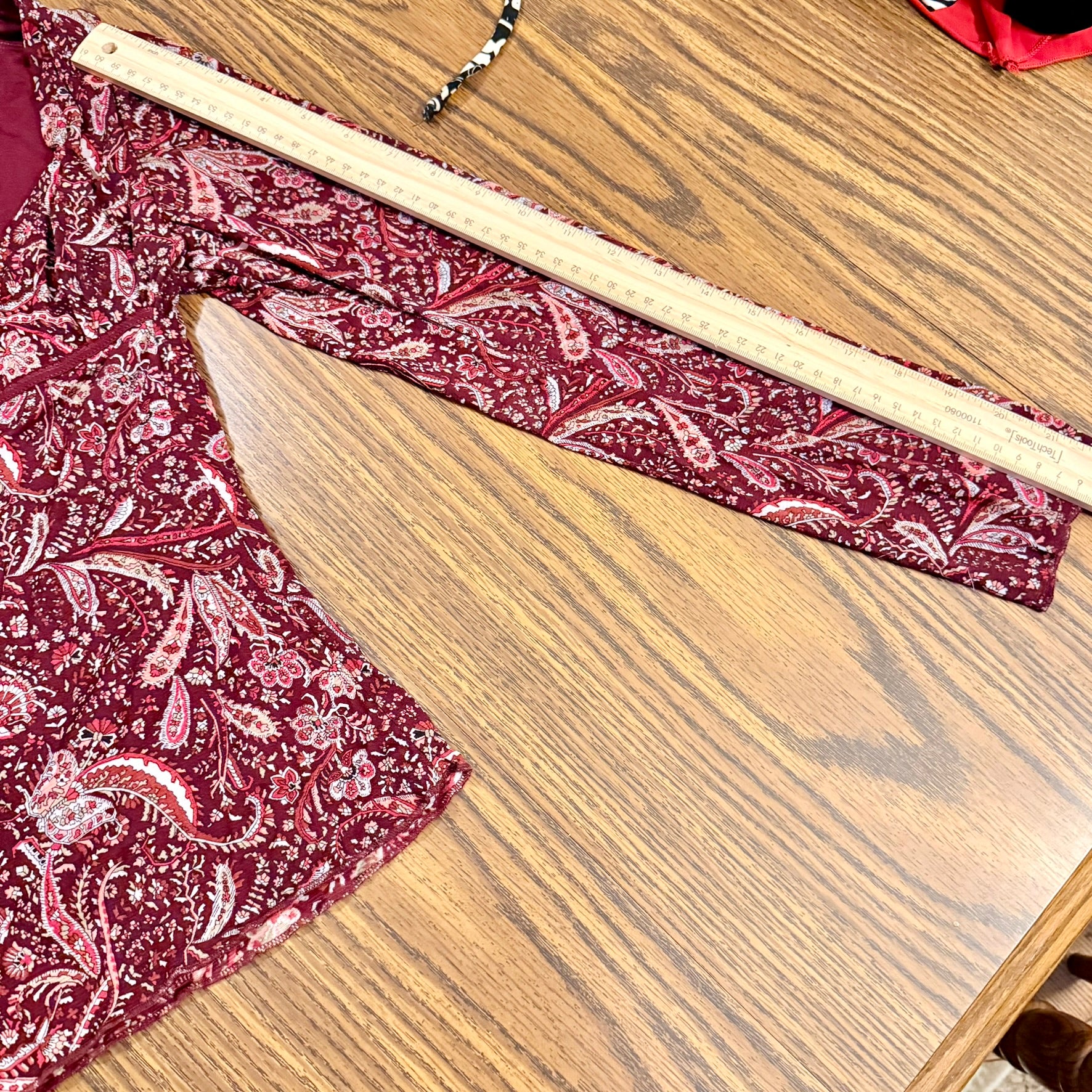 The Vintage 90s / 2000s y2k Patterned Old Navy Baby Doll Top is a charming blouse designed for women. It features a sweetheart neckline, long sleeves, and a baby doll style, perfect for those looking for a nostalgic touch in their wardrobe. The top is made of nylon material and comes in a lovely maroon color, adding a pop of color to any outfit. With a size medium and regular fit, this top is a versatile addition for those who appreciate 90s fashion trends.