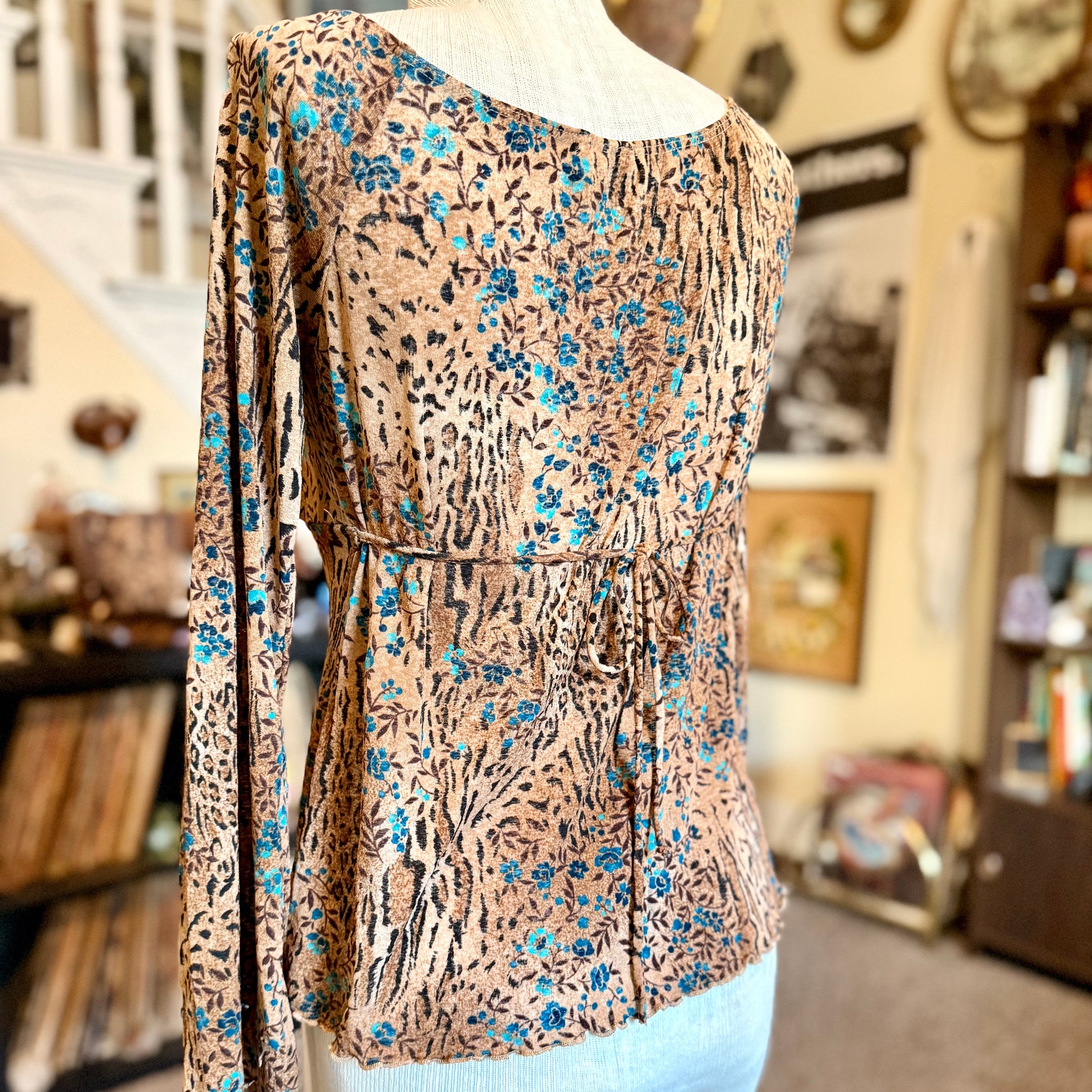 The Vintage 90s / 2000s Self Esteem Bell Sleeve Baby Doll Top is a colorful and stylish blouse perfect for casual occasions. This pullover top features a round neckline, long bell sleeves, and a flattering baby doll style. Made in the United States, this size small top is a nostalgic throwback to the 90s era, suitable for the spring and summer seasons. Easy to care for with its machine washable fabric, this vintage piece is a must-have for any retro fashion enthusiast.