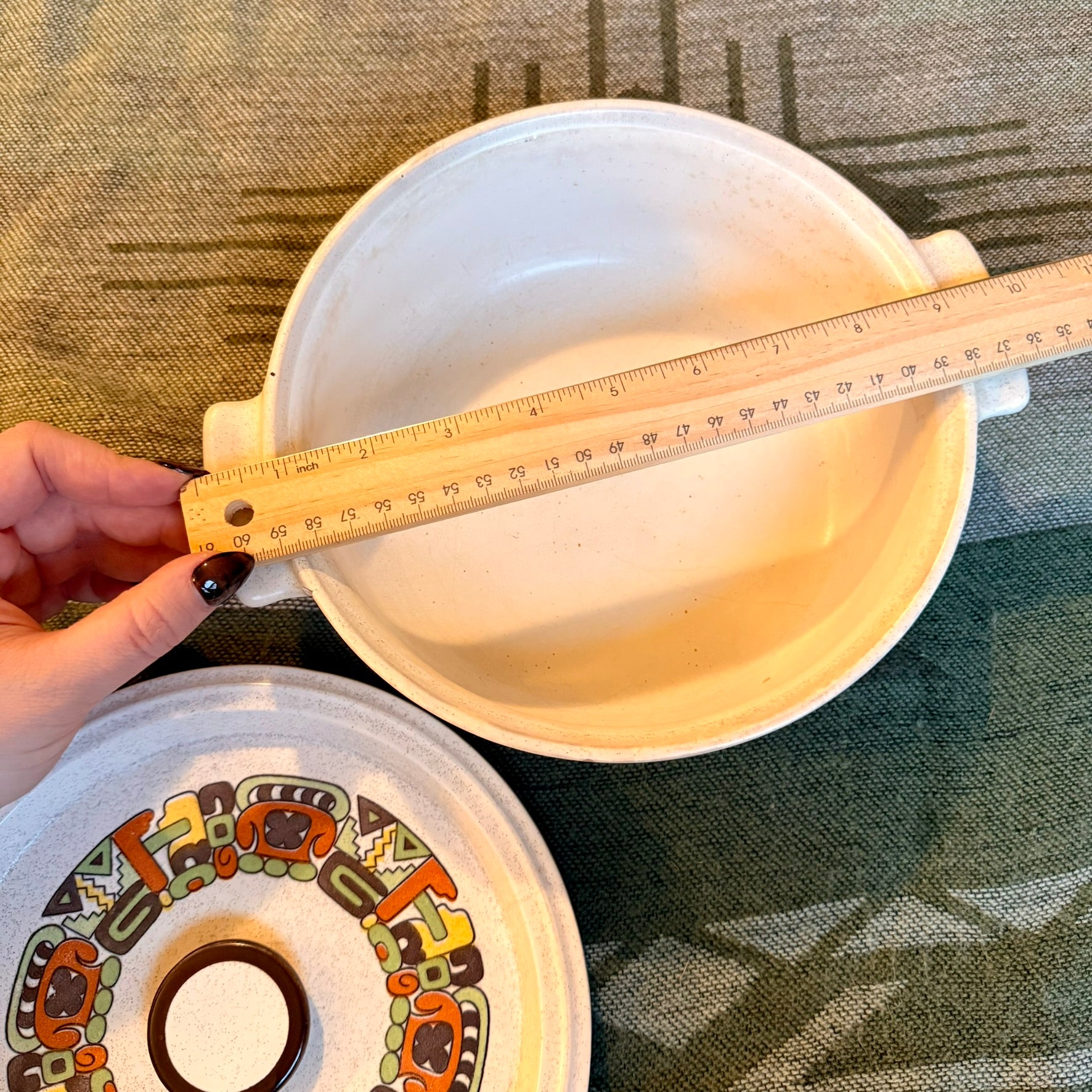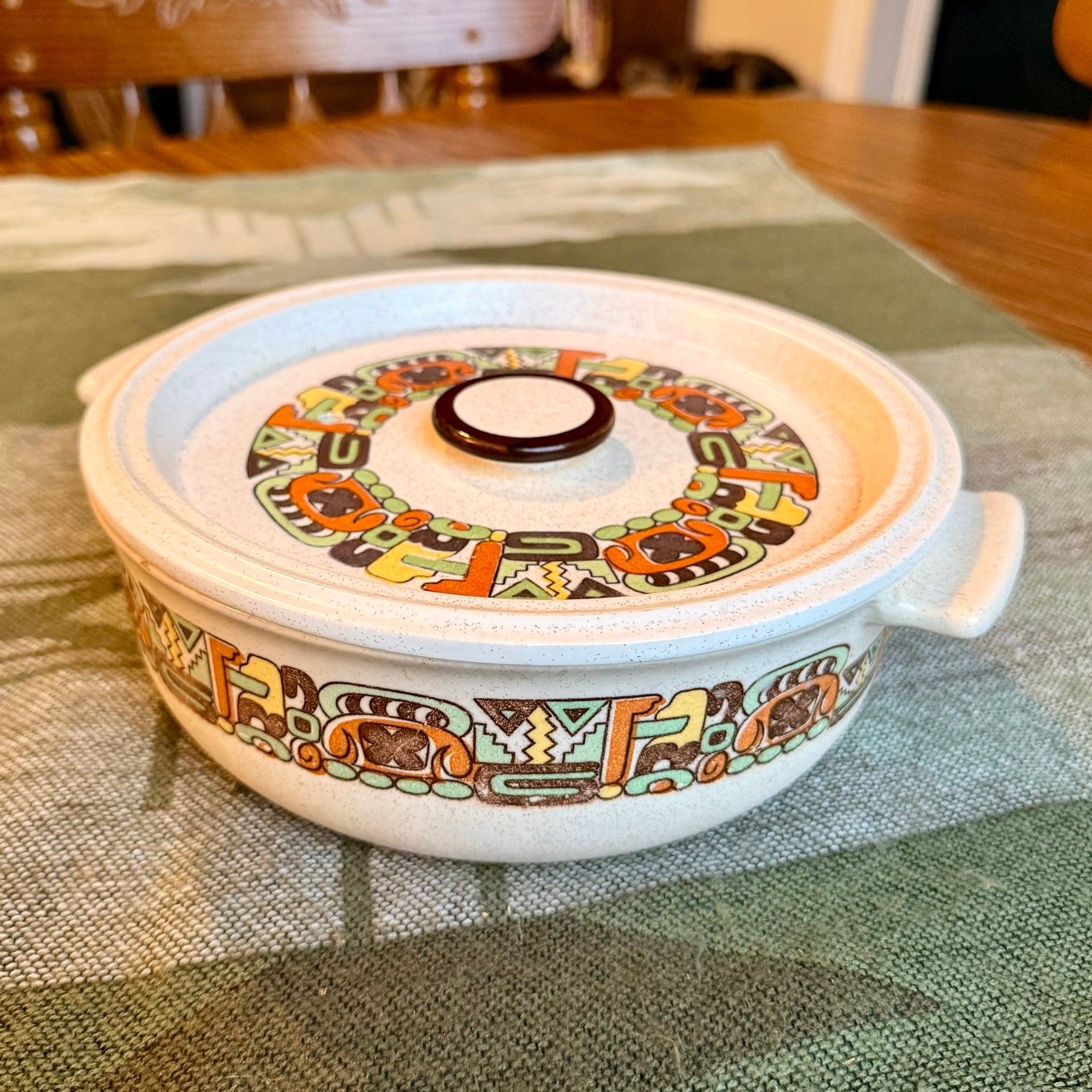 Vintage Flame Chef Stoneware Casserole Dish with Southwestern Tribal Embellishments. Beautiful heavy stoneware dish in great condition! Straight out of the 70s this casserole dish will turn any potluck into a reason to show it off! Perfect piece for the midcentury modern collector.