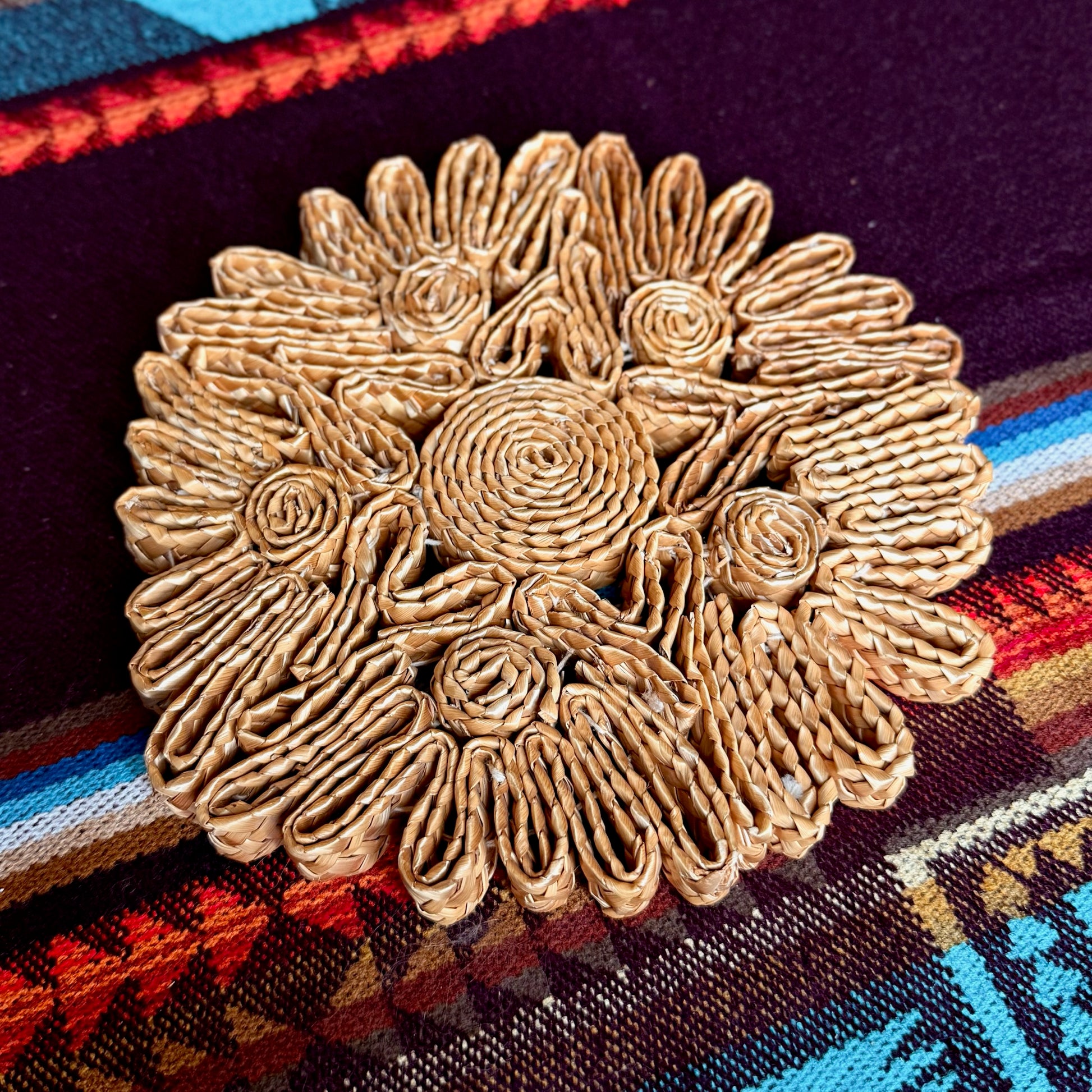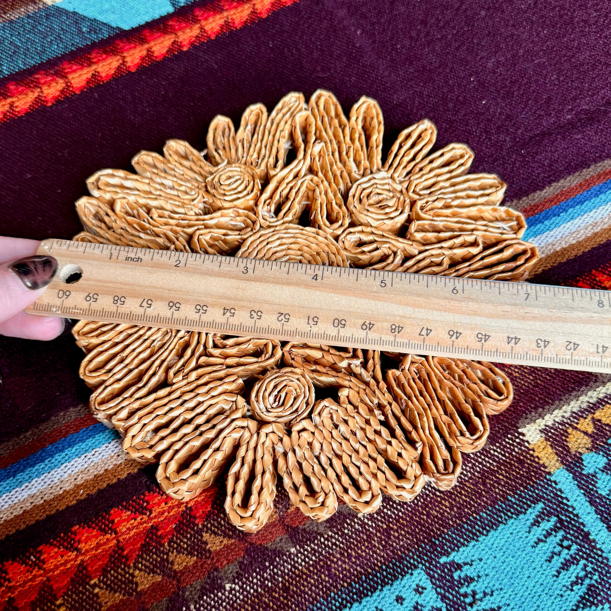 Vintage Floral Woven Raffia Trivet / Place Mat / Wall Hanging. Vintage raffia trivet, in great condition! These are a throwback piece for sure, can be used as a trivet in the kitchen, a decorative wall hanging, or a fancy mat to set things on! Perfect for a mid-century modern, boho, or cottagecore themed home.