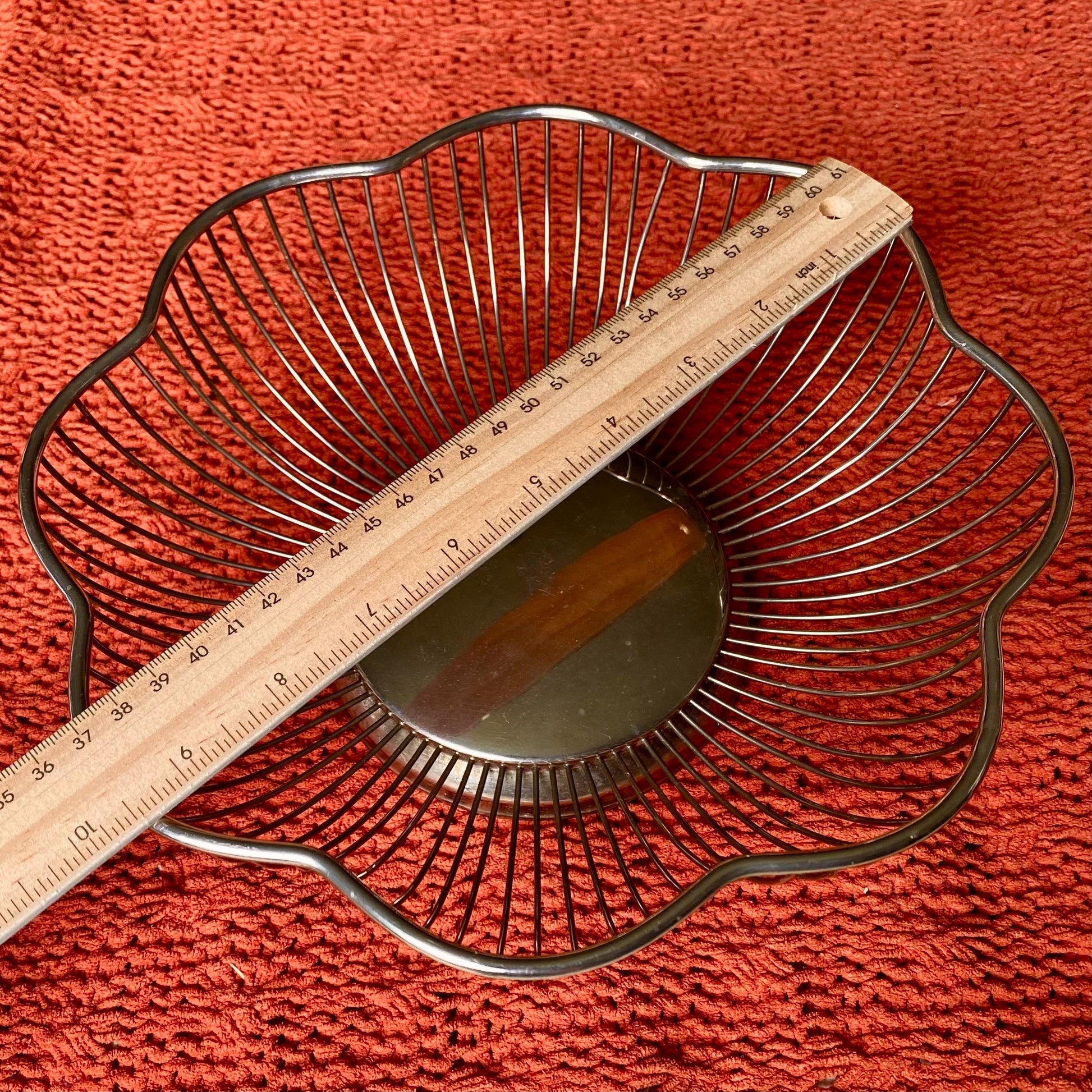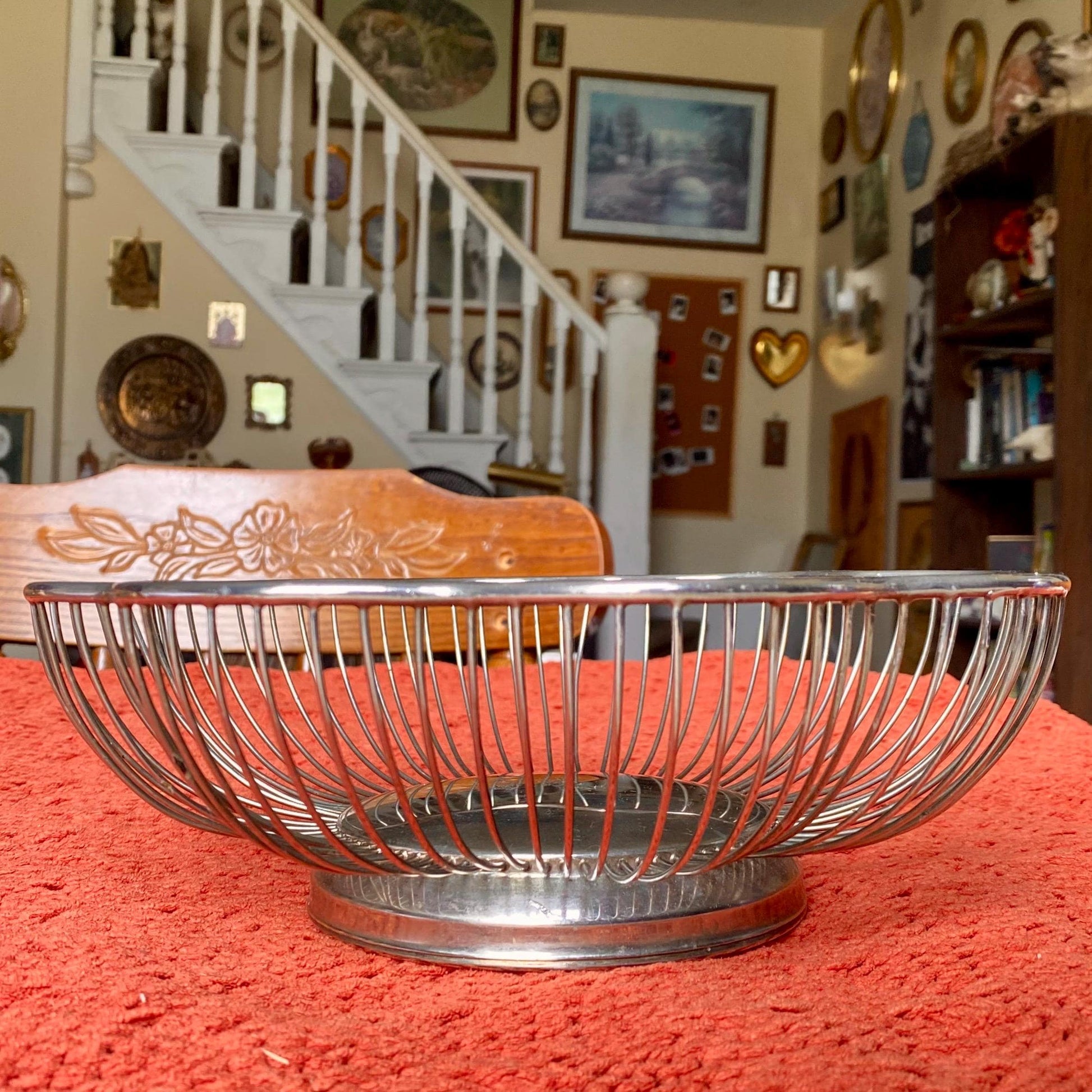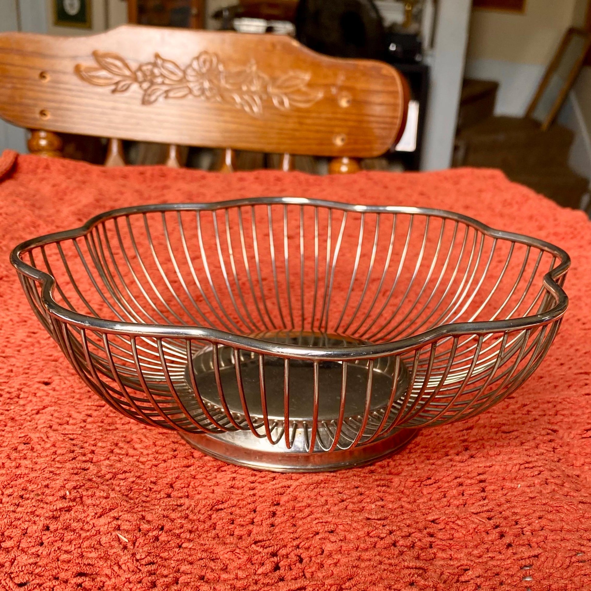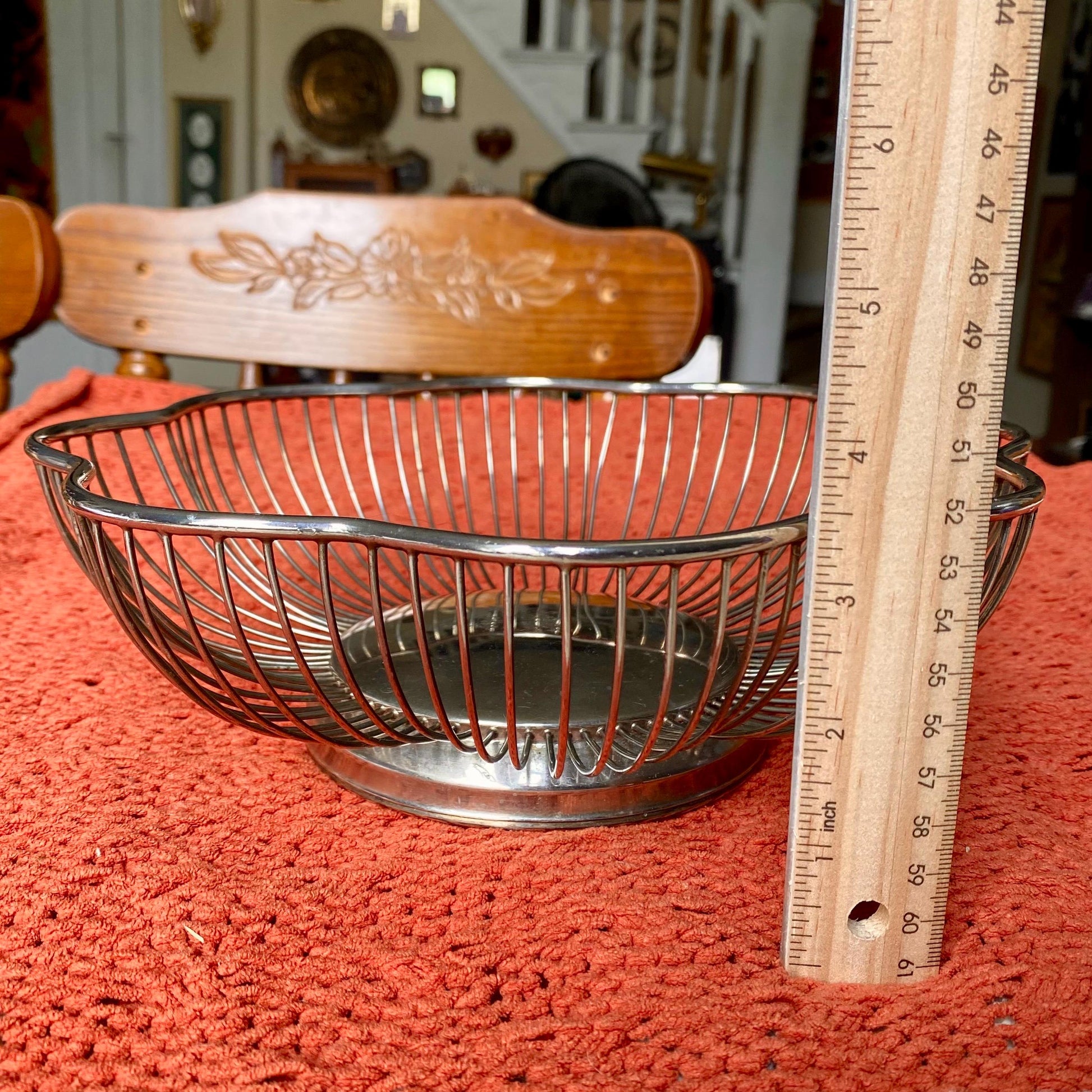 The Vintage International Silver Company Silver Plated Flower Shaped Wire Basket is a charming and elegant piece of decor. Made by the renowned brand International Silver, this silverplated basket features a unique flower-shaped design that adds a touch of mid-century modern style to any space. Its intricate detailing and vintage appeal make it a lovely addition to a collection of home decor items, perfect for adding a touch of nostalgia and sophistication to a room.