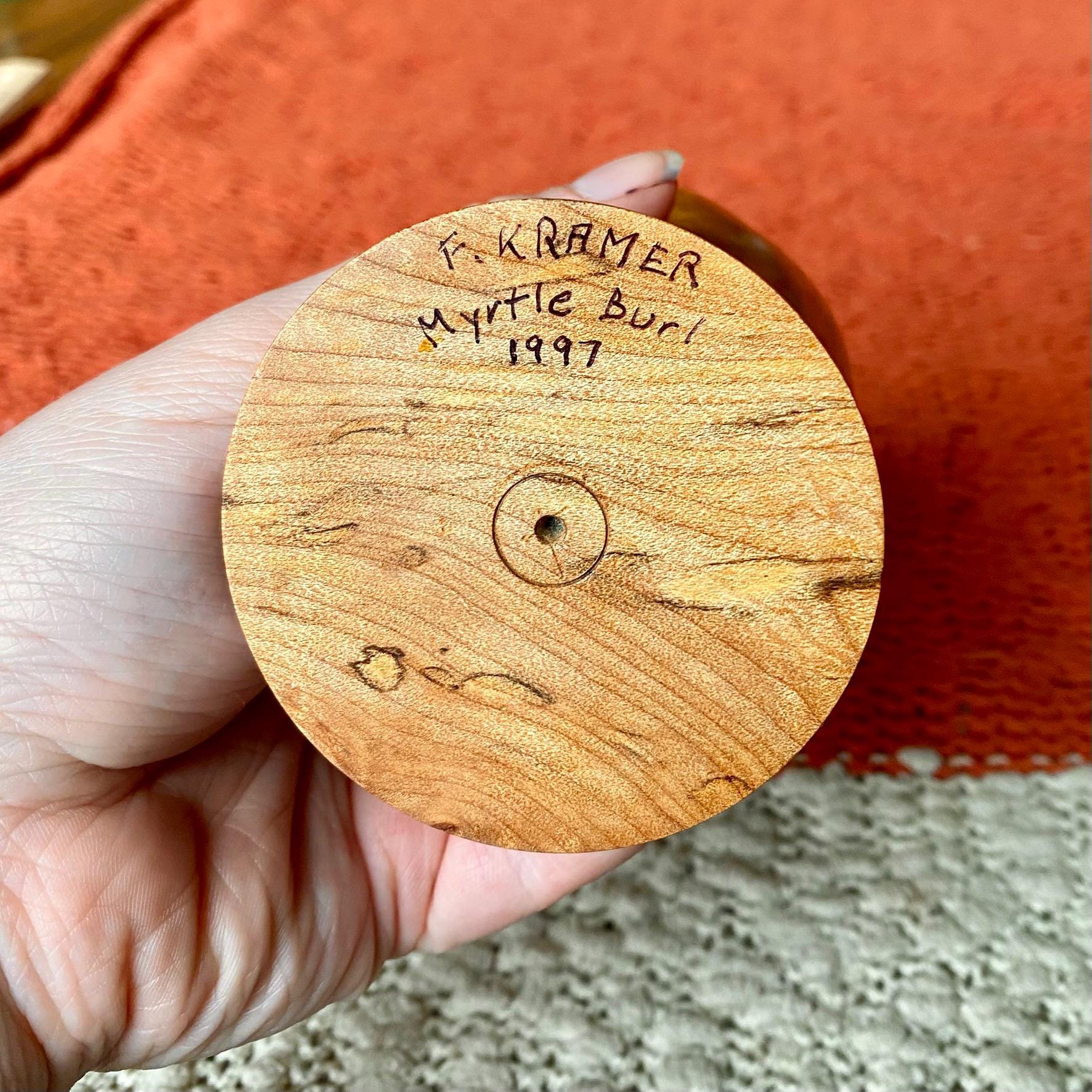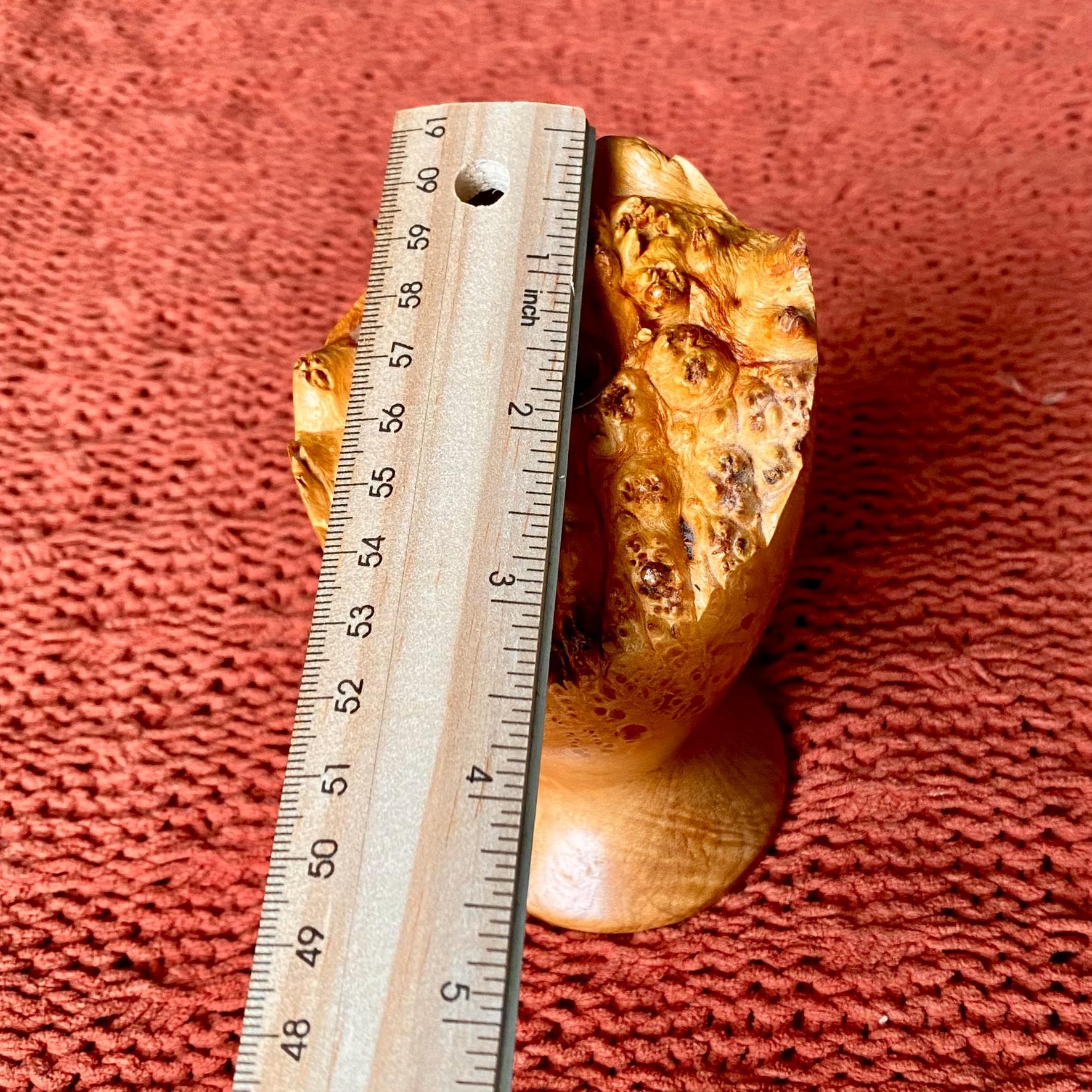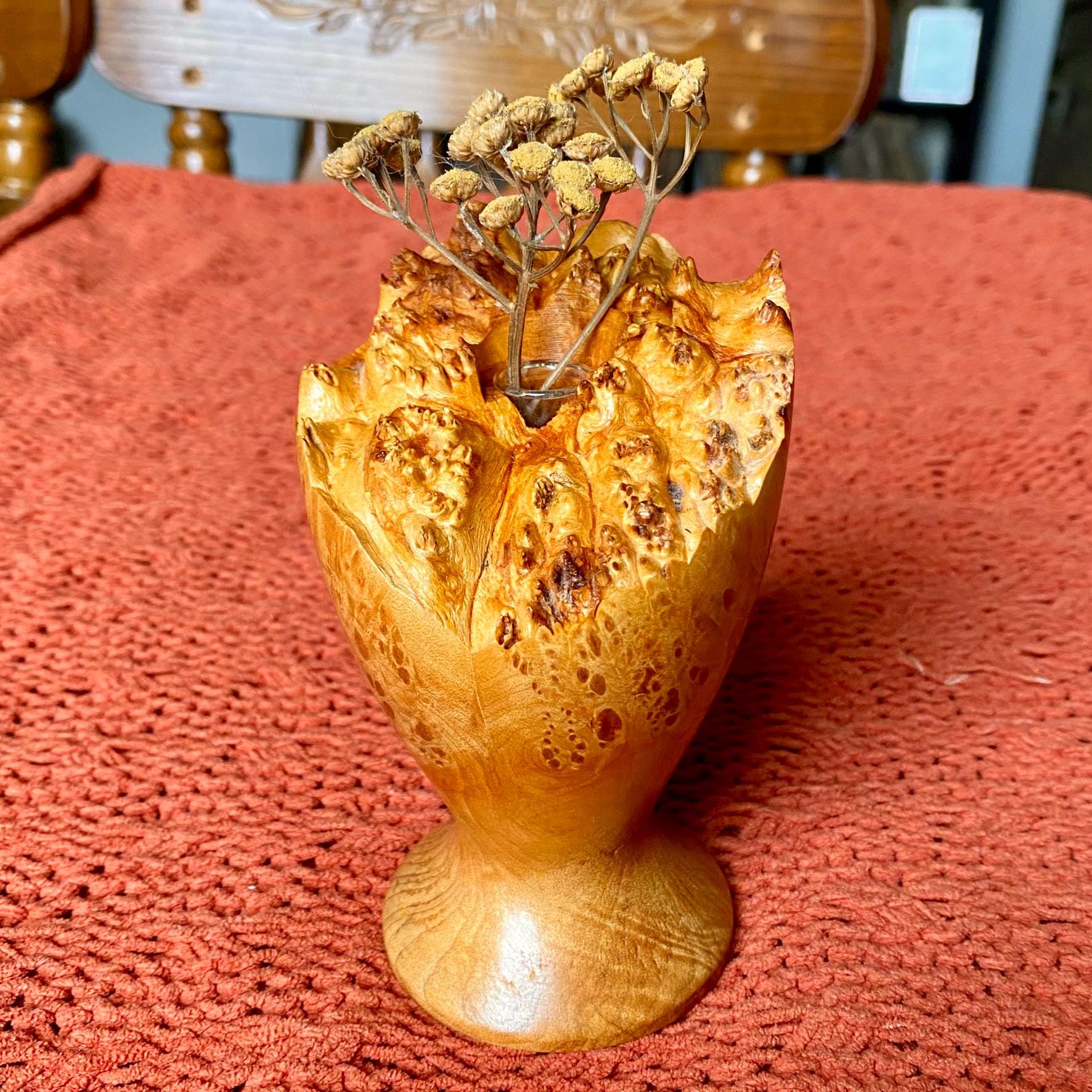 The product is a vintage handmade natural edge burlwood bud vase, featuring a modern design. The vase is crafted with a natural finish, showcasing the unique beauty of the burlwood material. This collectible item adds a touch of retro charm to any decor with its mid-century modern style and rustic appeal. Perfect for displaying a single bloom or as a statement piece in a living space, this bud vase is a one-of-a-kind decorative item.