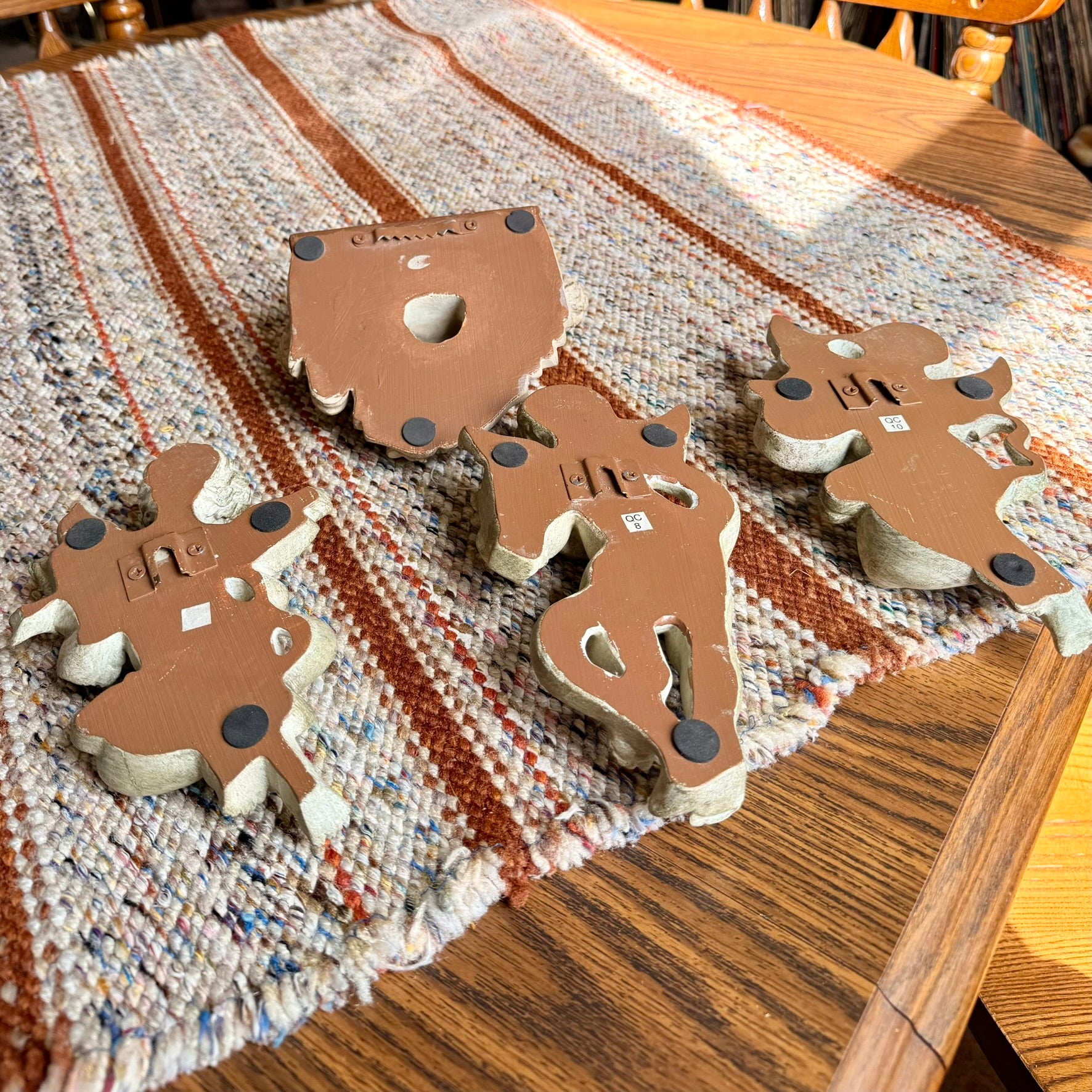 The product is a set of four vintage mid-century modern figurines depicting cherubs or angels. These wall hangings embody a unique and stylish aesthetic from the past, adding a touch of retro charm to any decor. The heavy design suggests quality craftsmanship and attention to detail, making them a standout piece for collectors of decorative items. Perfect for those who appreciate modernist design and unique sculptural pieces.