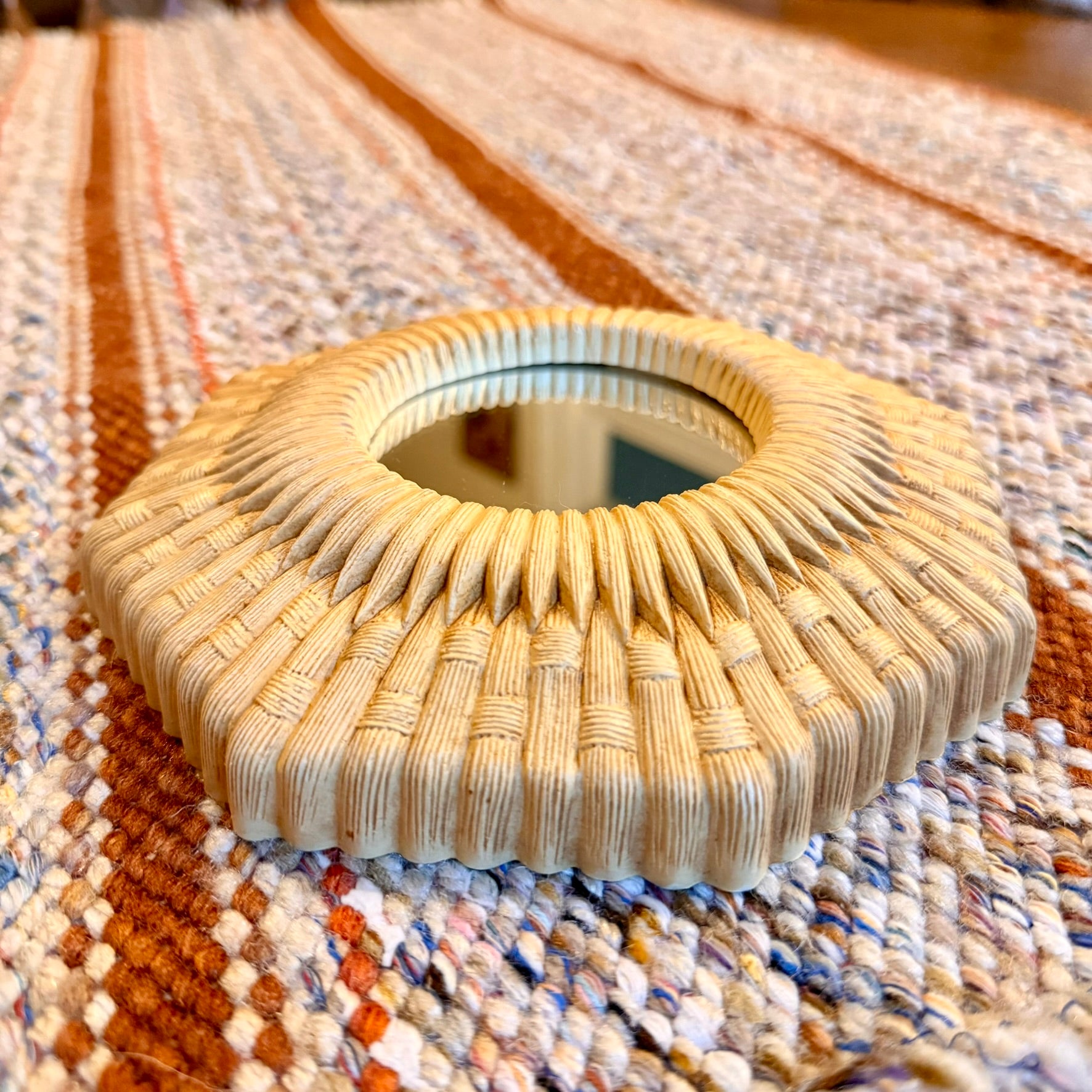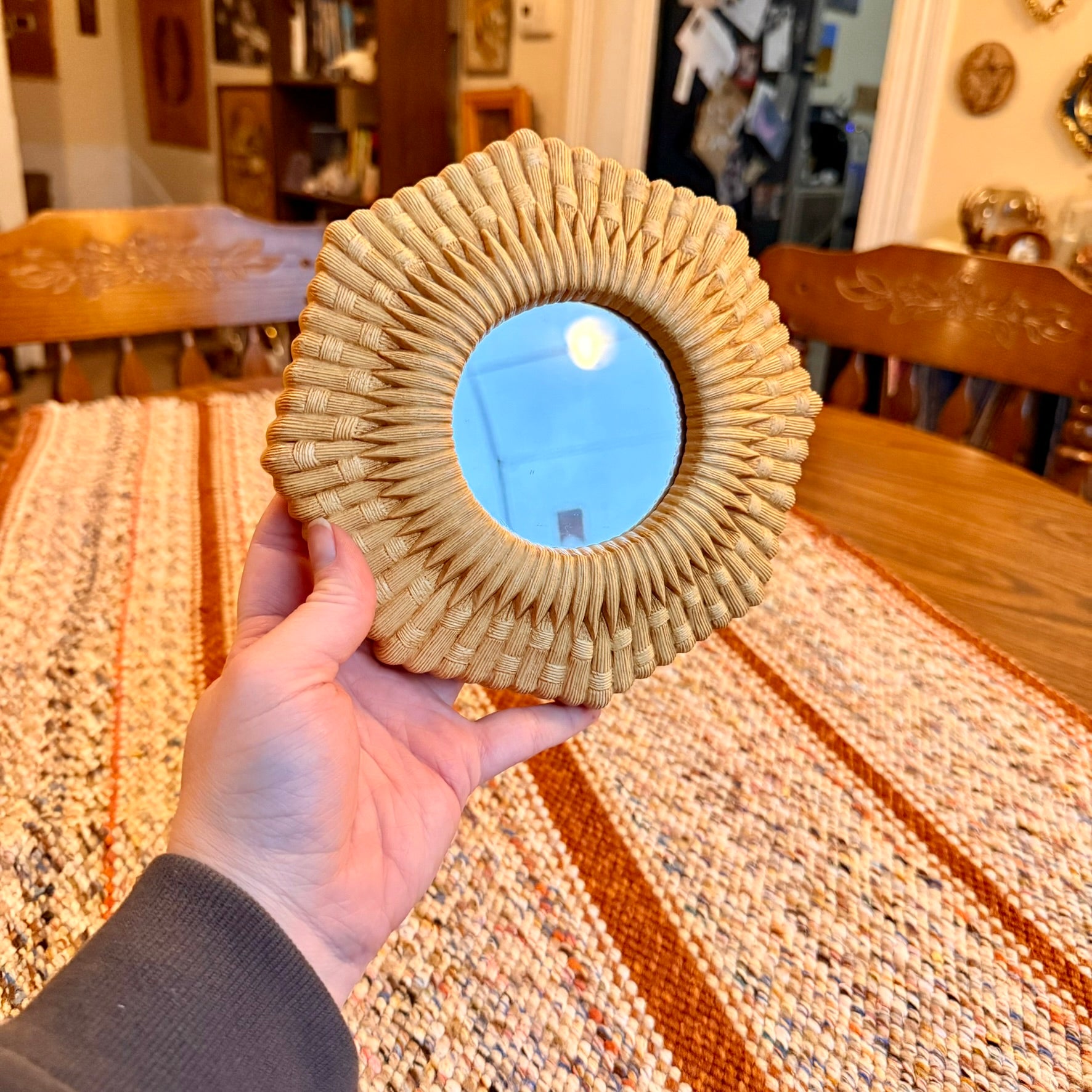 The Vintage Mid-Century Modern Homco Faux Bamboo Wicker Style Mirror is a unique accent mirror featuring a beige frame made of faux bamboo wicker, giving it a retro and vintage look. The octagon shape and compact dimensions of 6.25 inches in height and length make it a versatile piece for home décor. This framed mirror adds a touch of nostalgia and charm to any room, perfect for those who appreciate mid-century modern aesthetics.
