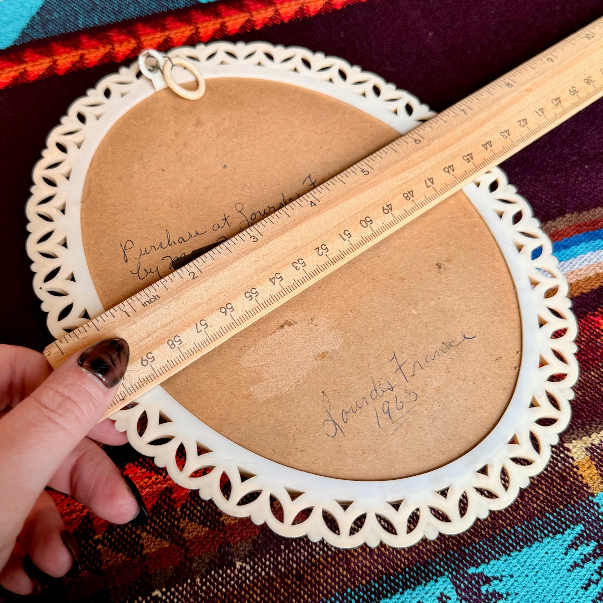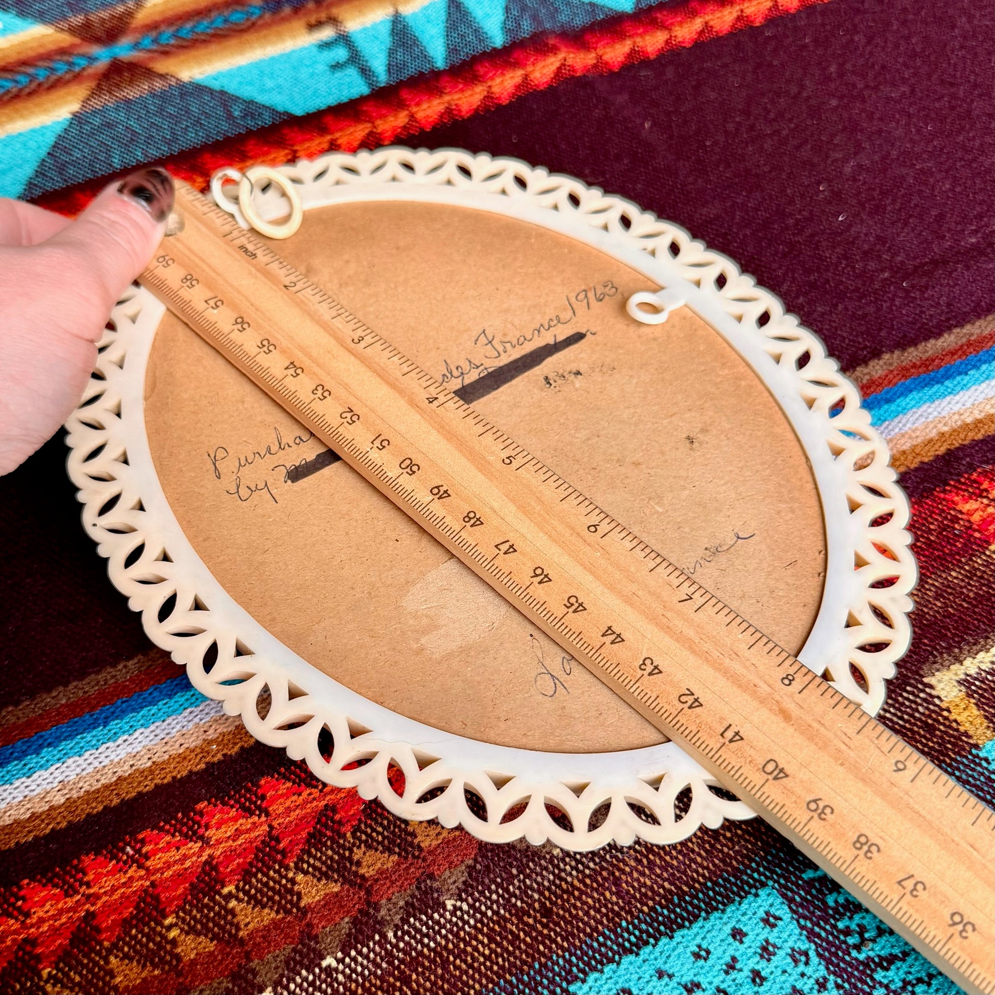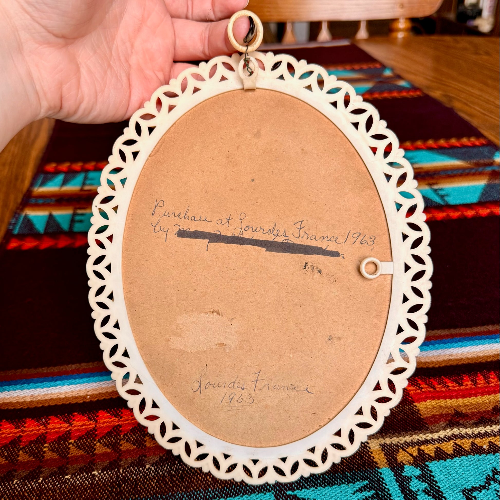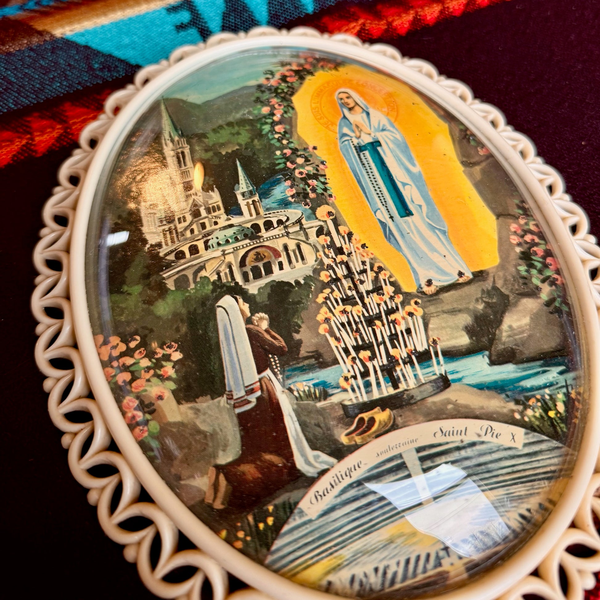 Vintage Our Lady of Lourdes Medallion Print - 1960s Lourdes, France Souvenir . Beautiful vintage souvenir from Lourdes France, purchased in 1963. Vintage religious wall hanging in great condition!
