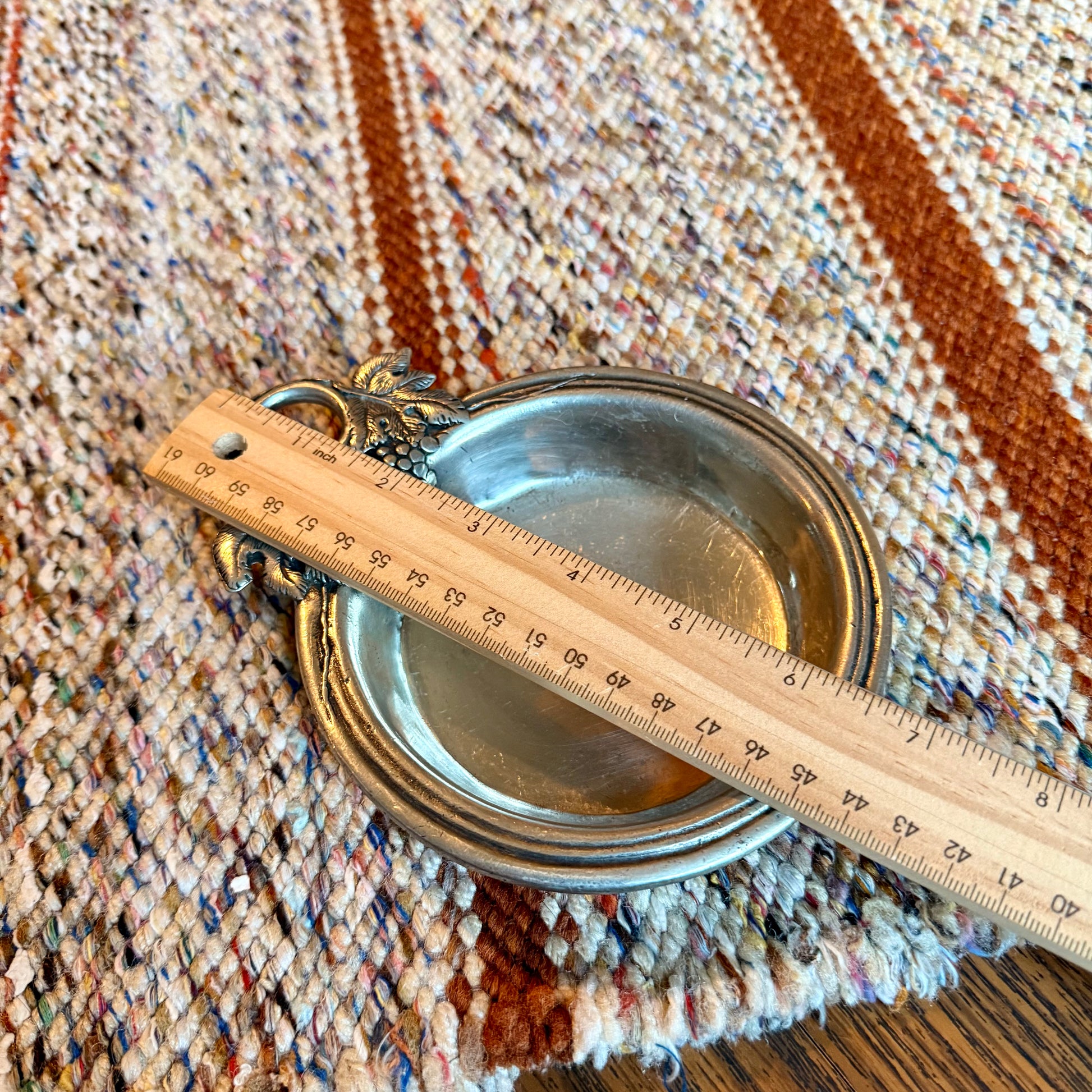 The product is a vintage pewter Williams Sanoma grape wine coaster or ash tray. It is made of pewter and features the branding of William Sanoma. This handmade item would have been used for serving wine or as an ash tray, adding a touch of vintage charm to any table setting.