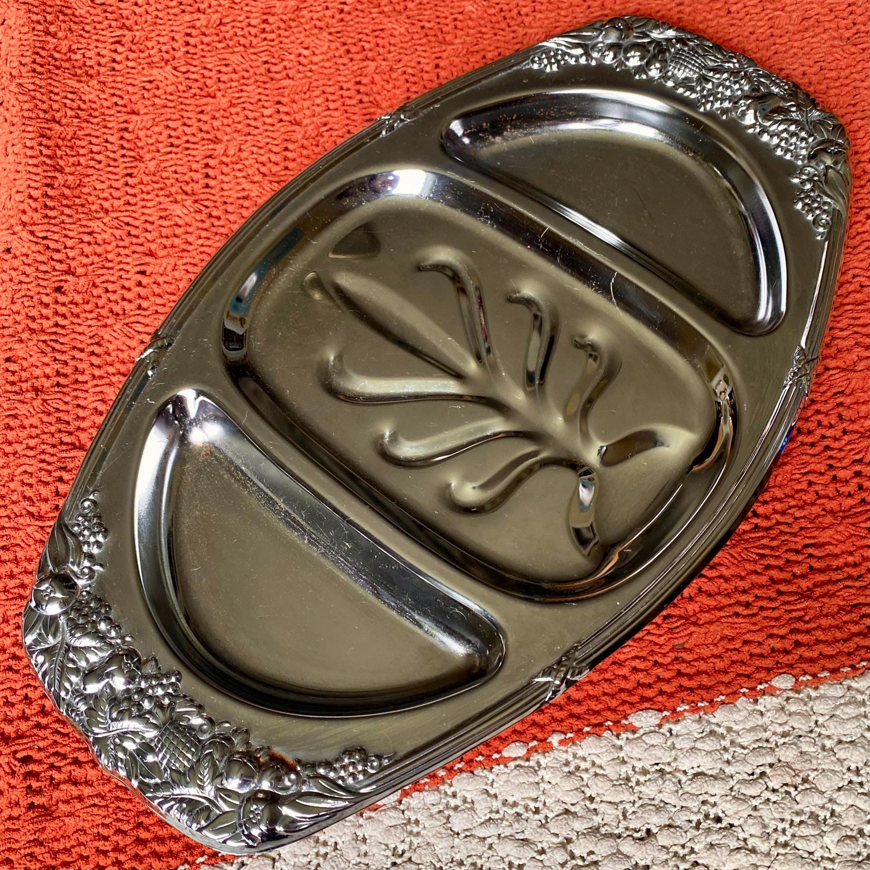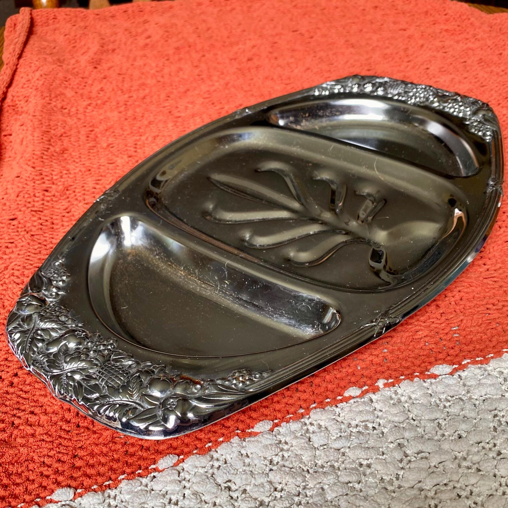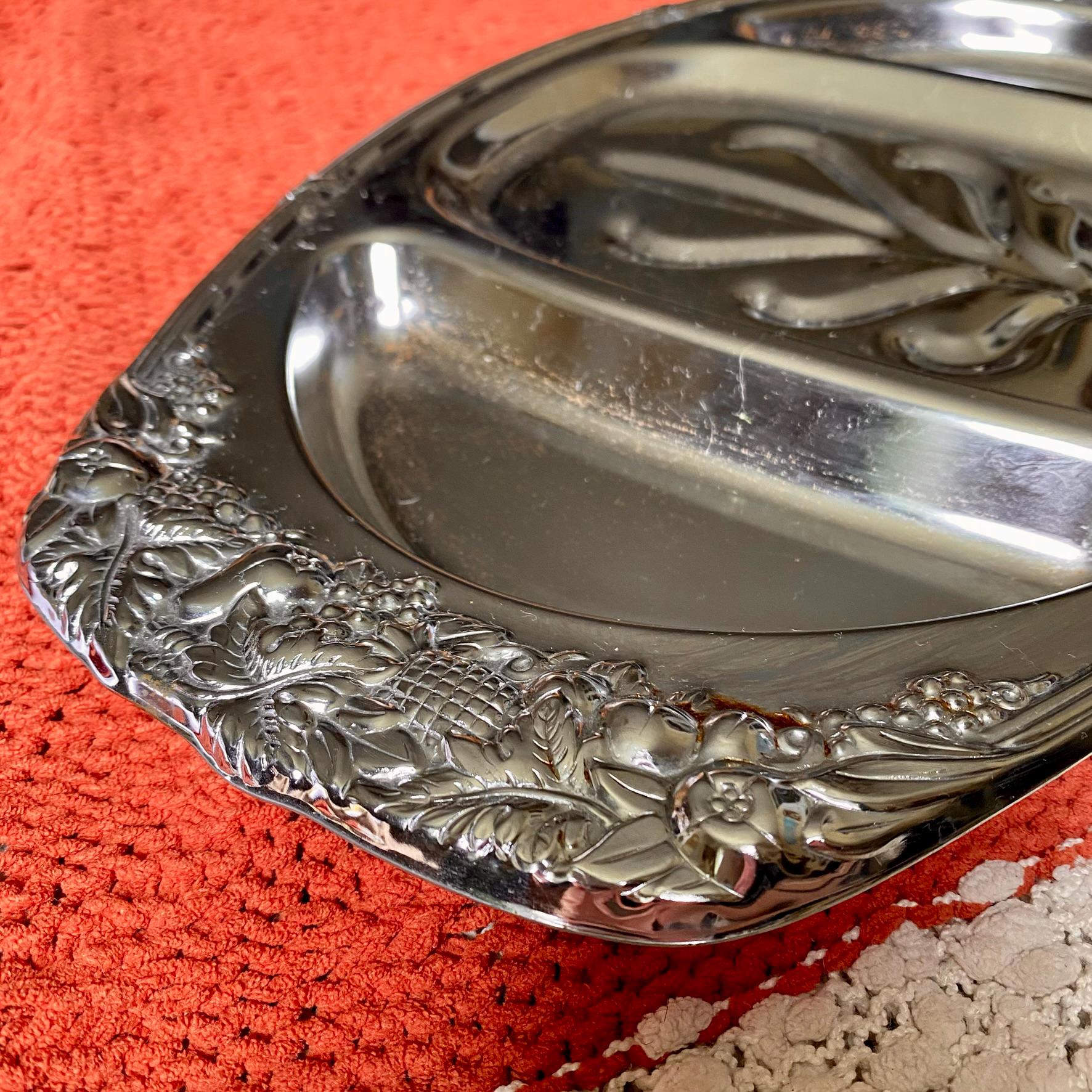 Vintage Shelton-Ware Chrome Serving / Trinket Tray with Three Compartments and Ornate Fruit Design on Edges