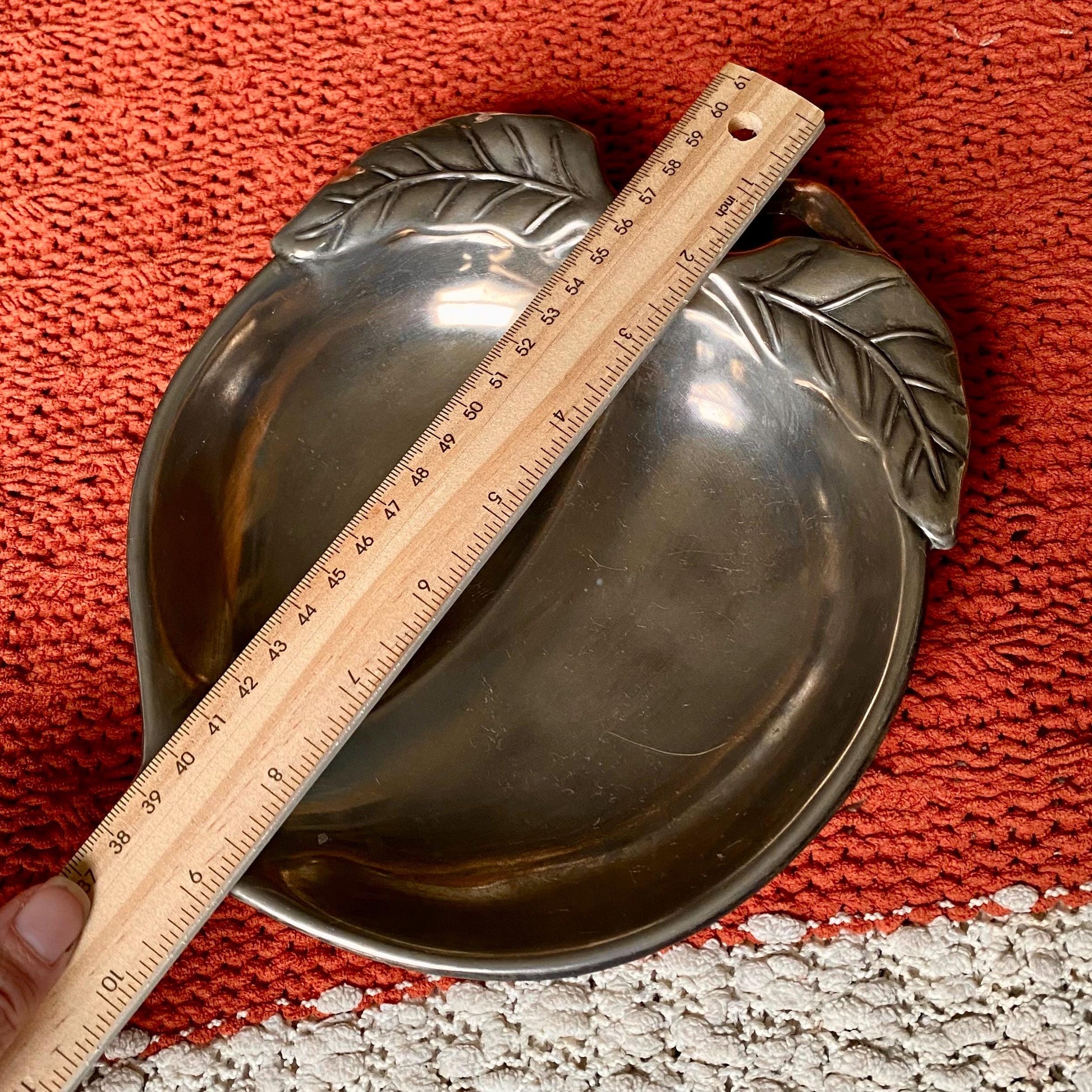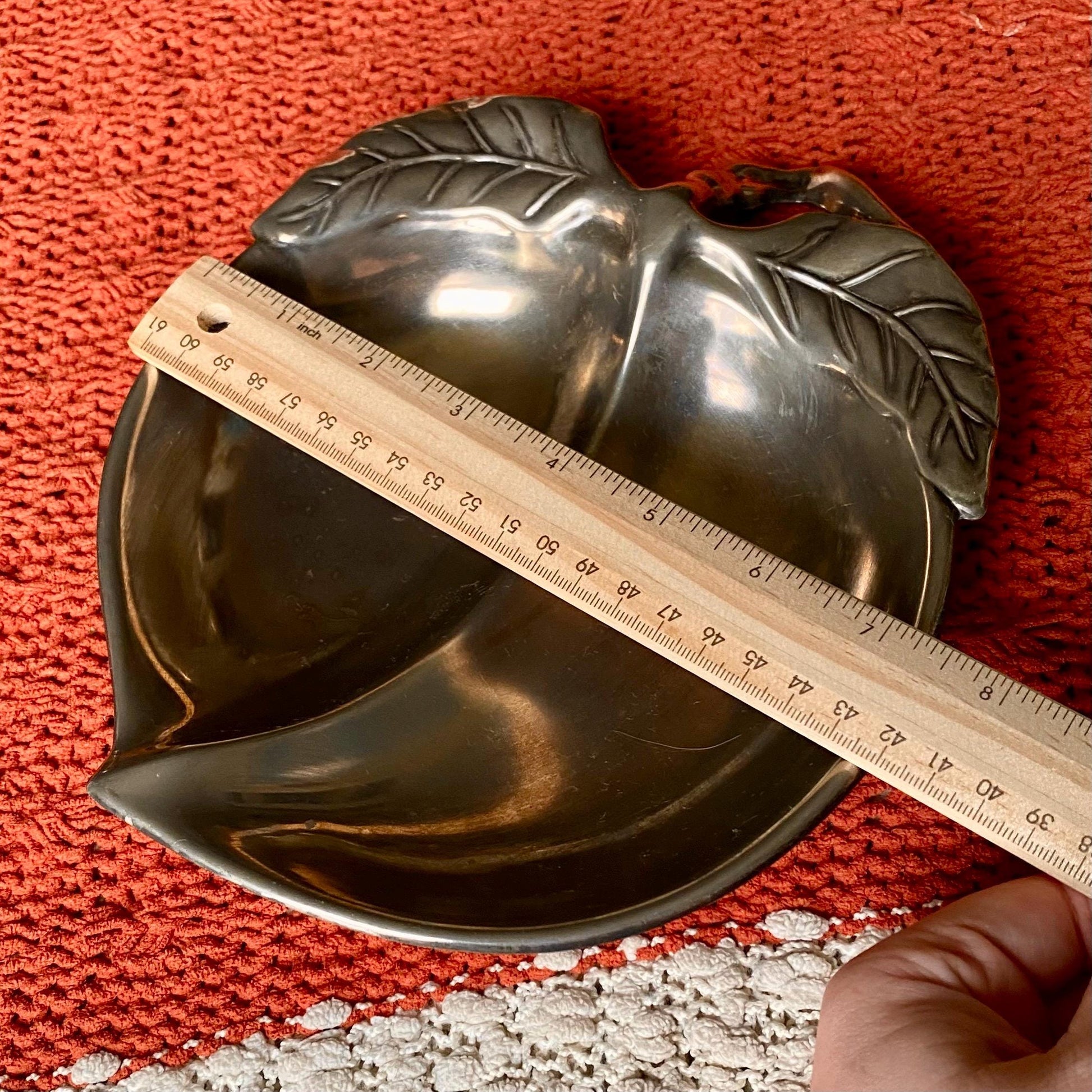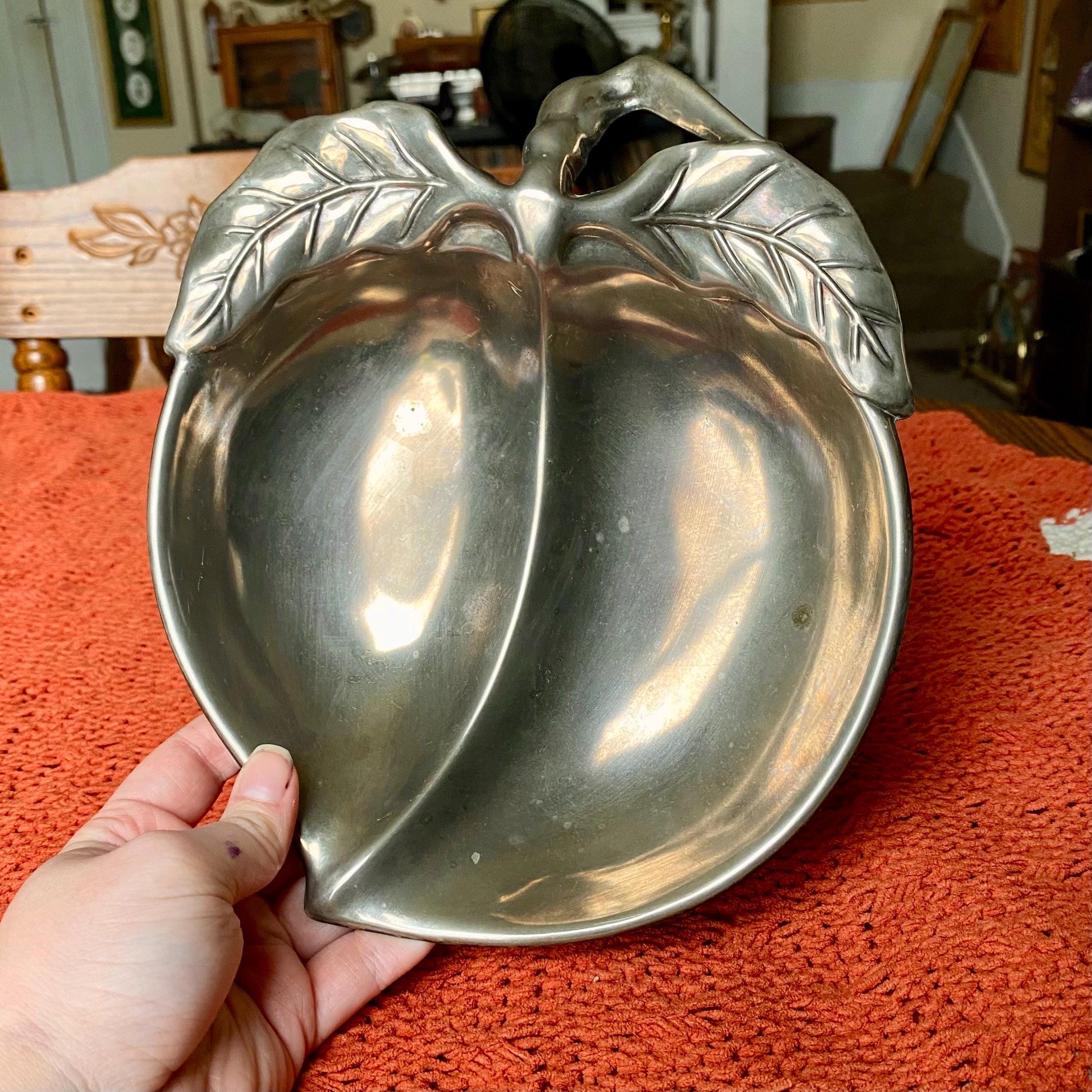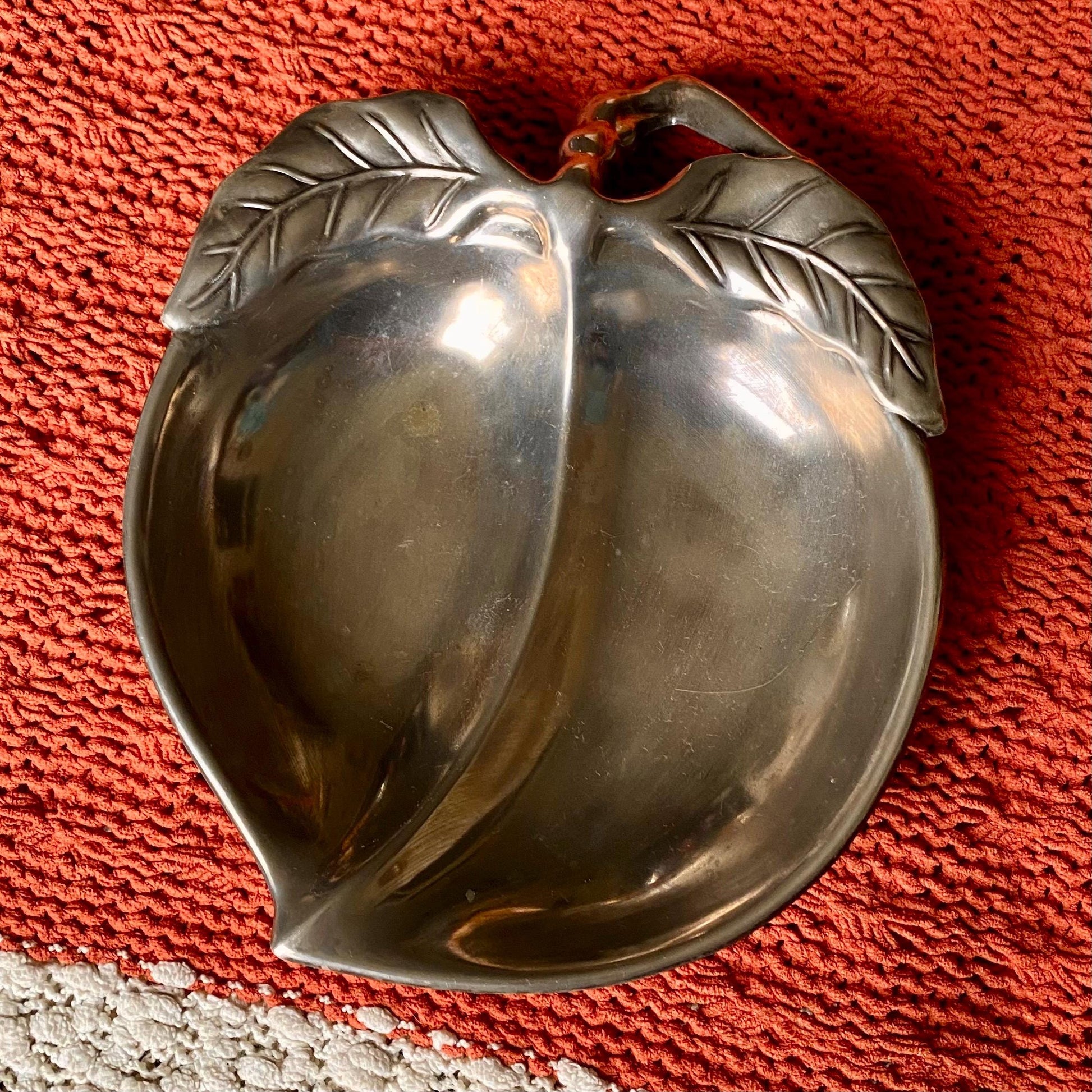 This Vintage Silver Plated Divided Peach Serving Tray combines mid-century modern style with a classic American design. The tray features a unique divided design, perfect for serving up peaches or storing small trinkets. Crafted from silverplate, this piece adds a touch of nostalgia and elegance to any room. Whether used for entertaining guests or as a decorative display, this vintage tray is sure to impress with its timeless charm and retro aesthetic.