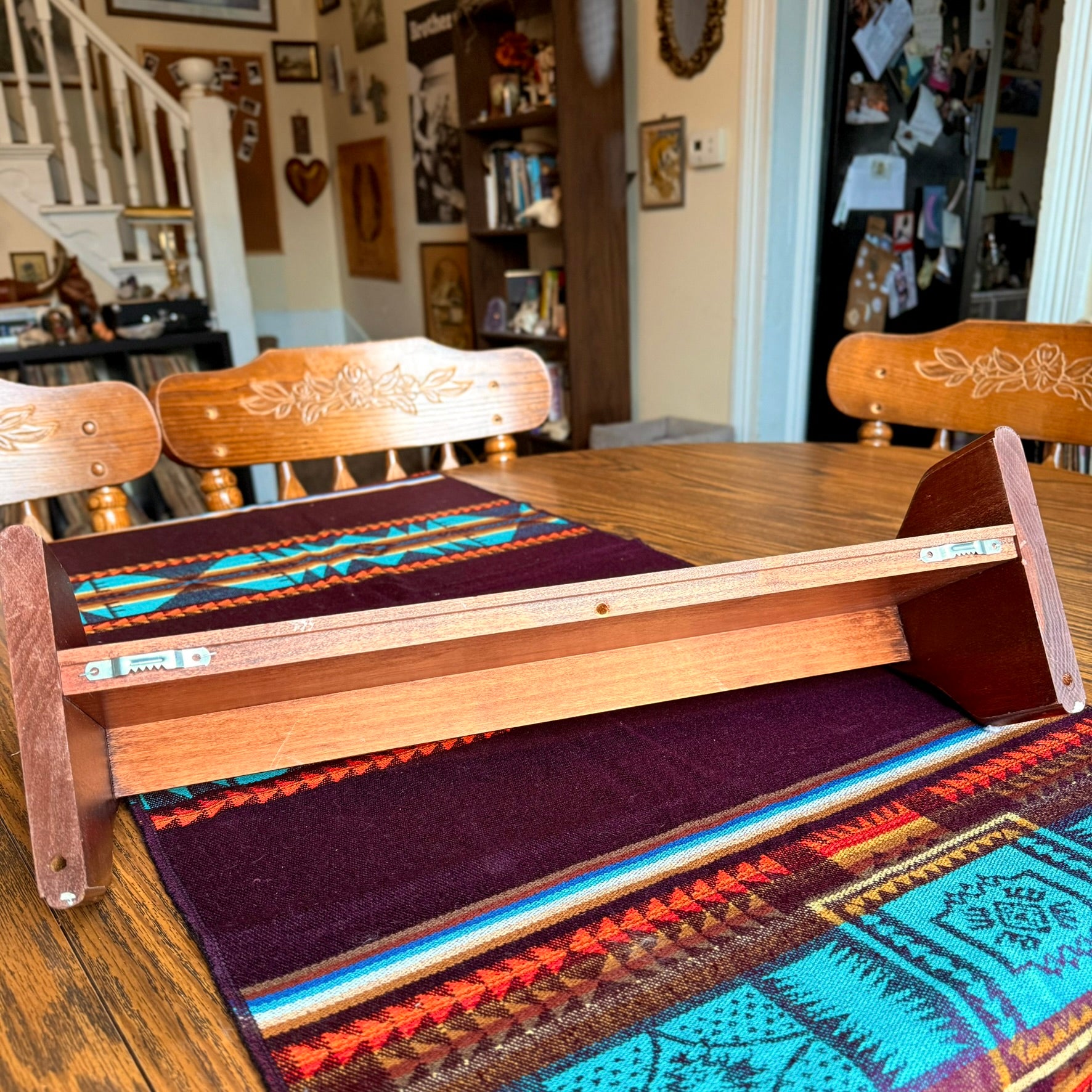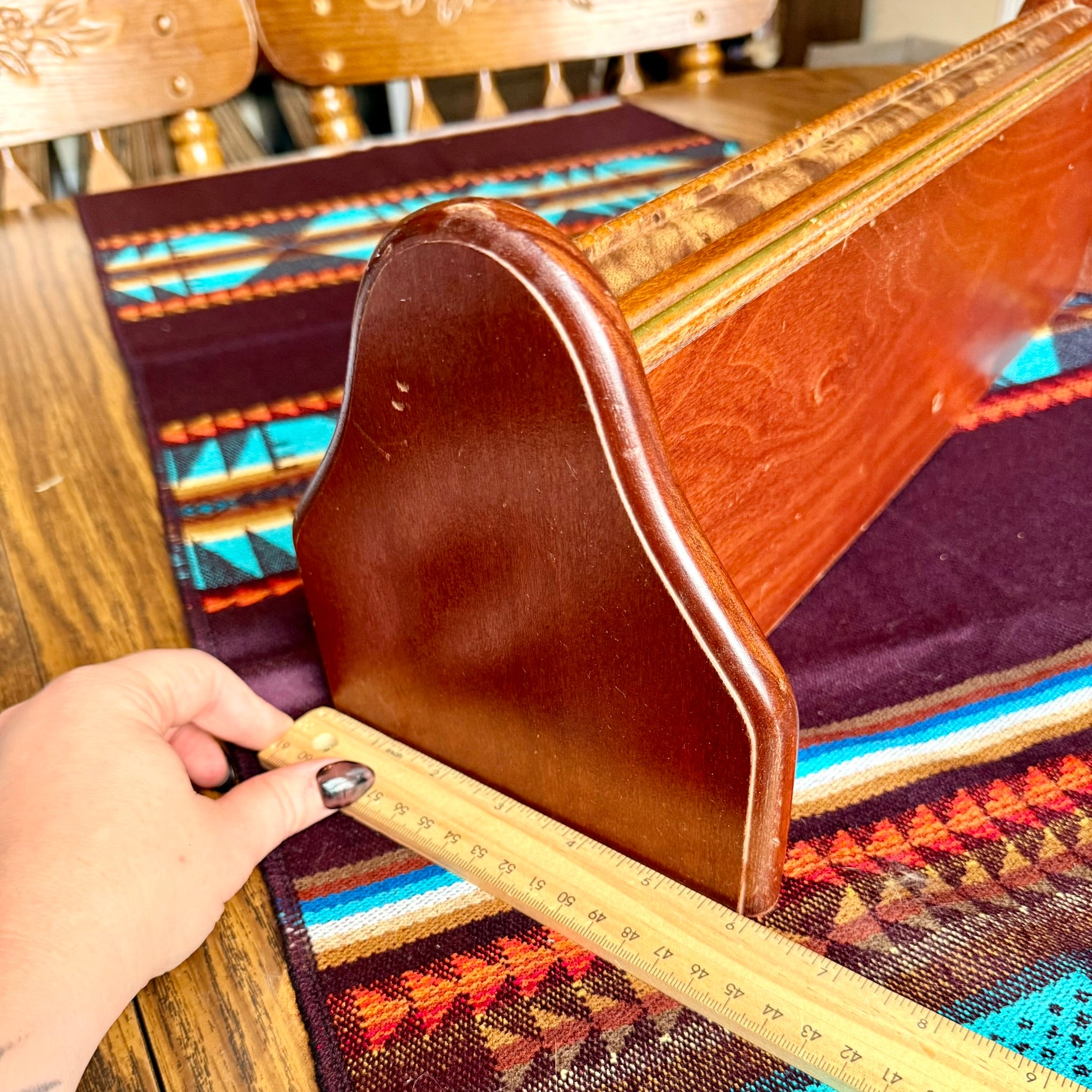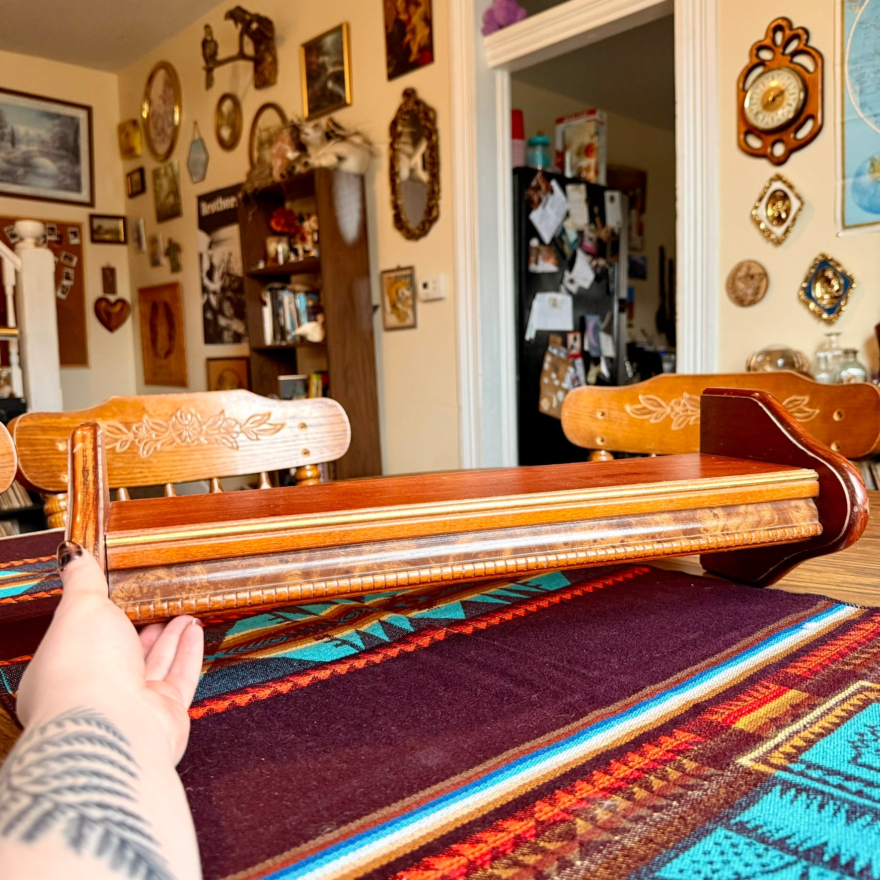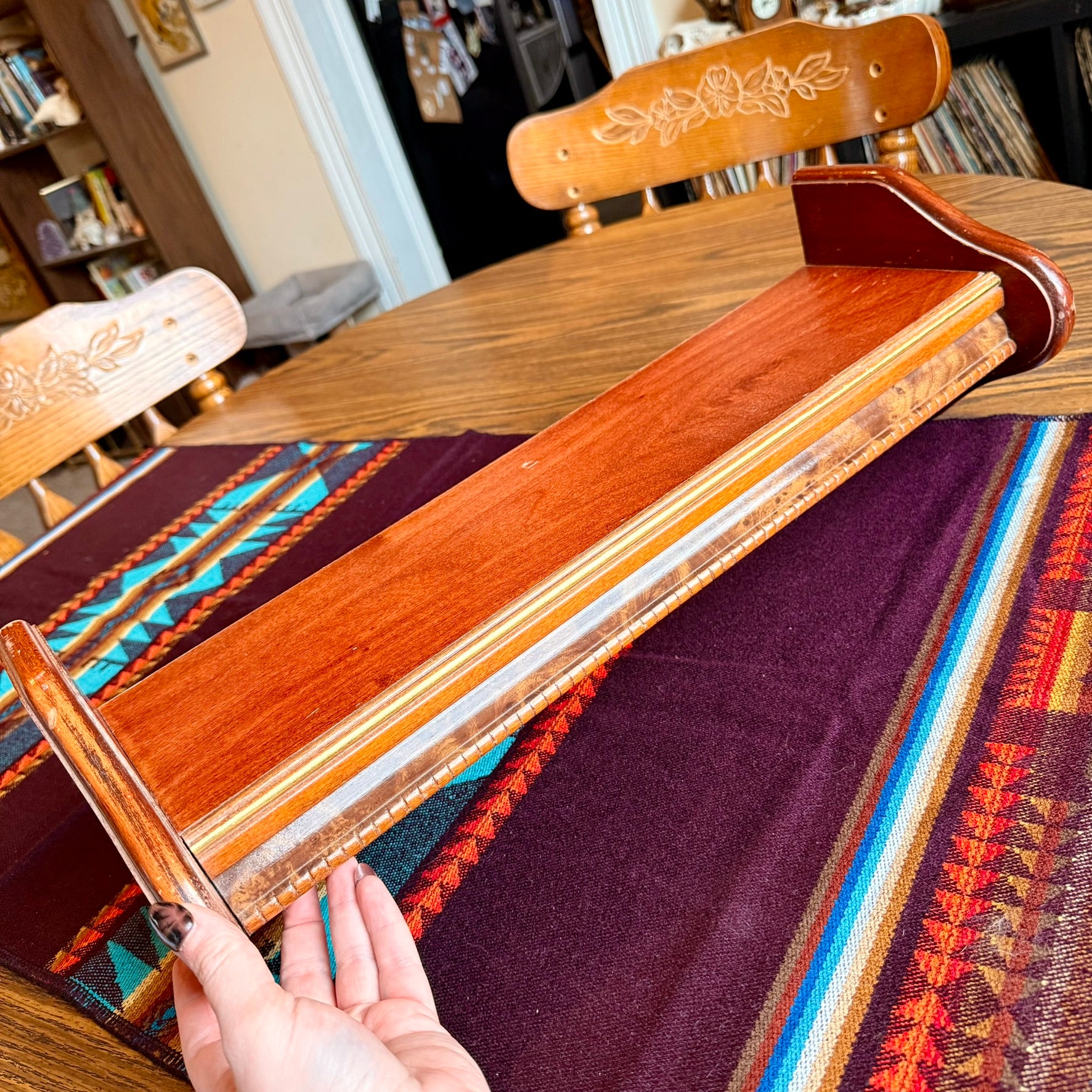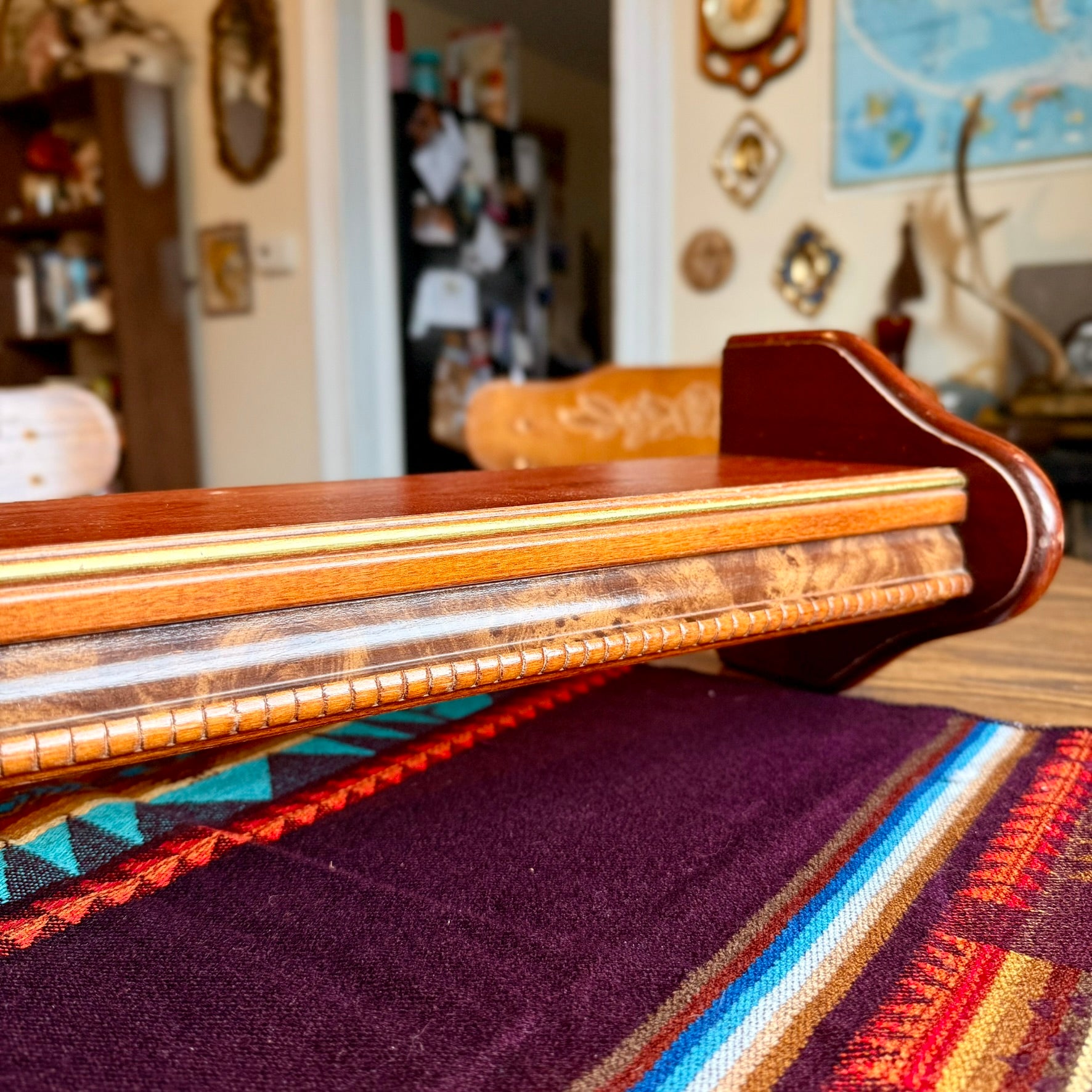 Vintage Solid Wood Shelf with Faux Gold and Burlwood Accents. Beautiful mid-century modern style solid wood hanging wall shelf. In great condition, this piece has lots of character, perfect for a cottagecore or mcm style home.