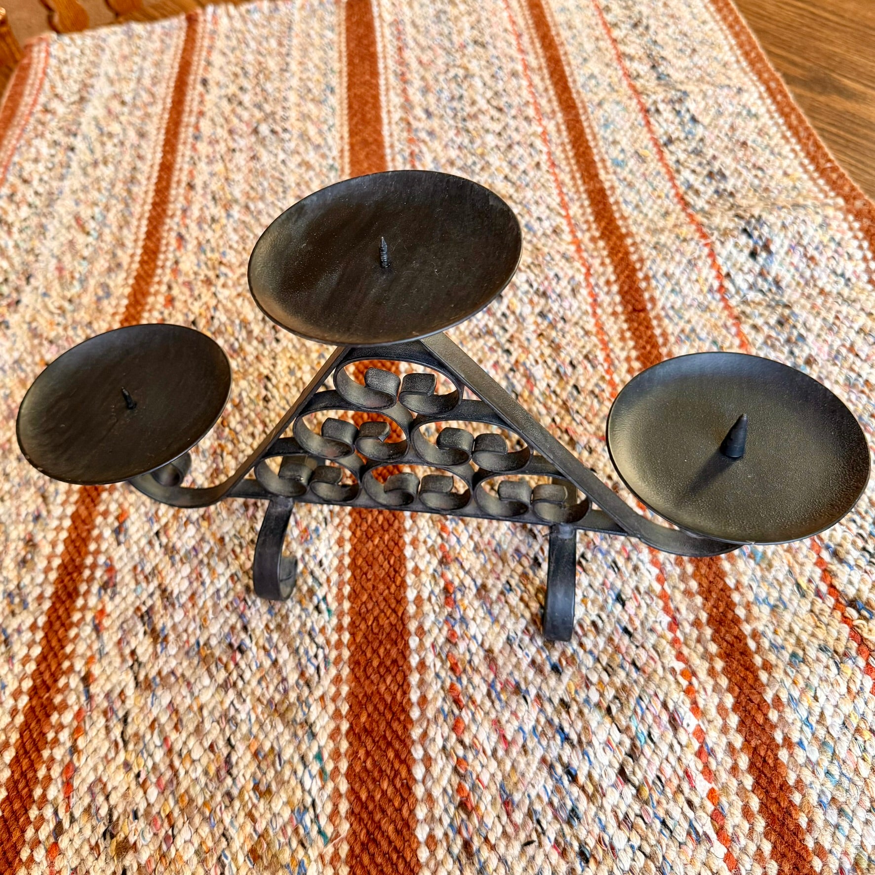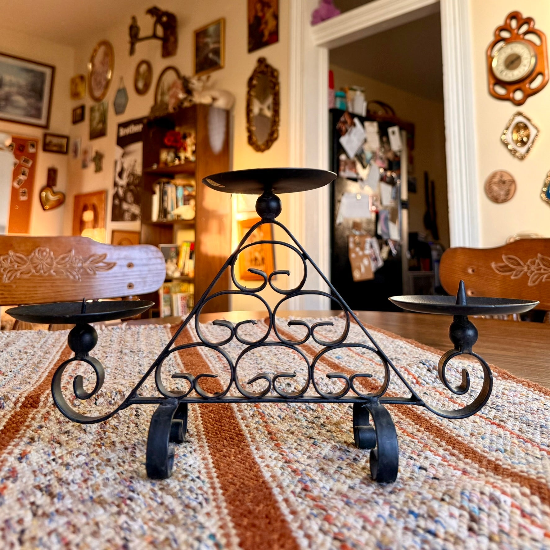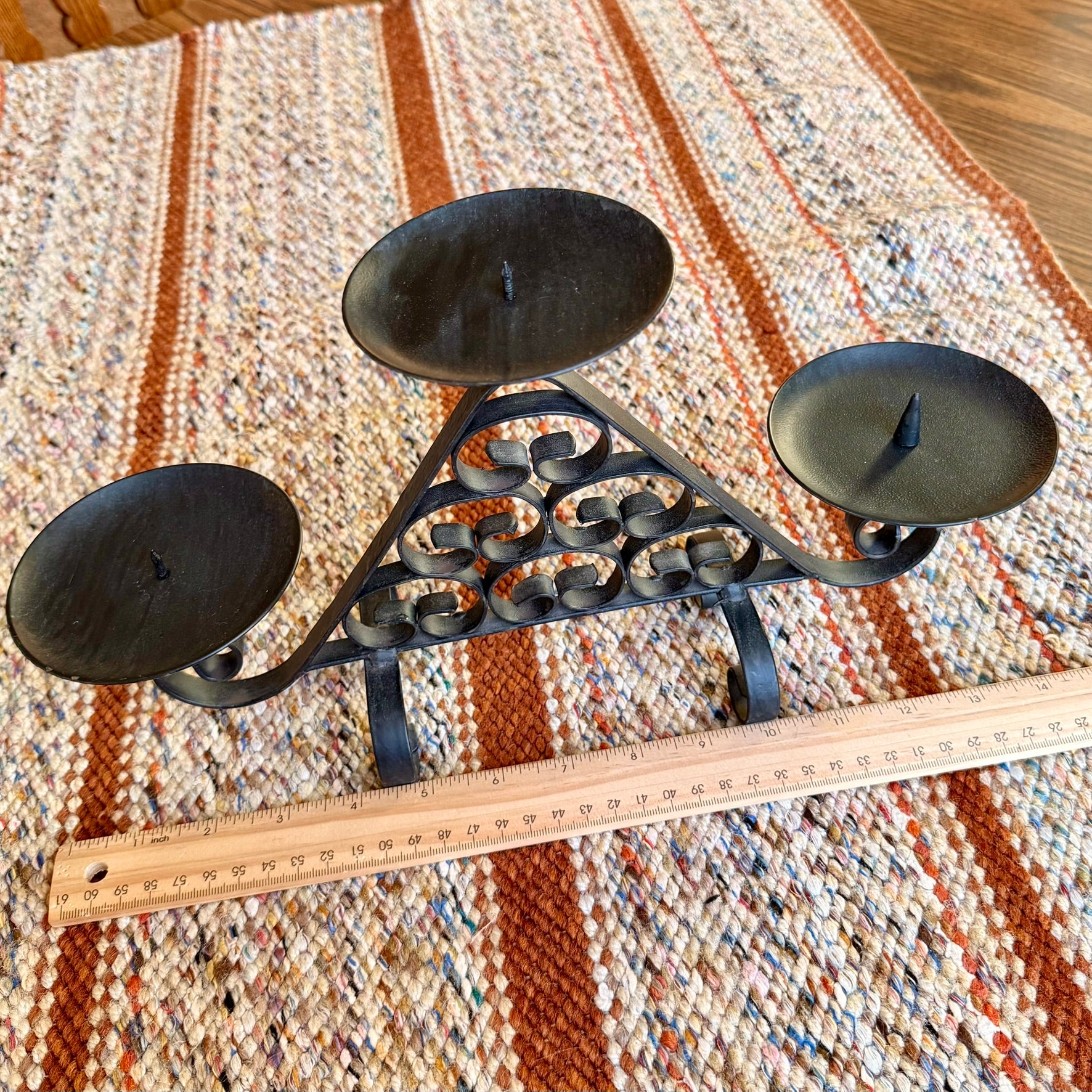 Vintage Wrought Iron Spanish Scroll Style 2 Tier 3 Pillar Candelabra. Beautiful heavy iron candelabra. Can fit 3 pillar candles, suitable for spanish, whimsygoth, gothic vampy style decor.